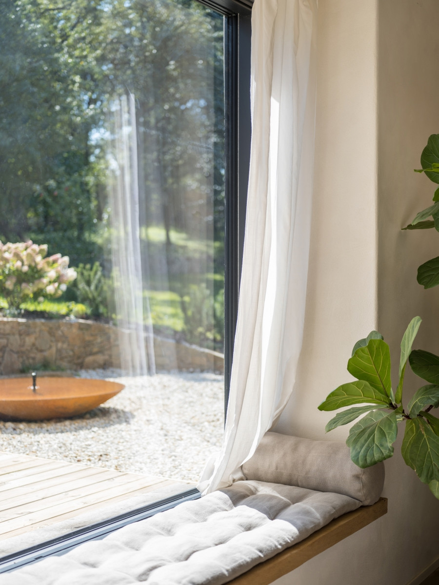 Za „štítovým“ plotem se charakter stavení mění. Do původních zdí vstupují velké okenní otvory. Ty intenzivně propojují interiér s exteriérem a prozrazují současnost návrhu. Velkoformátová posuvná hliníková okna zpřístupňují zahradu z obývacího pokoje a na fasádách tvoří hezkou kombinaci společně s repasovanými dřevěnými špaletovými okny, které byly použity do původních štítových okenních otvorů.