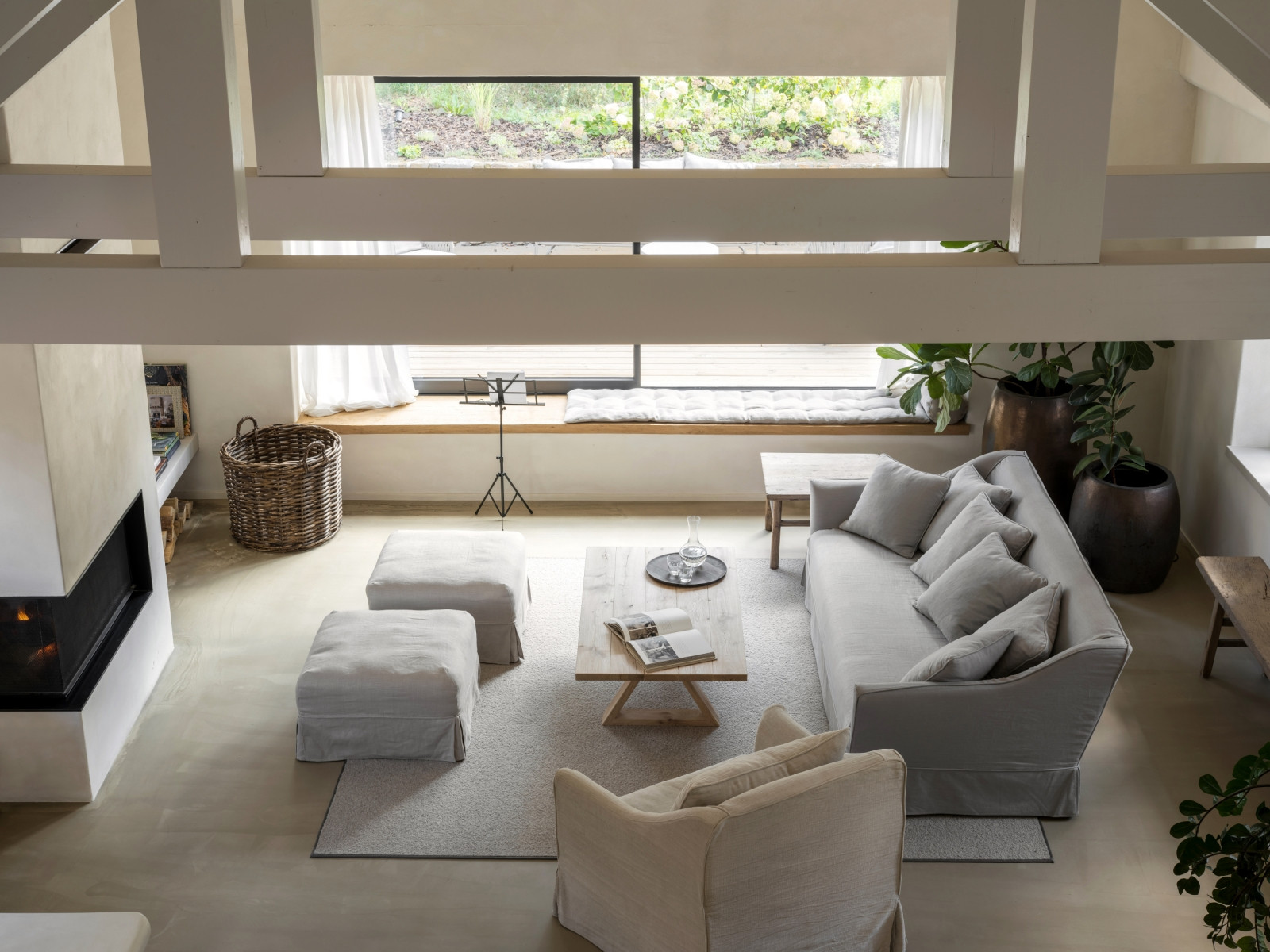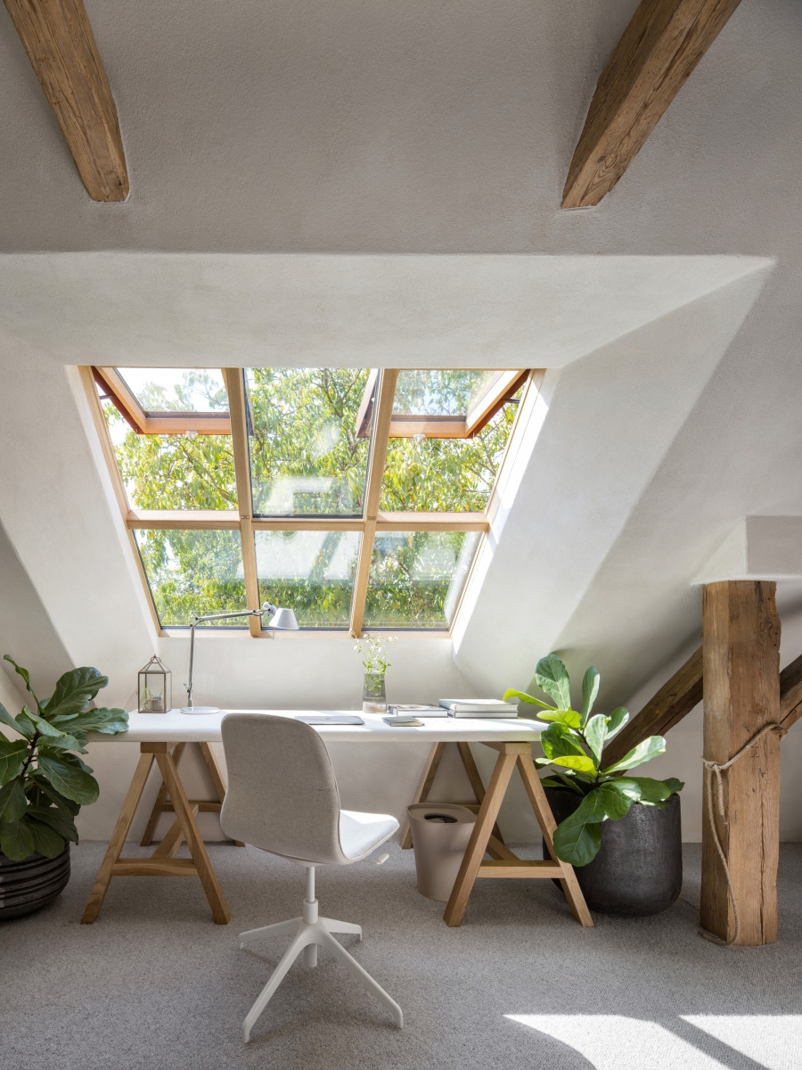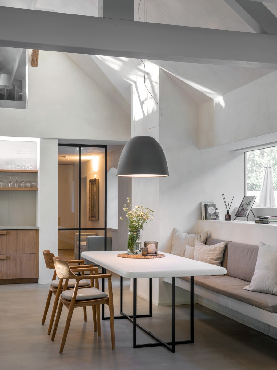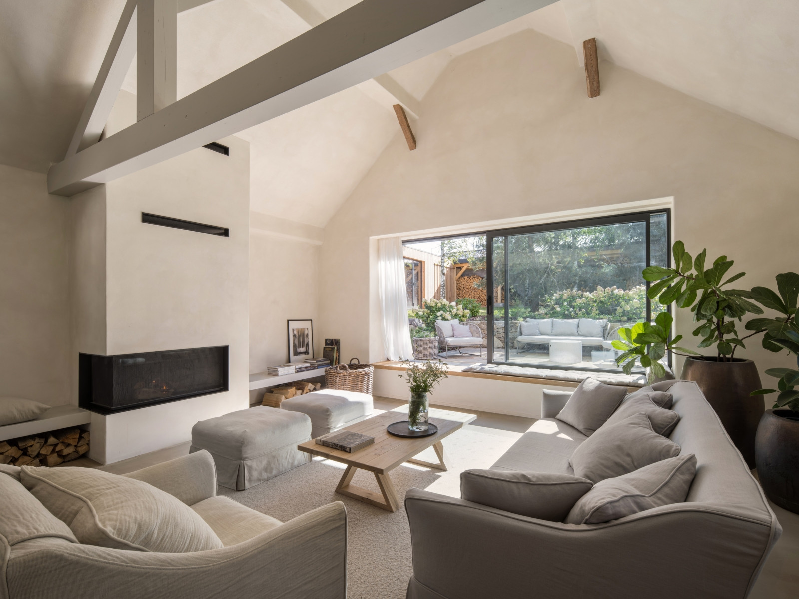 V interiéru je nejvíc patrné propojení původní vrstvy a moderního života. Dřevěné trámy prochází interiérem a připomínají stáří objektu. Čistě jako uvnitř starého stavení si ale nepřipadáte. Toho autoři docílili především jemnou paletou neutrálních odstínů, zvolením přírodních materiálů, výběrem moderního nábytku a také skleněnými prvky, jako je např. prosklené zábradlí nad obývacím pokojem. Ale také velkou mírou prosklení. Celý interiér zútulňují nízké okenní parapety, které fungují jako pobytová okna a zároveň jako jeden velký schod do zahrady.