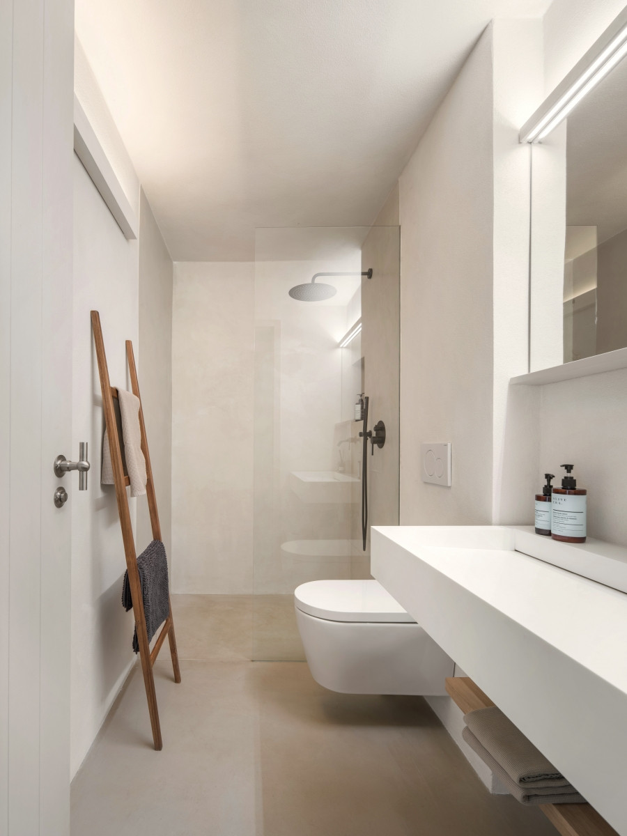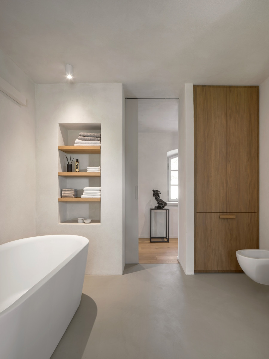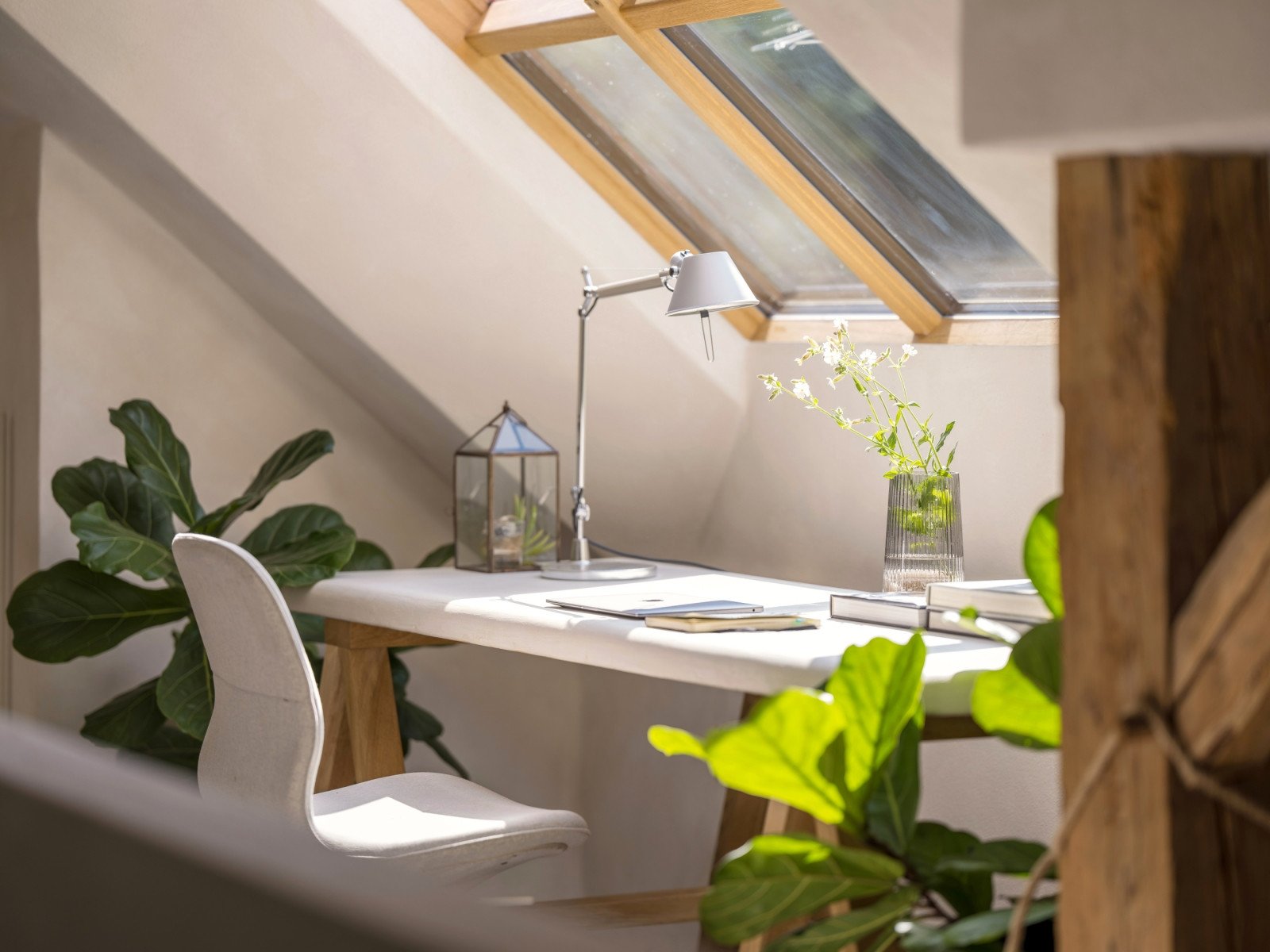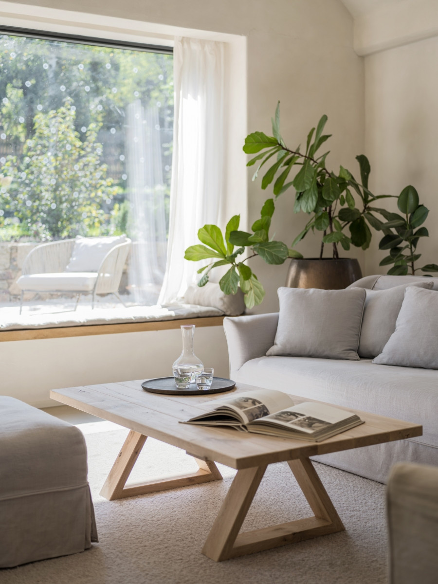 V interiéru je nejvíc patrné propojení původní vrstvy a moderního života. Dřevěné trámy prochází interiérem a připomínají stáří objektu. Čistě jako uvnitř starého stavení si ale nepřipadáte. Toho autoři docílili především jemnou paletou neutrálních odstínů, zvolením přírodních materiálů, výběrem moderního nábytku a také skleněnými prvky, jako je např. prosklené zábradlí nad obývacím pokojem. Ale také velkou mírou prosklení. Celý interiér zútulňují nízké okenní parapety, které fungují jako pobytová okna a zároveň jako jeden velký schod do zahrady.
