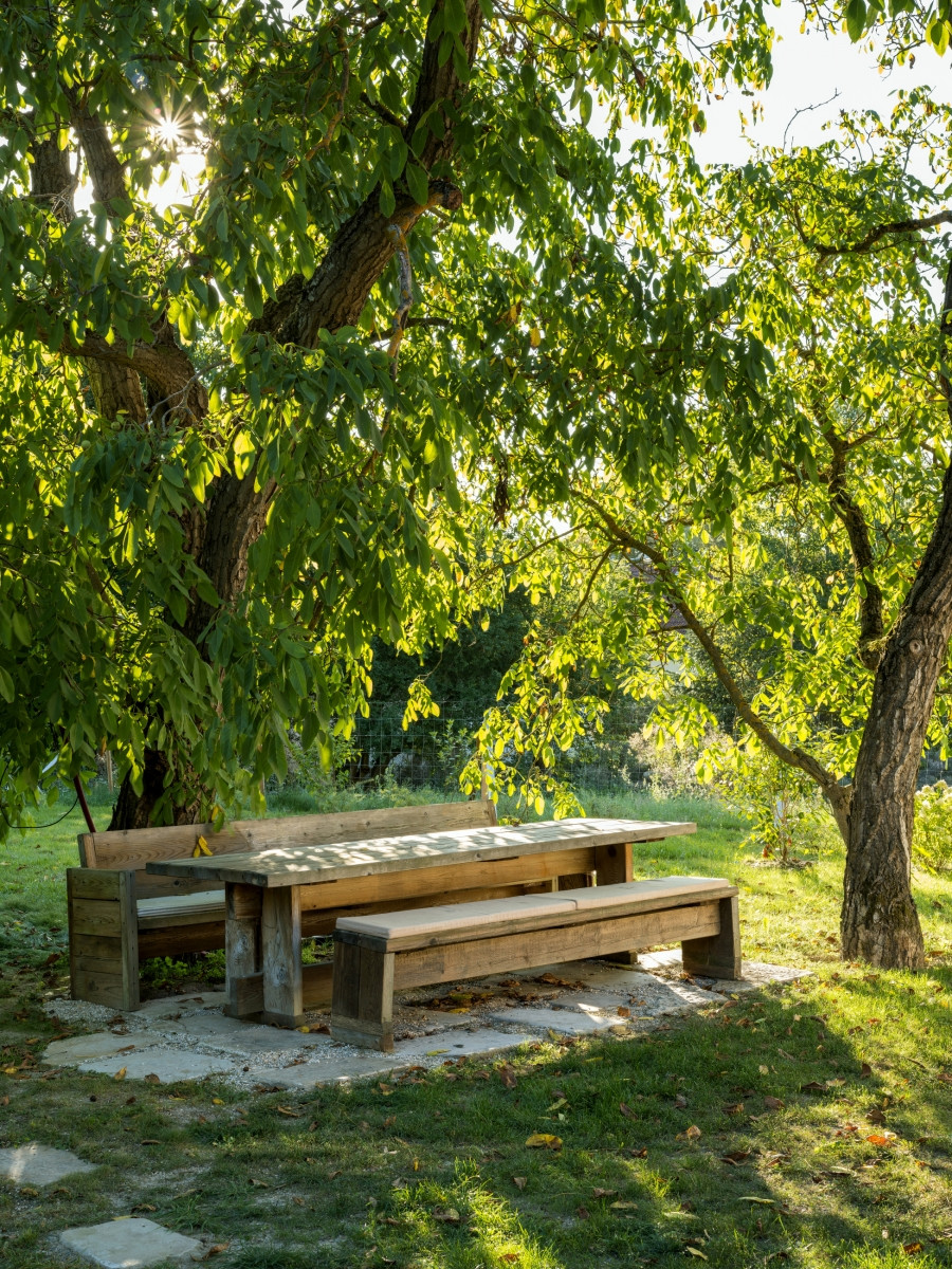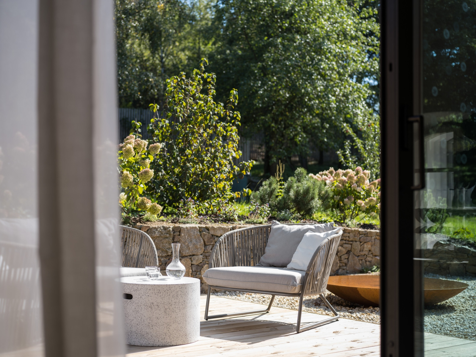 Na zahradě venkovského stavení najdete slunnou terasu s vodním prvkem, ale i posezení ukryté ve stínu pod korunou ořešáku. S citem se o krajinářský návrh postarala inženýrka Jana Pyšková a architekt Jan Záhora.