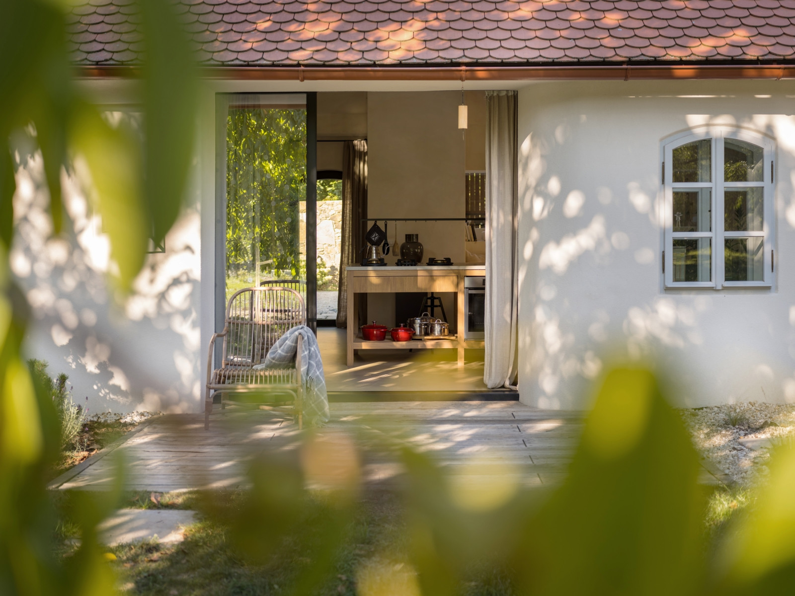 Majitelé se nechali okouzlit starým stavením stojícím v zahradě pod ořešáky. Zbyly z něj však jen vnější zdi a střecha, uvnitř je nový dům se současným komfortem.