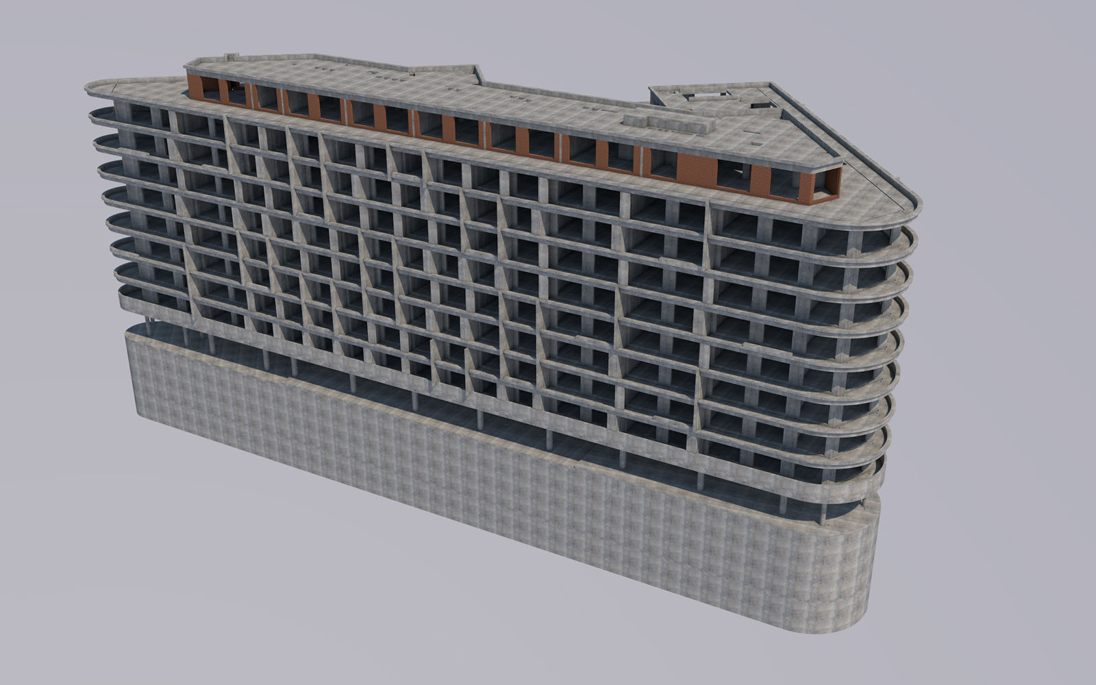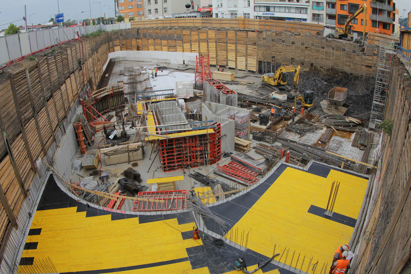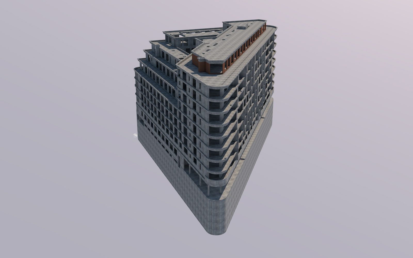 Obvodové nosné konstrukce prvního nadzemního podlaží jižní části věnované komerčnímu využití tvoří vnitřní kruhové sloupy ustupující vůči obvodové stěně podzemních podlaží. Stejně tak autoři navrhli půdorysně ustoupené i obvodové konstrukce dalších nadzemních podlaží, čímž ve vyšších patrech vznikají terasy a současně dochází k akcentování nároží domu.