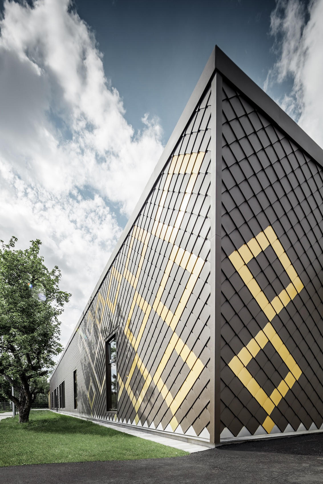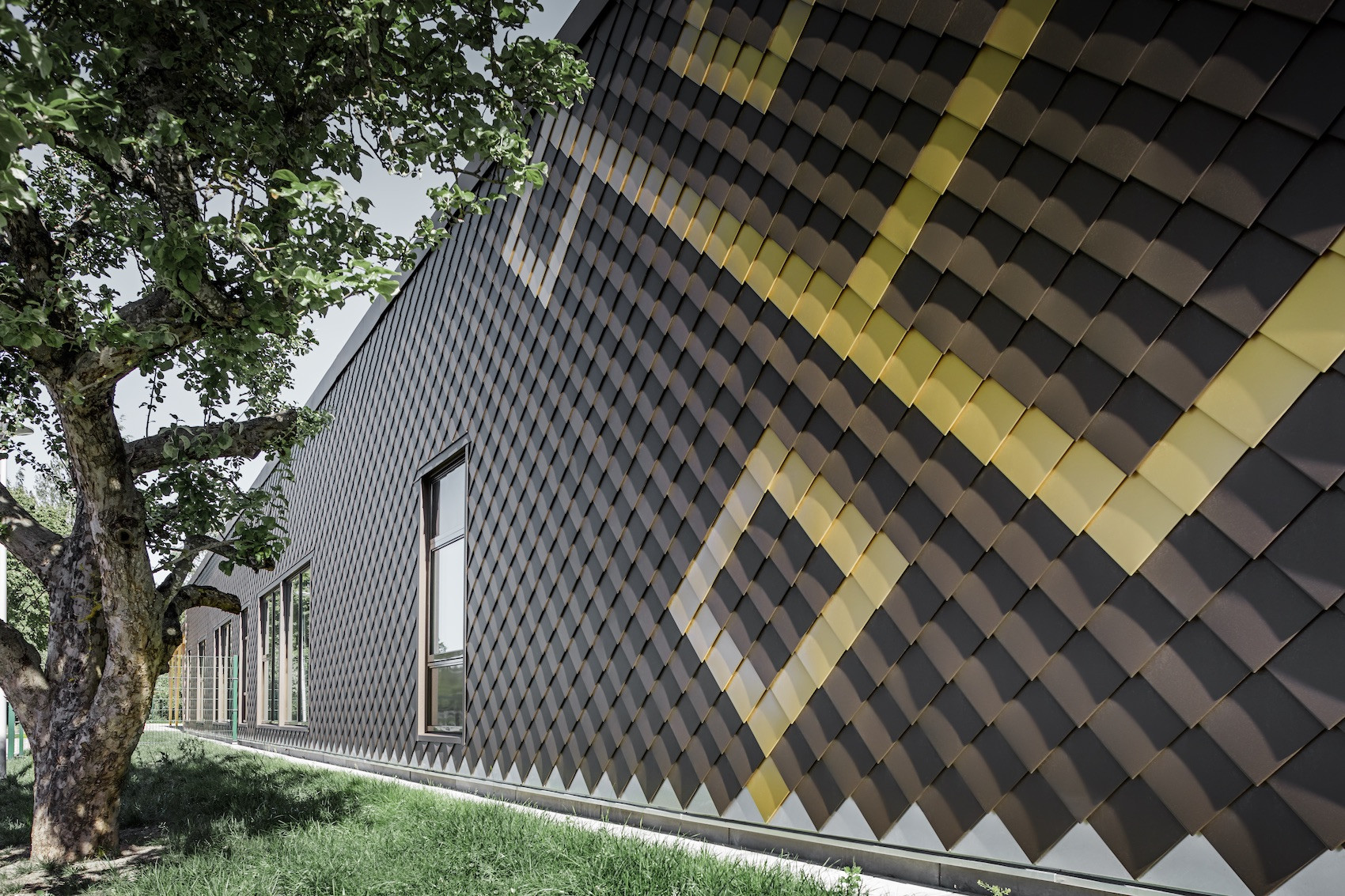 CF: Chtěli jsme i na fasádě uplatnit náš kosočtvercový design, a s fasádními šablonami to bylo snadné.Koneckonců je to budova pro děti, měla by být hravá a hezká na pohled. Zlaté šablony vyvolávají dojem, jako by byla ozdobena medailemi nebo třpytivými šperky. Bylo to poprvé, kdy jsme použili hliník a silně nás to zaujalo, protože hliník nám otevřel nečekané kreativní možnosti. Mohli jsme kombinovat barvy a vytvořit i hmatový zážitek.