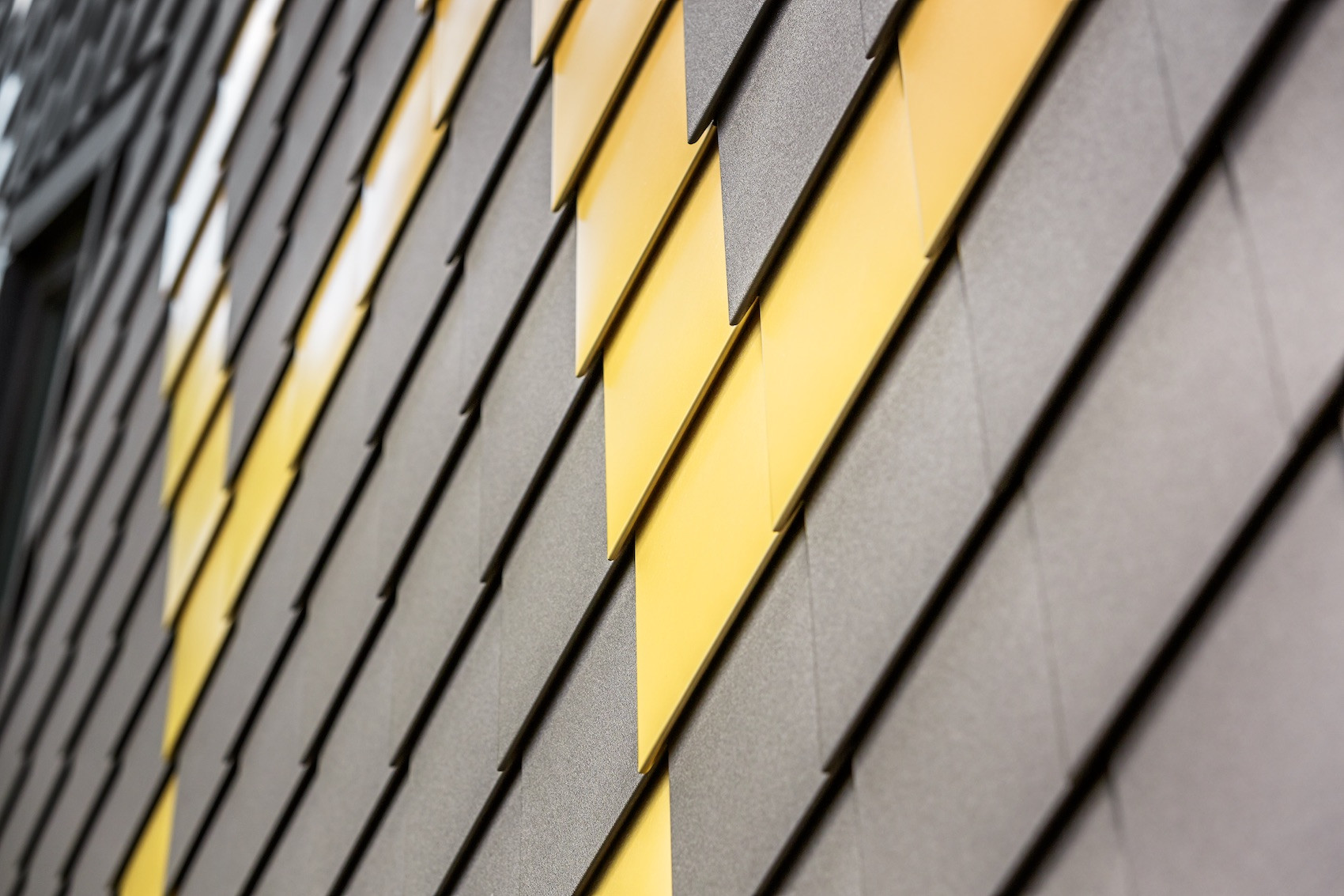 Použity byly hnědé PREFA fasádní šablony a na velké kosočtvercové ornamenty pak šablony v barvě mayského zlata, všechny o velikosti 20×20. Pro kontrast s hnědým kovem a pro dosažení působivého přirozeného vzhledu jsme fasádu na některých místech obložili dřevem.