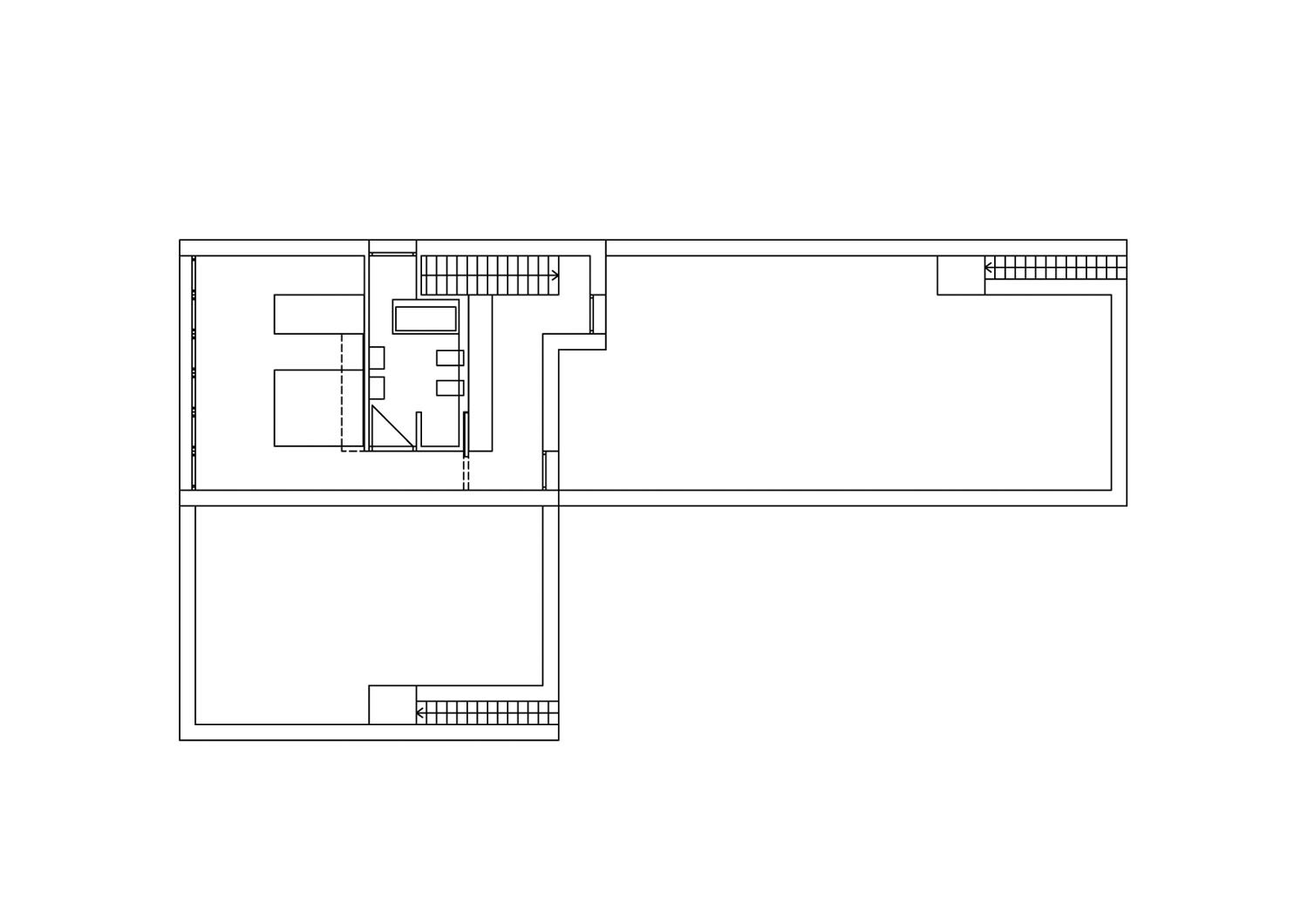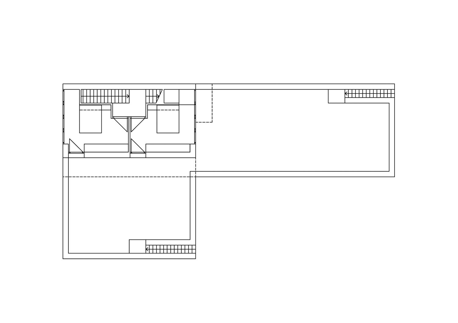 Úzkými venkovními schodišti, která samozřejmě nesplňují žádnou normu, stoupáme na střešní terasu. Ani ta není dosud dokončena. Na terasu lze v patře vstoupit ze dvou místností, které slouží spíše jako pracovna nebo hostinský pokoj. V době výstavby domu už byly obě děti odrostlé, takže v něm de facto nikdy nebydlely. Nelze si nevšimnout motivu známého z Karmáškovy budějovické tiskárny – totiž heraklitu v podbití přesahů ložnicového patra.