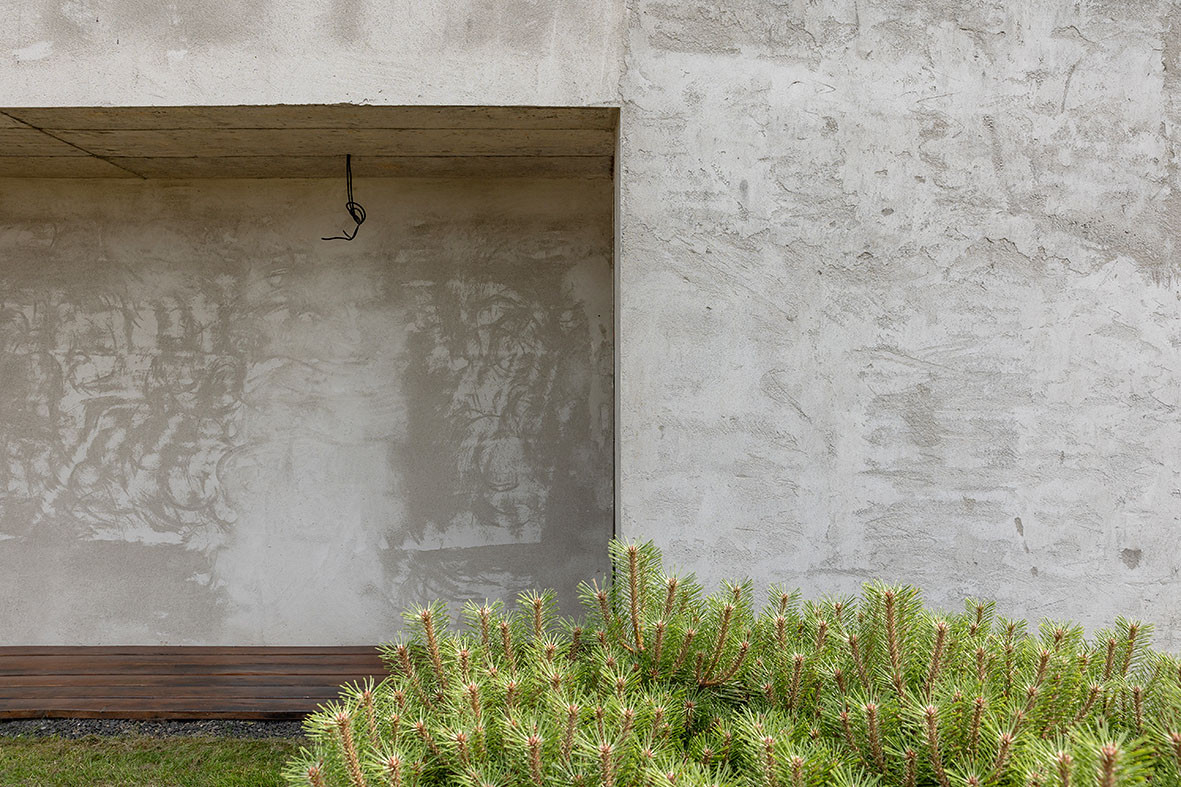 Za našimi zády se nachází citlivě lapidární dřevostavba kůlny – garáže pro karavan, taktéž dílo Ivana Kroupy. Od ořešáku máme naopak výhled na boční fasádu zděného domu, dosud nedokončenou a jakoby zjizvenou. „Setkávám se s námitkami, proč můj dům nemá omítku. Ve skutečnosti má jenom tu základní – většina byla omítnuta strojně, jenom tamhle jsou stopy ruční práce,“ ukazuje pan domácí na čtvercovou plochu. „Už tu byly čtyři firmy, ale žádná nechtěla vytvořit vrchní omítku ručně. Myslím, že někteří řemeslníci ani nepochopili, co po nich chci. Strojní omítka je prý krásná, hladká, bez fleků. Nechápali, že po nich někdo chce opak. A tak zkrátka čekám, že třeba jednou bude méně práce a najde se schopný řemeslník, který by to dotáhnul.“ Dokud se nedokončí omítka, nedokončí se ani strop vstupního zápraží, z něhož i po šestnácti letech trčí připravené kabely pro osazení svítidel.