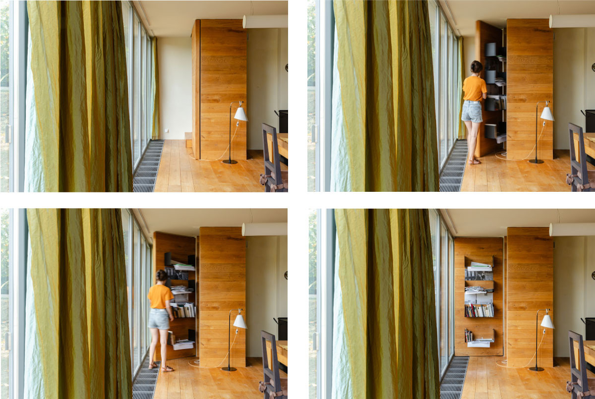 A pak už pokračujeme hlavním vstupem dovnitř. Kolem technického a hygienického zázemí a drobné pracovny do hlavního obytného prostoru. Kuchyně od obýváku a jídelního koutu trochu oddělená, přesto kolem dokola průchozí. V centru dění kulečníkový stůl. Dle svých slov si pan majitel občas zahraje. Unikátní závěsy v nepopsatelné metalické barvě z dílny paní Kroupové. Otočná skříňová stěna, která dokáže uzavřít vstup na schodiště do horních podlaží. A nová kamna jako alternativní zdroj vytápění, jenž zrovna teď přes léto nahrazuje původní krb, který prý žádné teplo nedával. V současné chvíli je nám uvnitř docela vedro, avšak pan domácí prý uživatelský komfort v podobě vytápění či chlazení nikdy neřešil. Podstatné jsou pro něj jiné věci.