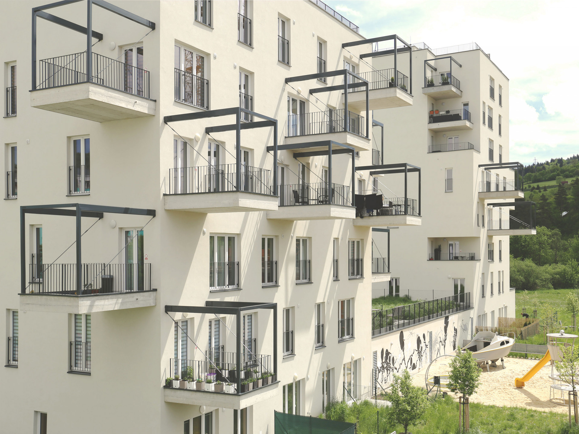 Pro jednotlivé, tvarově různorodé domy, navrhli architekti vizuálně propojující prvky. Fasády všech domů tvoří hladce omítané stěny v pískovcovém odstínu, se kterými ladí světlé okenní rámy. Jemné akcenty pak představují doplňky v šedé barvě v podobě zábradlí lodžií, kovových konstrukcí zvýrazňující kubickou hmotu balkonů, okapů nebo oplechování plochých střech.