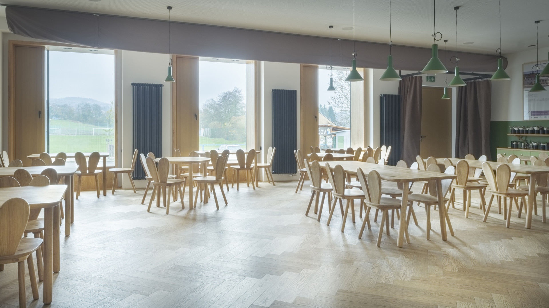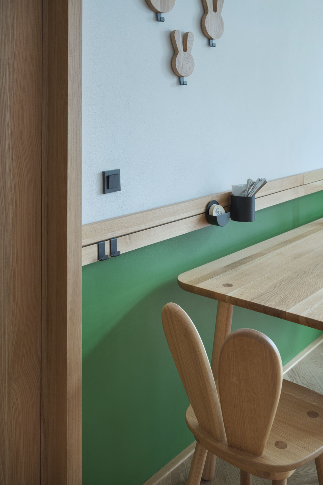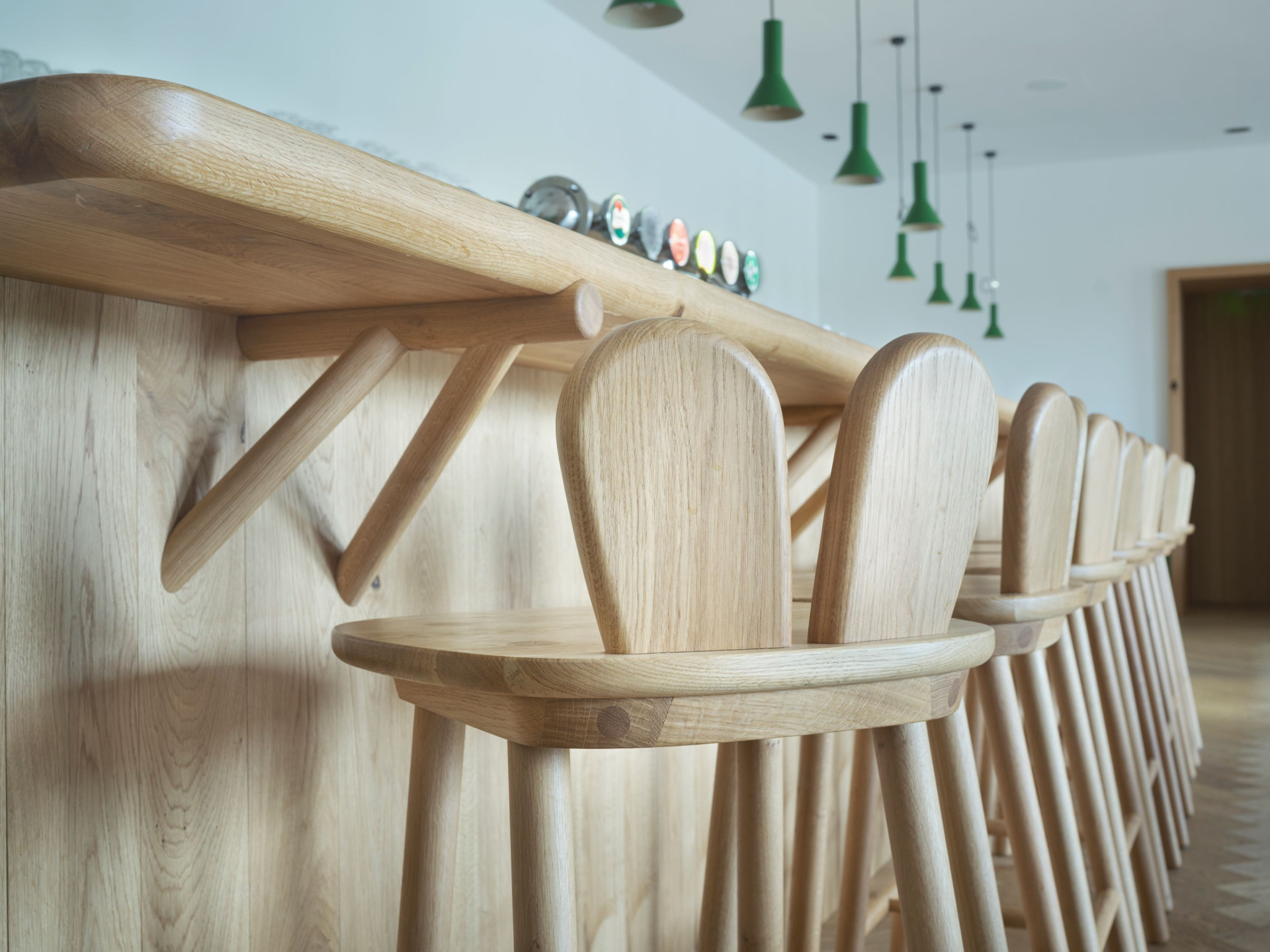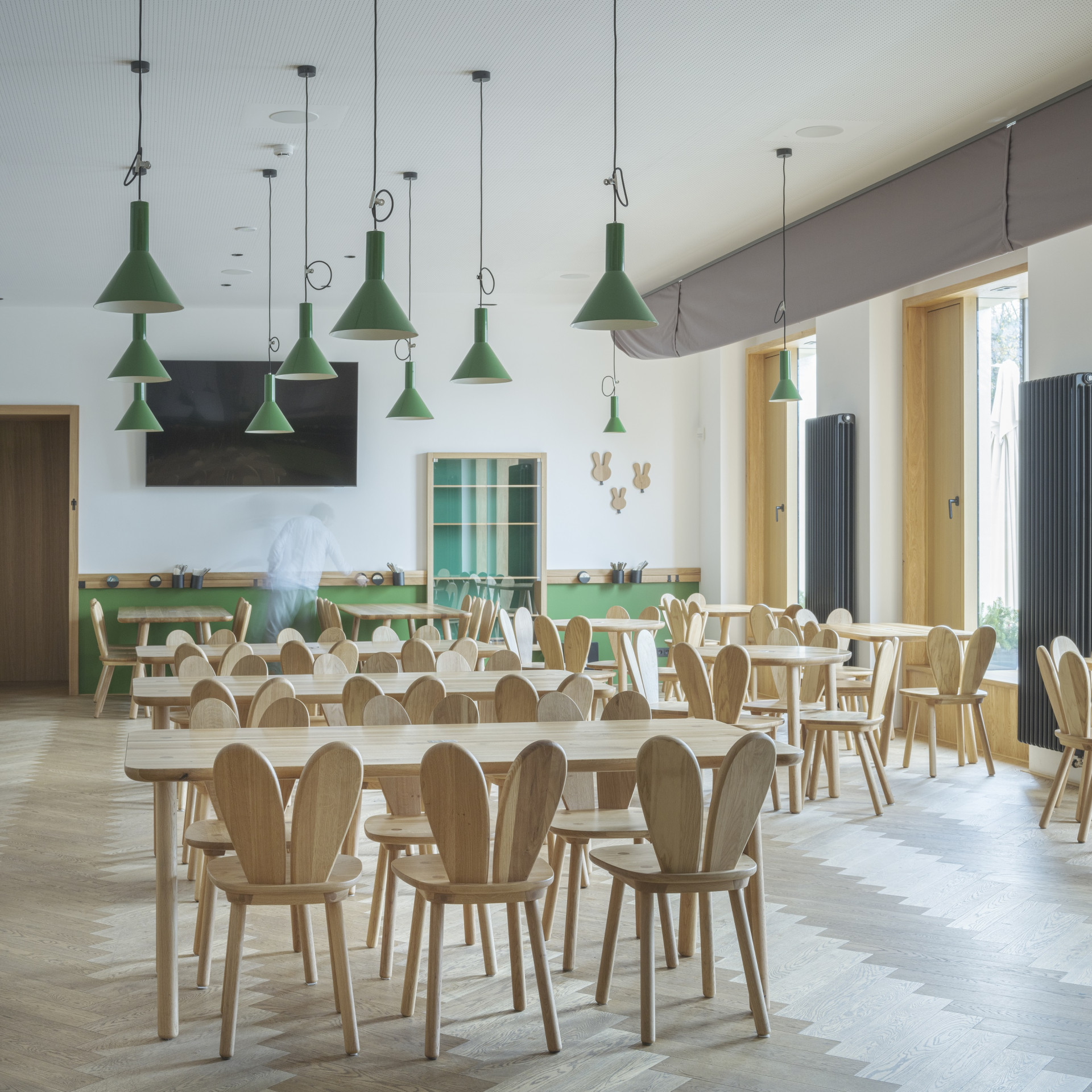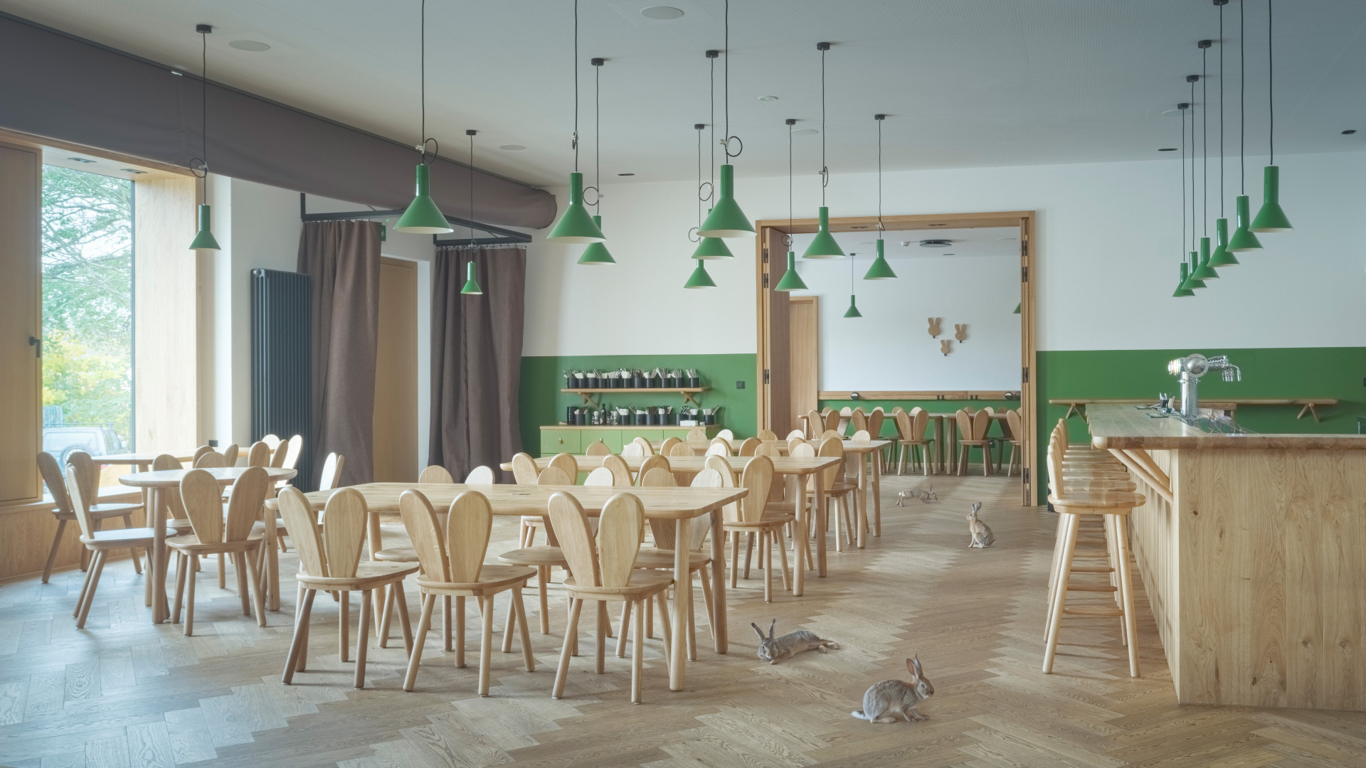 Ačkoliv popis zní humorně, výsledkem je důstojná venkovská hospoda, v níž zajíci nejsou žádná zbytná stafáž, ale praktická součást vybavení. „Vycházeli jsme z interiérů historických hospod, které spočívají v tom, že se skládají pouze z čistě účelových prvků mobiliáře, bez zbytečných dekorací a doplňků,“ podotýká architekt. IO Studio na to šlo cestou materiálové střídmosti a kvality. Veškerý autorský nábytek je vyroben truhláři za použití tradičních nábytkářských postupů a zvolen pro něj byl – stejně jako pro podlahu – světlý dub. Celý prostor hospody osvětluje jeden typ svítidel a stěny jsou vymalované na bílo s „myslivecky“ zelenými akcenty. Zelený sokl ve spodní části stěn je navíc omyvatelný, což je pro hospodu praktické – neponičí ho opěrky židlí ani rozlité pivo.