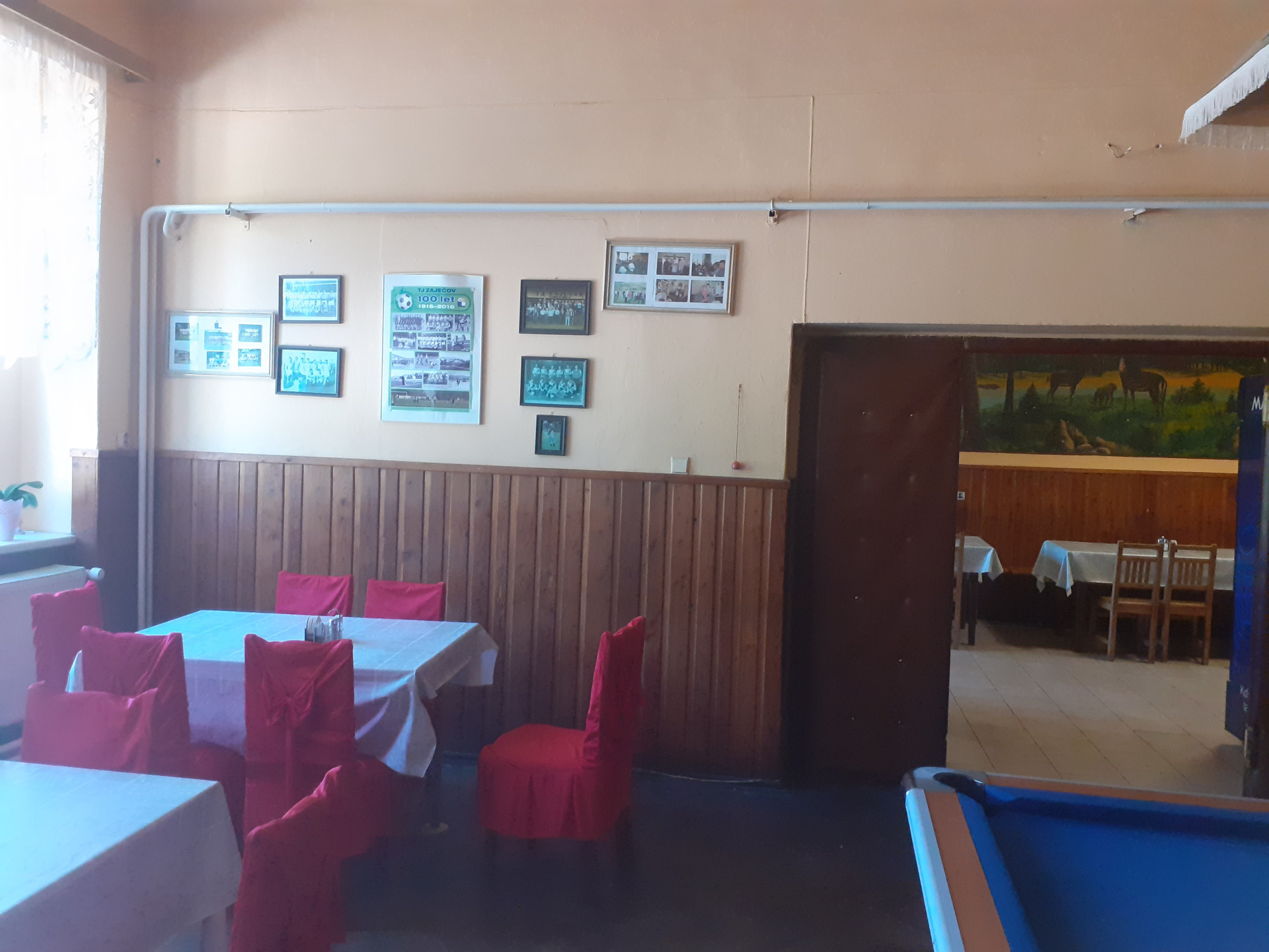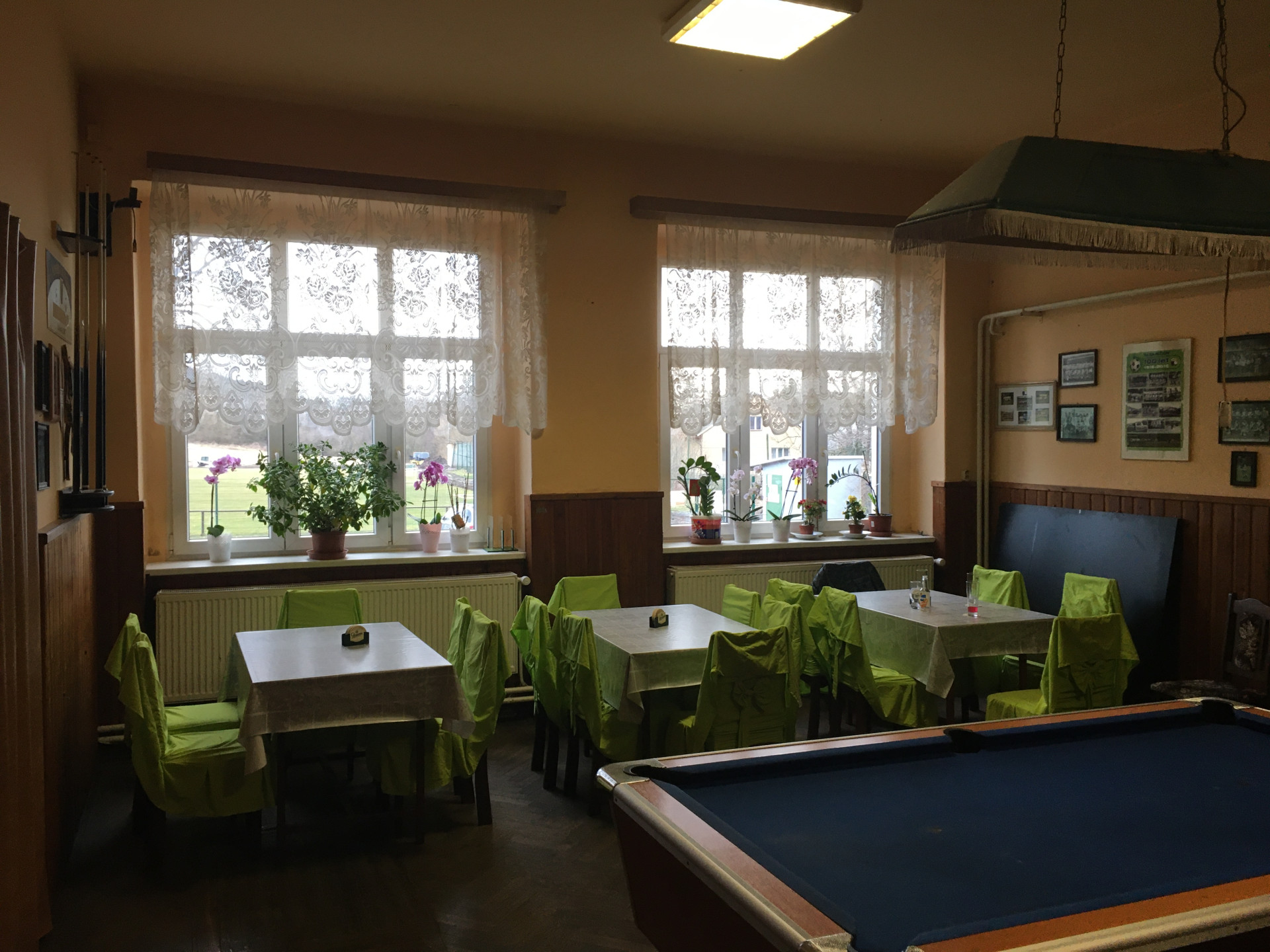Za poznámku stojí také osvětlení restaurace denním světlem. Díky velkým bezrámovým oknům, ve kterých se na širokých parapetech dá také posedět a dívat se ven směrem k fotbalovému hřišti, je uvnitř vždycky příjemně jasno. Původní interiér hospody byl, právě i kvůli menším oknům, ponurý.