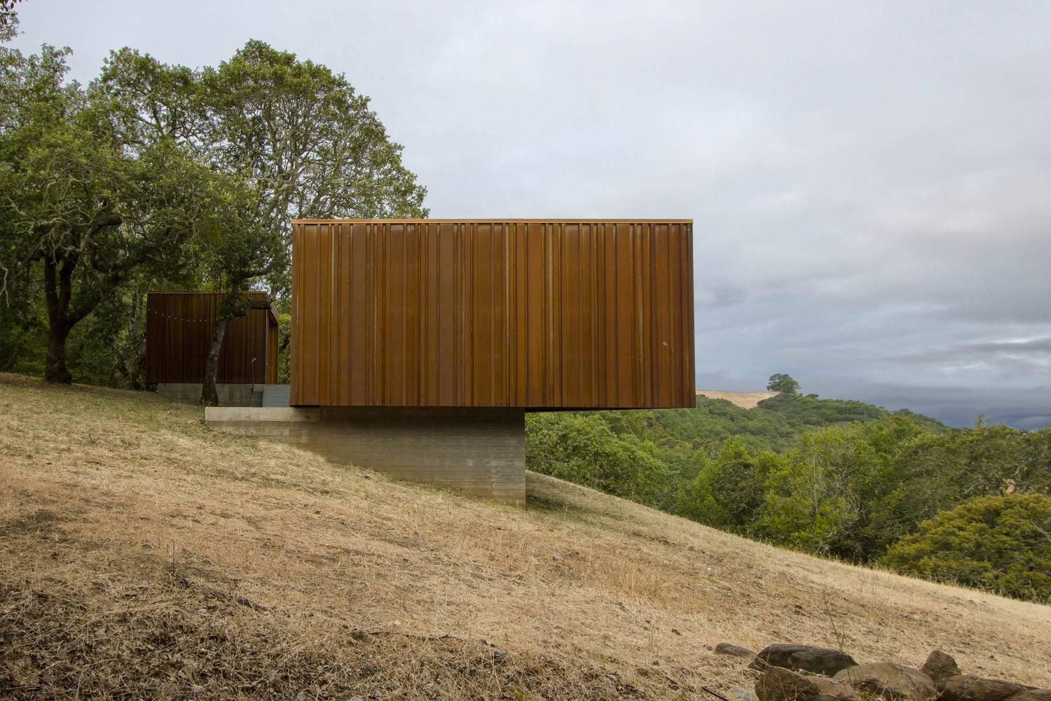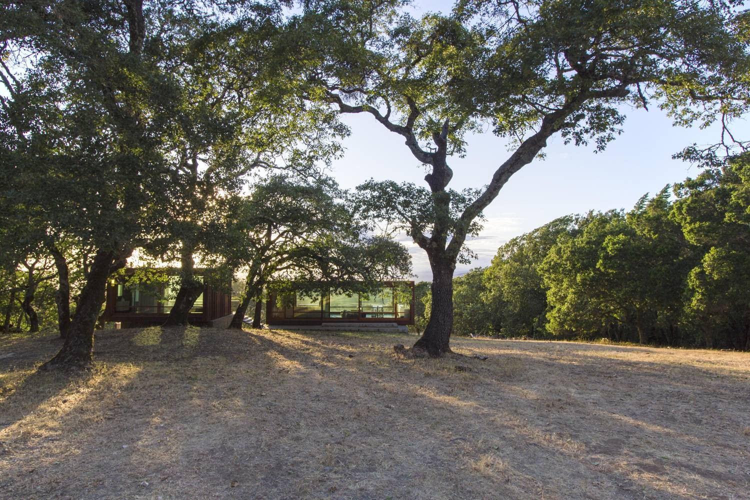 Dům se skládá ze dvou podobných boxů ve tvaru kvádru, které stojí na betonových soklech zasazených do svahu dubového lesa. Větší z nich o rozměrech 12 x 5 metru slouží jako hlavní dům majitelů. Jeho interiér rozděluje vložená kostka z bílého dubu, ve které se nachází ložnice. Prostornější část boxu pak zabírá otevřený společný prostor kuchyně, jídelny a obýváku, opačný konec pak patří malé koupelně s toaletou. Menší box umístěný výše ve svahu slouží jako pokoj pro hosty.