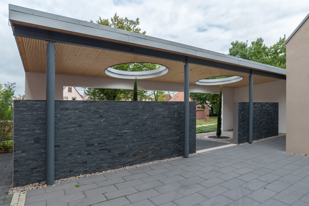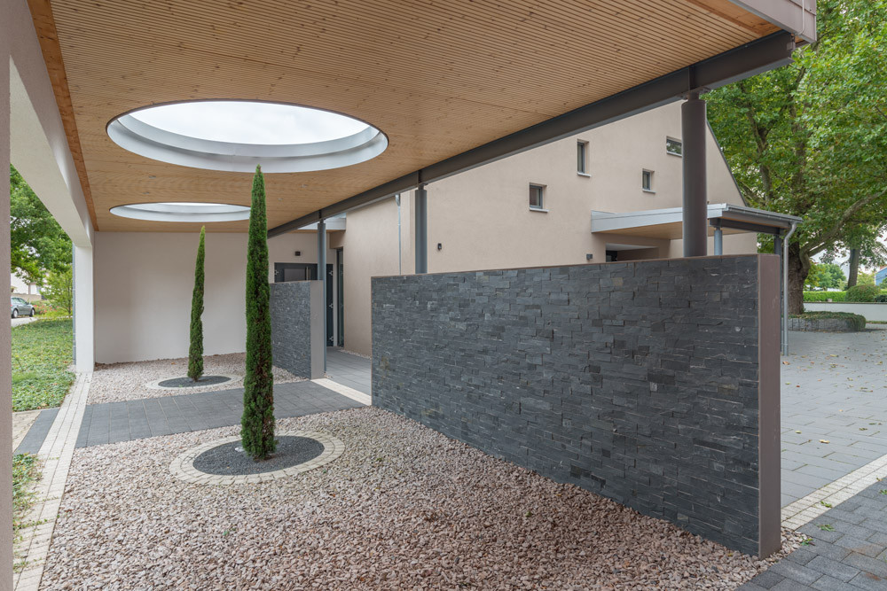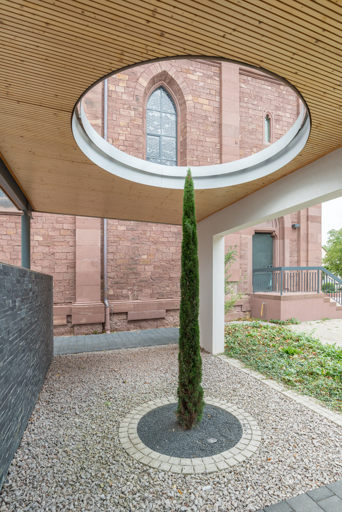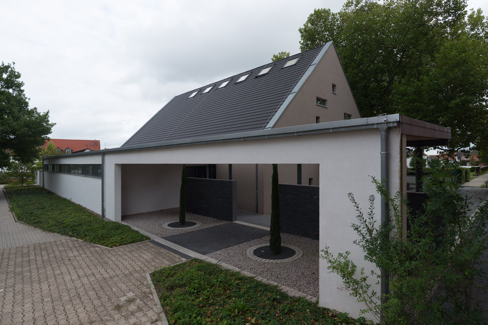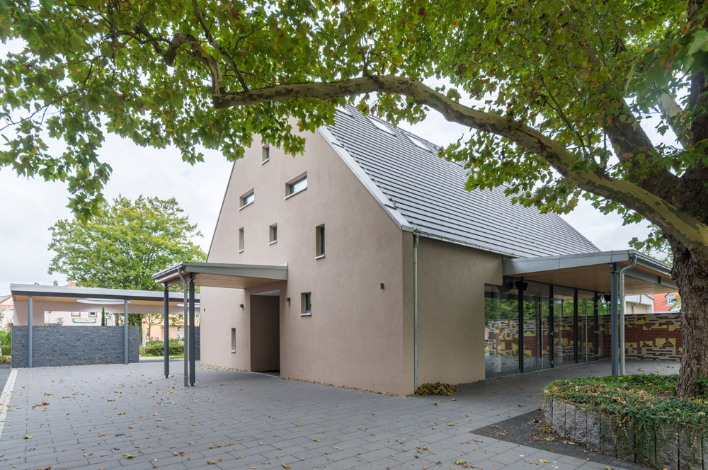 Obřadní síň se nachází v malém městě Linkenheim-Hochstetten ležícím severozápadně od Stuttgartu. Ačkoliv vypadá jako nová, obsahuje v sobě zdivo z 50. let – vznikla totiž rozšířením původního objektu. Nové řešení přesunulo veškeré provozní a kancelářské zázemí do přístavby obíhající původní objekt ze dvou stran.