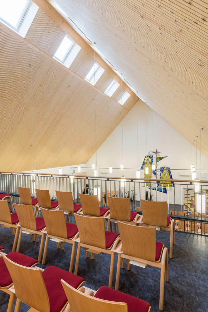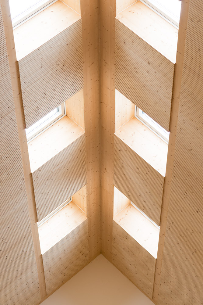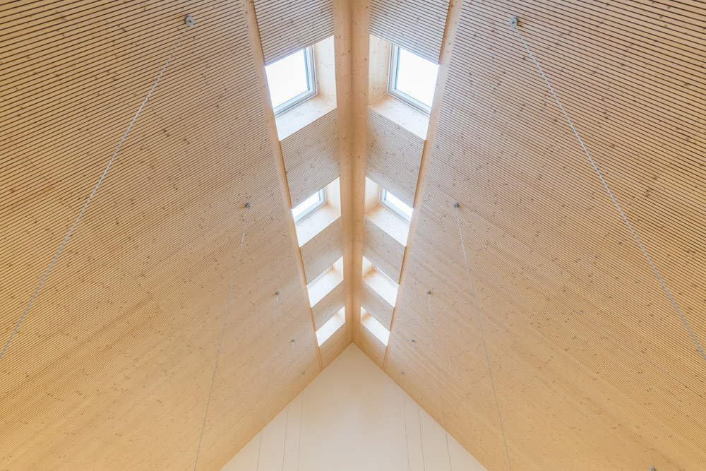 Výrazná střecha se do interiéru obřadní síně propisuje jako monumentální dřevěná skořepina, působící lehkým a vzdušným dojmem. Světlo je dovnitř přiváděno v místě hřebene, kam nechali architekti do panelů umístit obdélníková okna, která zároveň zajišťují dostatečnou ventilaci. Místnost se také velmi dobře propojuje s exteriérem, a to díky velkoformátovým oknům na jedné ze stran budovy.
