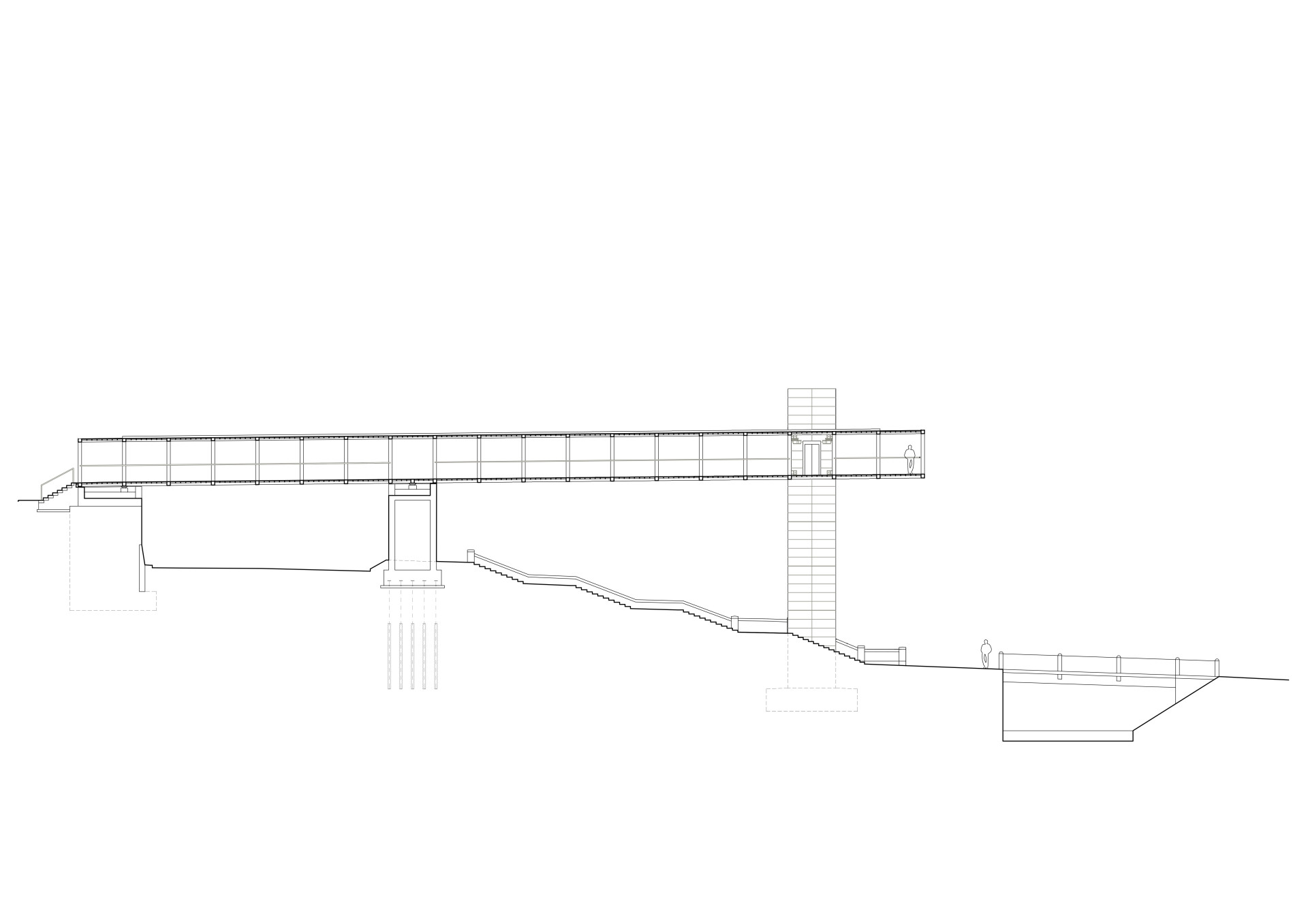 „Subtilní ocelová konstrukce je nesená masivními pilíři z pohledového železobetonu. Statický systém svařované ocelové konstrukce je spojitý nosník o dvou polích s převislými konci. Nosný systém se skládá ze dvou hlavních Vierendelových nosníků spojených příčníky,“ popisují konstrukční řešení architekti.