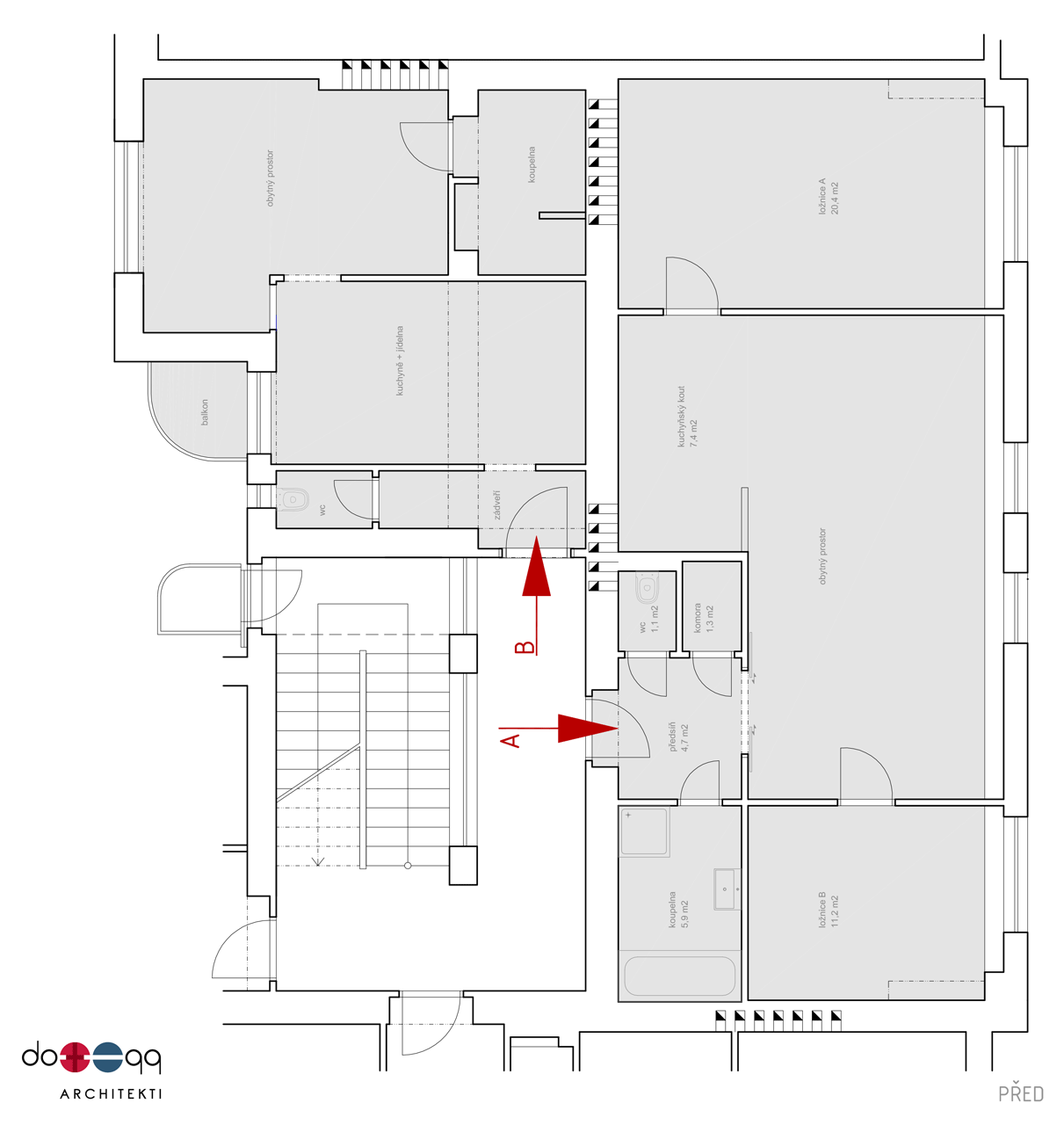 dotegg architekti s. r. o., Půdní byt v Holešovicích, půdorys, původní stav - foto