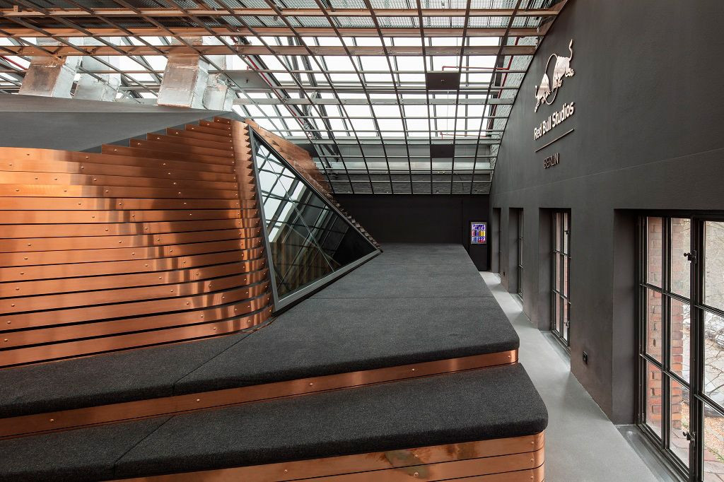 Obložením zdí mědí jsou zvýrazněny vazby mezi měděnou infrastrukturou elektrárny průmyslové éry a asociací Red Bullu s energií a sílou. Vizuální rytmus vznikl formováním tvaru měděných pásů do zvlněné sekvence, představující přirozený tok zvuku a hudby. Obří schodiště proudí centrálně prostorem a umožňuje tak hudebníkům doslova vyšplhat až na nově vytvořené mezipatro haly, zasazené na vrchol sošného nahrávacího studia.