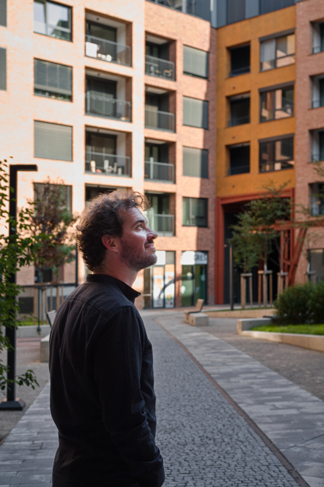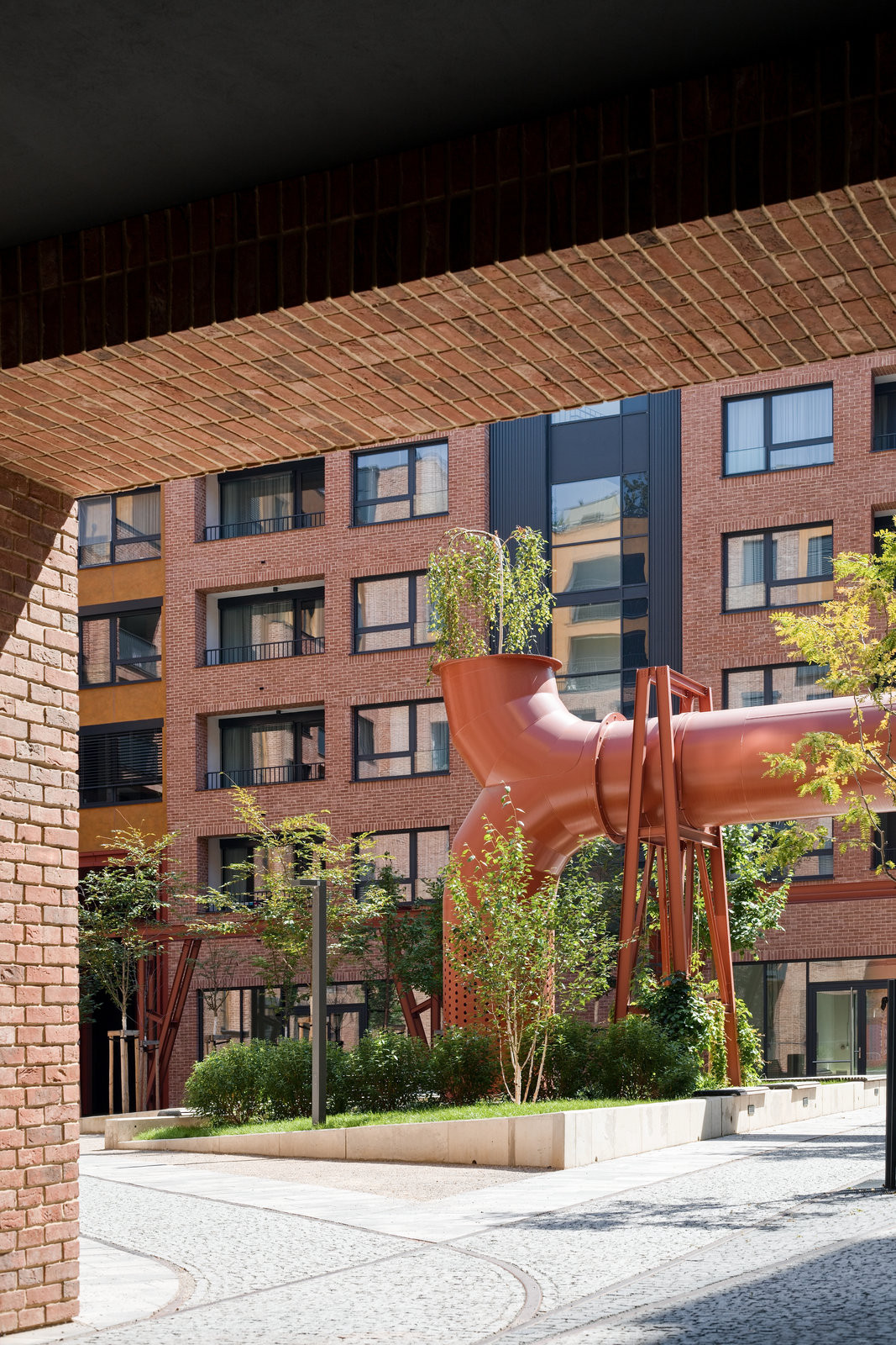 S Davidem Černým to máme tak, že on přichází jako kreativní tvůrce, vytváří na začátku sochu – tvář, místo, koncept, se kterým potom společně pracujeme. Například při návrhu vnitrobloku jsme nejprve chtěli uprostřed udělat jezírko, které by sloužilo k bruslení nebo koupání, něco jako malé Náměstí svobody v Bratislavě. David to ale odmítl. Podle něj hlavním problémem bytových domů je prázdnota mezi fasádami: když se díváte z okna a není tam nic, díváte se jiným lidem do oken. Proto navrhl vrátit do prostoru industriální motiv – konstrukce ze starých produktovodů, které doplní výšku a bude na co koukat. Popínají se po nich rostliny, mění se s ročním obdobím, vrací sem industriální atmosféru. Díky tomu je vnitroblok neustále vizuálně zajímavý a lidé v okolních domech se nedívají jeden druhému do oken, ale sledují život a detaily v prostoru.