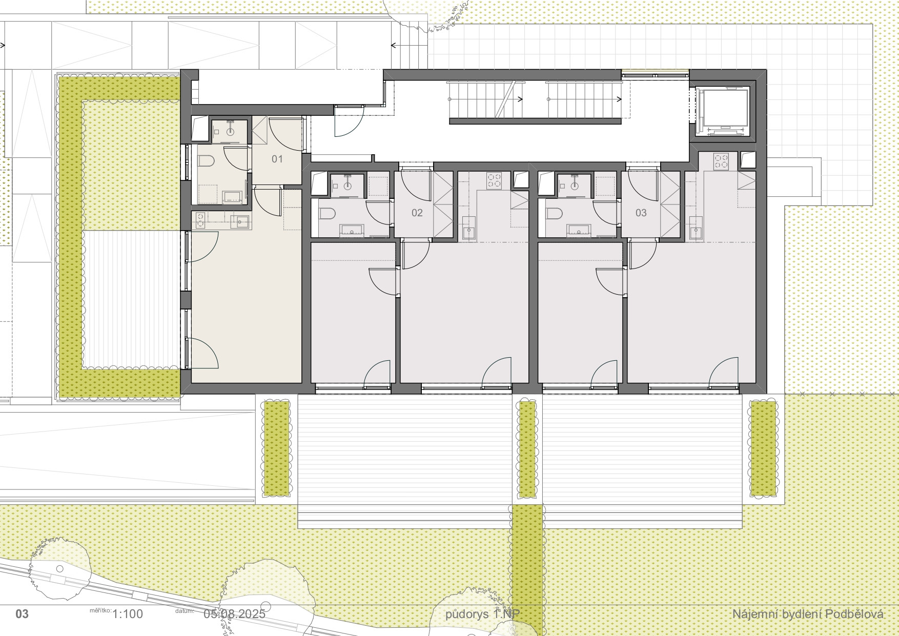 A velkou devizou celé realizace je zeleň, obklopuje takřka celý dům. Tráva prorůstá dokonce na venkovních parkovacích stáních. Původně na místě stál rodinný dům se zahradou, současný bytový dům má zahrádky taky – patří konkrétně ke třem bytům na přízemí. Největší z nich má skoro 100 metrů čtverečních. Do zahrádek se dostává rovnou z obývacích pokojů, na které navazují ještě dřevěné terasy.
