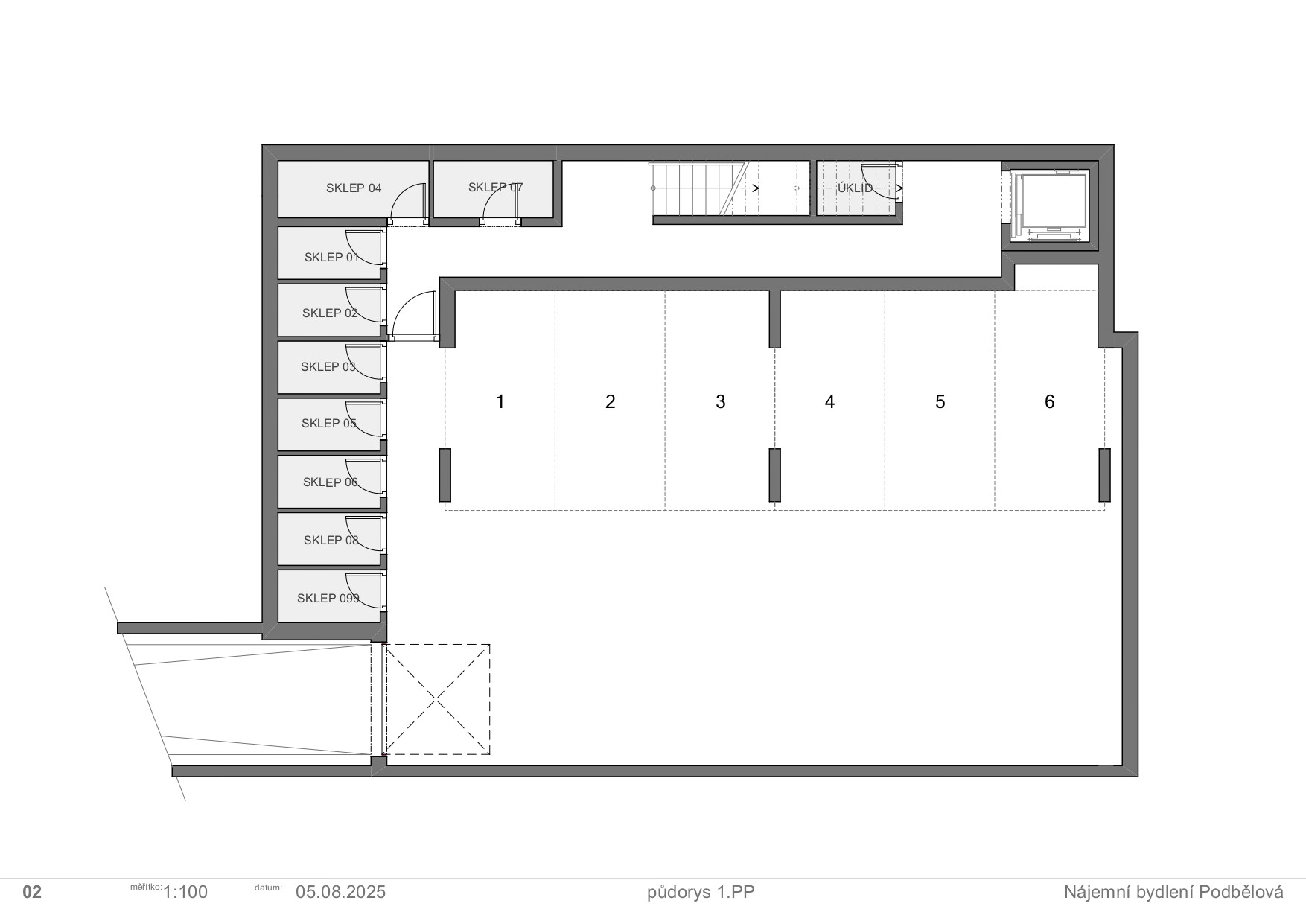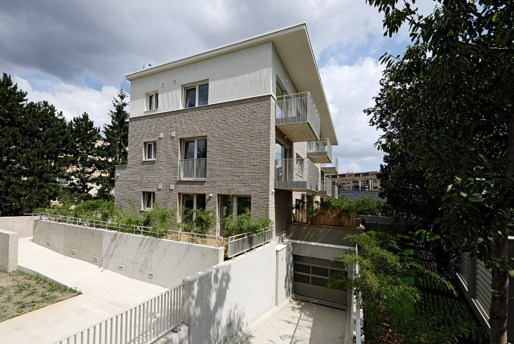 Dům má také vlastní podzemní garáž, automobily do ní zajíždějí po rampě na okraji pozemku. K dispozici jsou také sklepní kóje – ke každému bytu připadá vlastní.