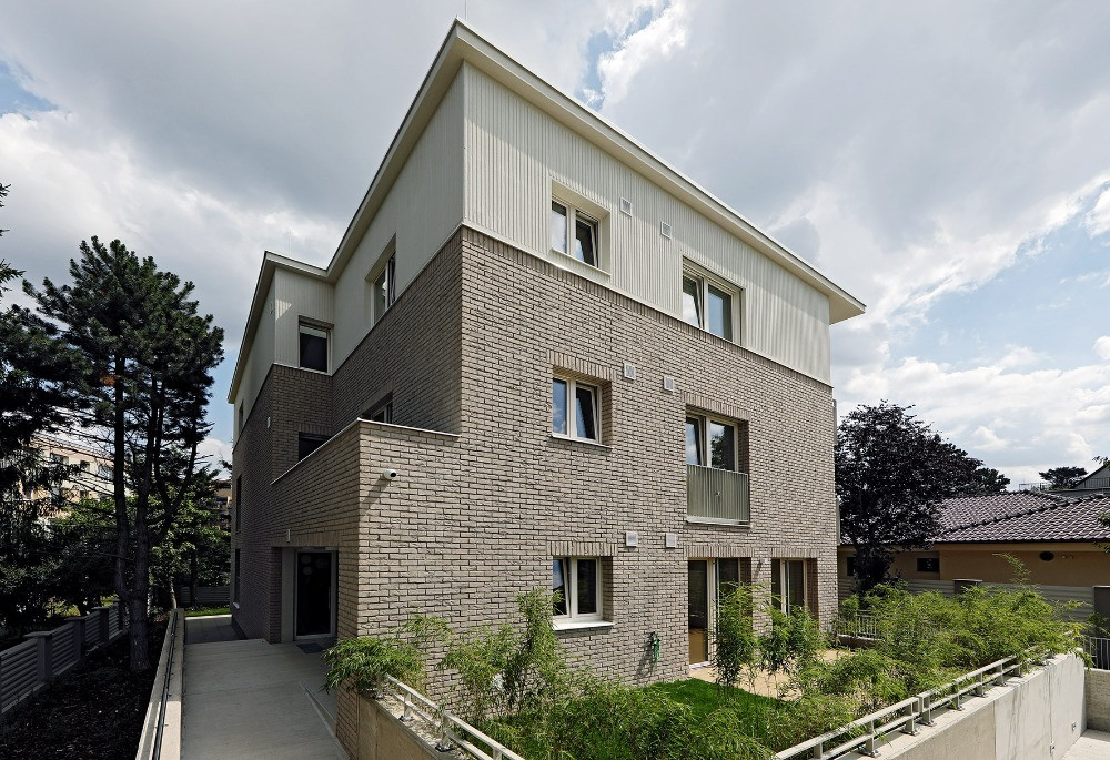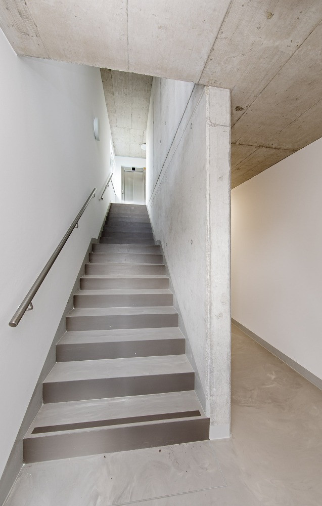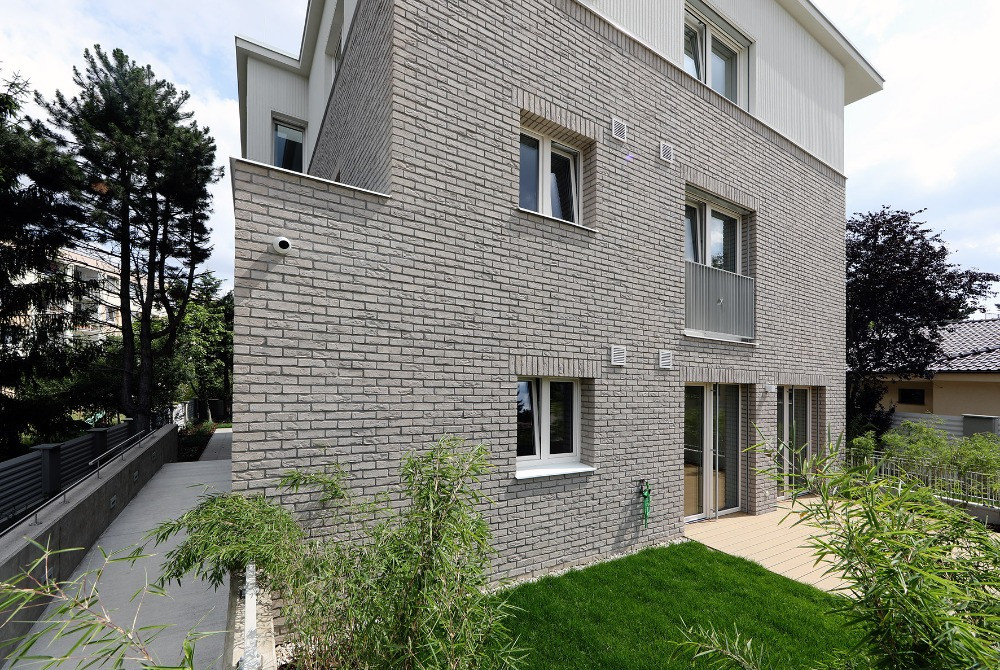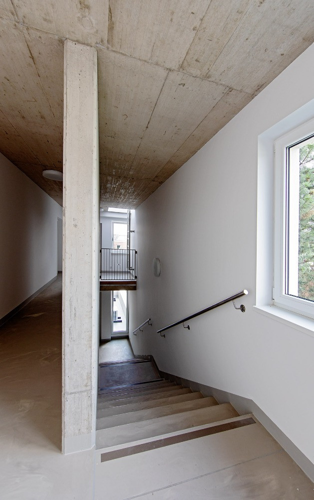 Konstrukci domu tvoří cihly (Porotherm od wienerberger) a monolitické betony. Právě ty zůstaly místy přiznané, třeba na stropech ve společných chodbách. Beton je ale k vidění už venku před domem, jsou z něj zídky, opěrné stěny, schodiště. Interiér a exteriér je díky tomuto materiálu esteticky provázaný.