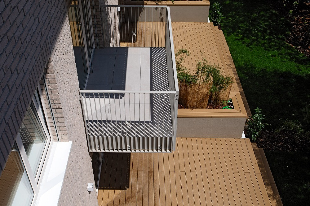 Byty, které nemají své vlastní zahrádky, mají vlastní balkon – zavěšené jsou jen na jižní fasádě domu a z ulice na ně není přímý výhled. To je příjemné jak pro nájemníky a nájemnice, tak pro vzhled domu. Zavěšené balkony neruší klidně ztvárněnou fasádu směřující k ulici.