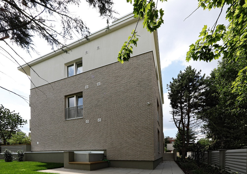 Dům těží z kombinace tradičního a současného. Má kompaktní půdorys, nevypadá ale jako obyčejná kostka, jeho hmota přívětivě graduje. Až nad okna prvního patra vystupuje obklad z lícového zdiva (jedná se o produkt Terca Forum Prata od wienerberger). Nad ním pokračuje světlá omítka ve vertikálním rastru. Vše dokončuje plochá střecha s výrazným přesahem na jedné straně, stíní a kryje balkony zavěšené na boční fasádě.