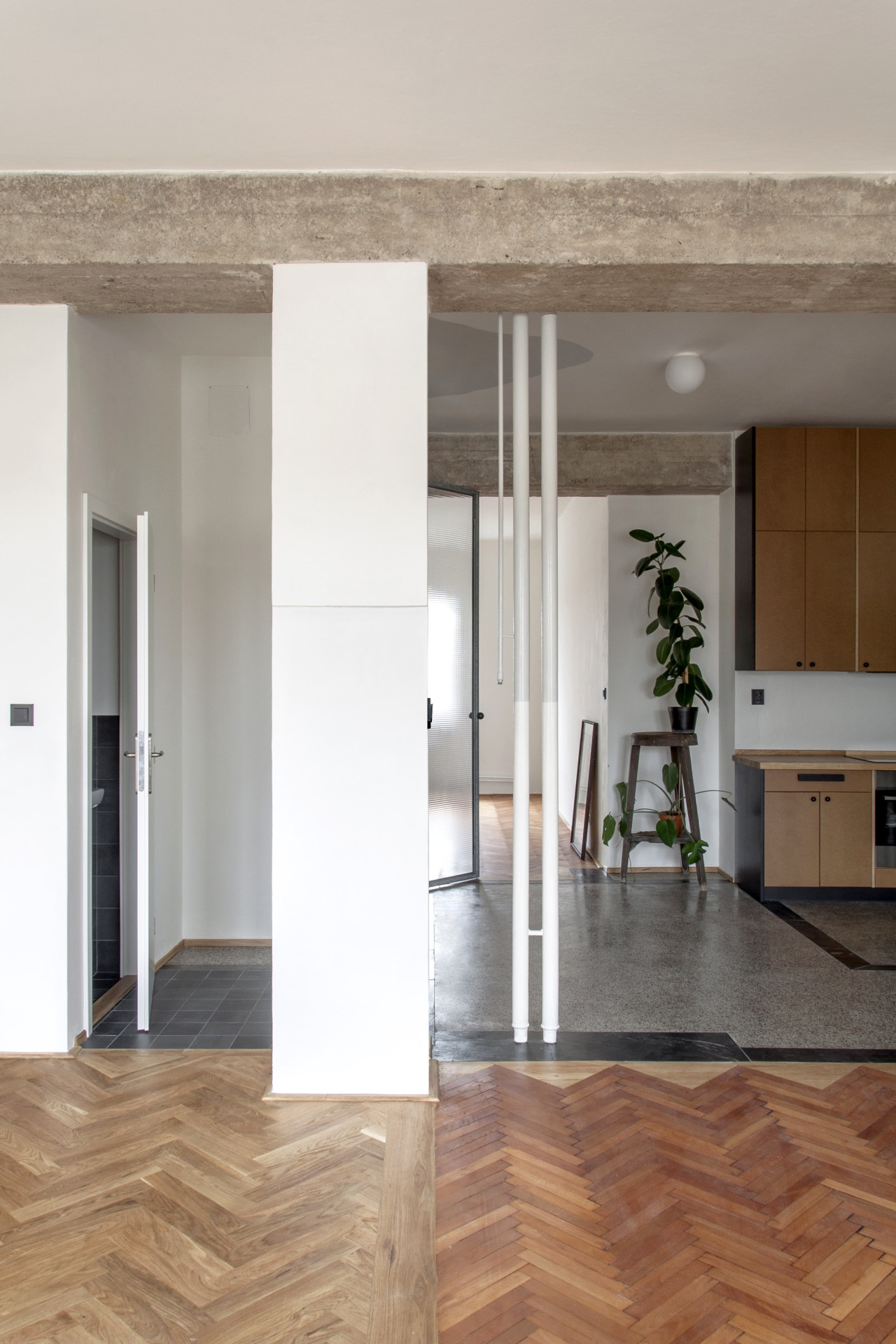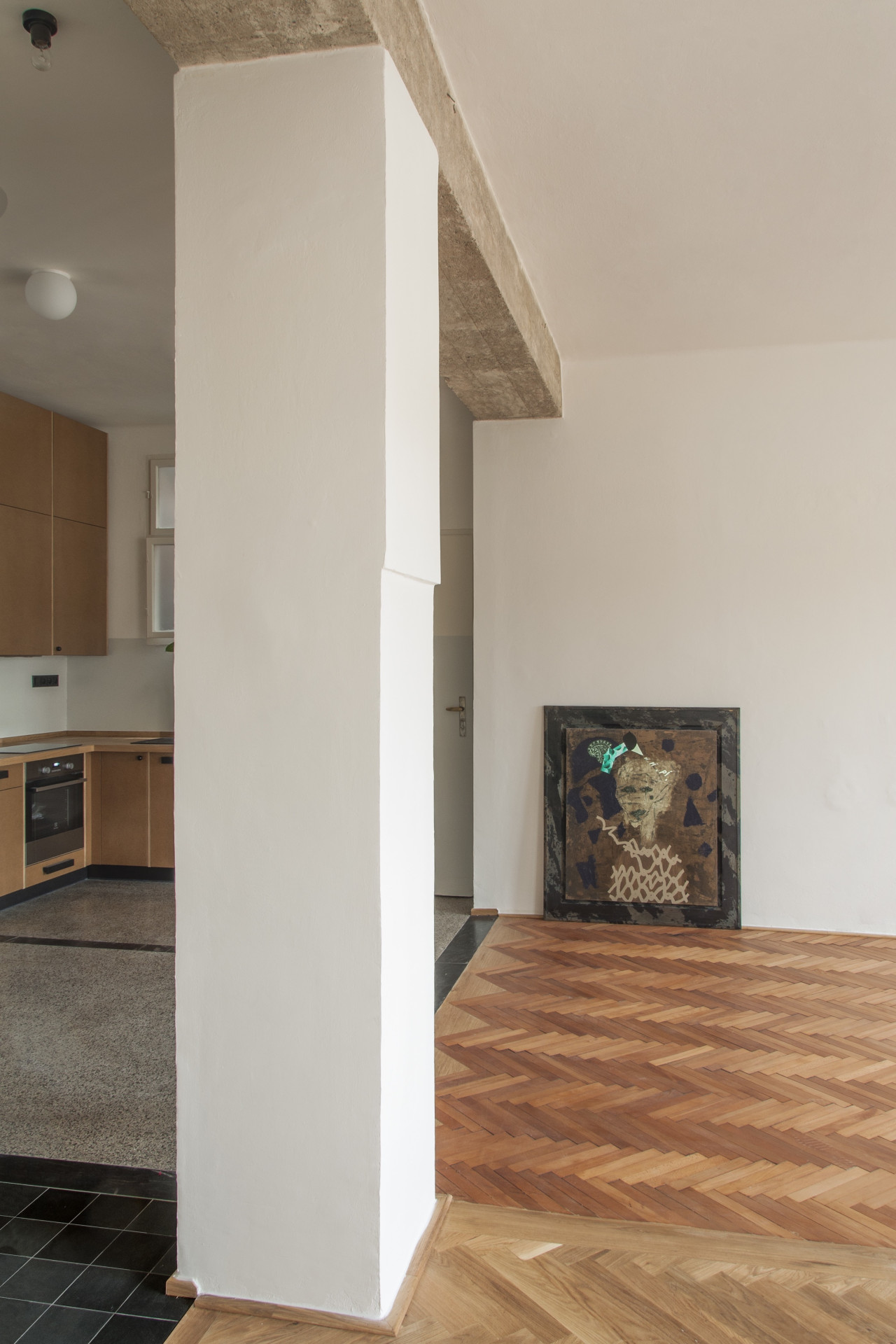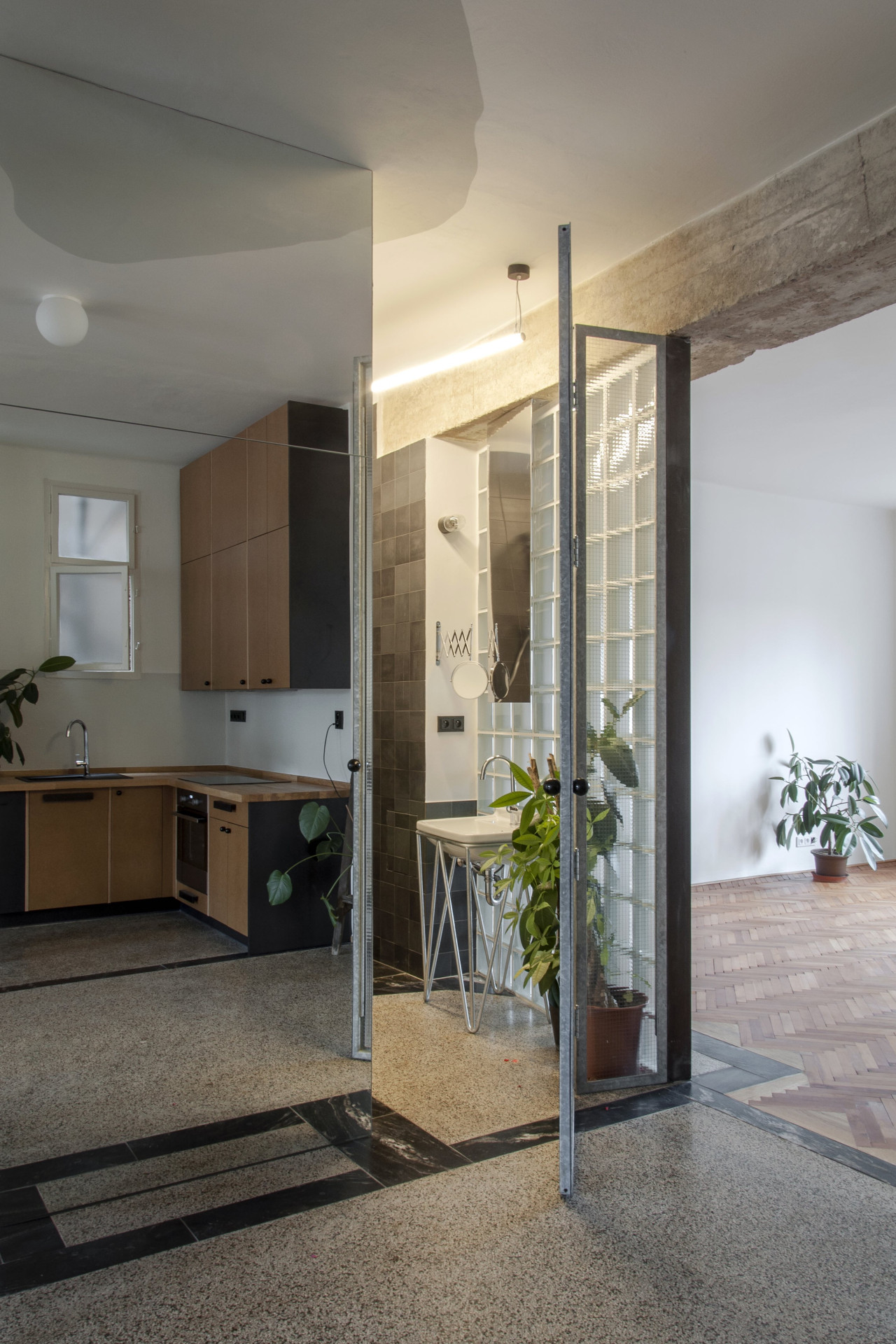 Architektka a architekt pracovali pro klienta, který měl v plánu byt pronajímat. Jednotku tvoří tři samostatné pokoje původně přístupné z chodby. Ta je dnes prostornější místností, která je příjemně prosvětlená, vedle kuchyňské linky se do ní vejde třeba jídelní stůl. Prostor je ve středu dispozice, původně byl tmavým středním traktem, dnes do něj proudí světlo ze dvou stran i ze světlíku. Příčky byly odstraněny a odhalily se tak stoupačky, které ale ničemu nepřekáží.