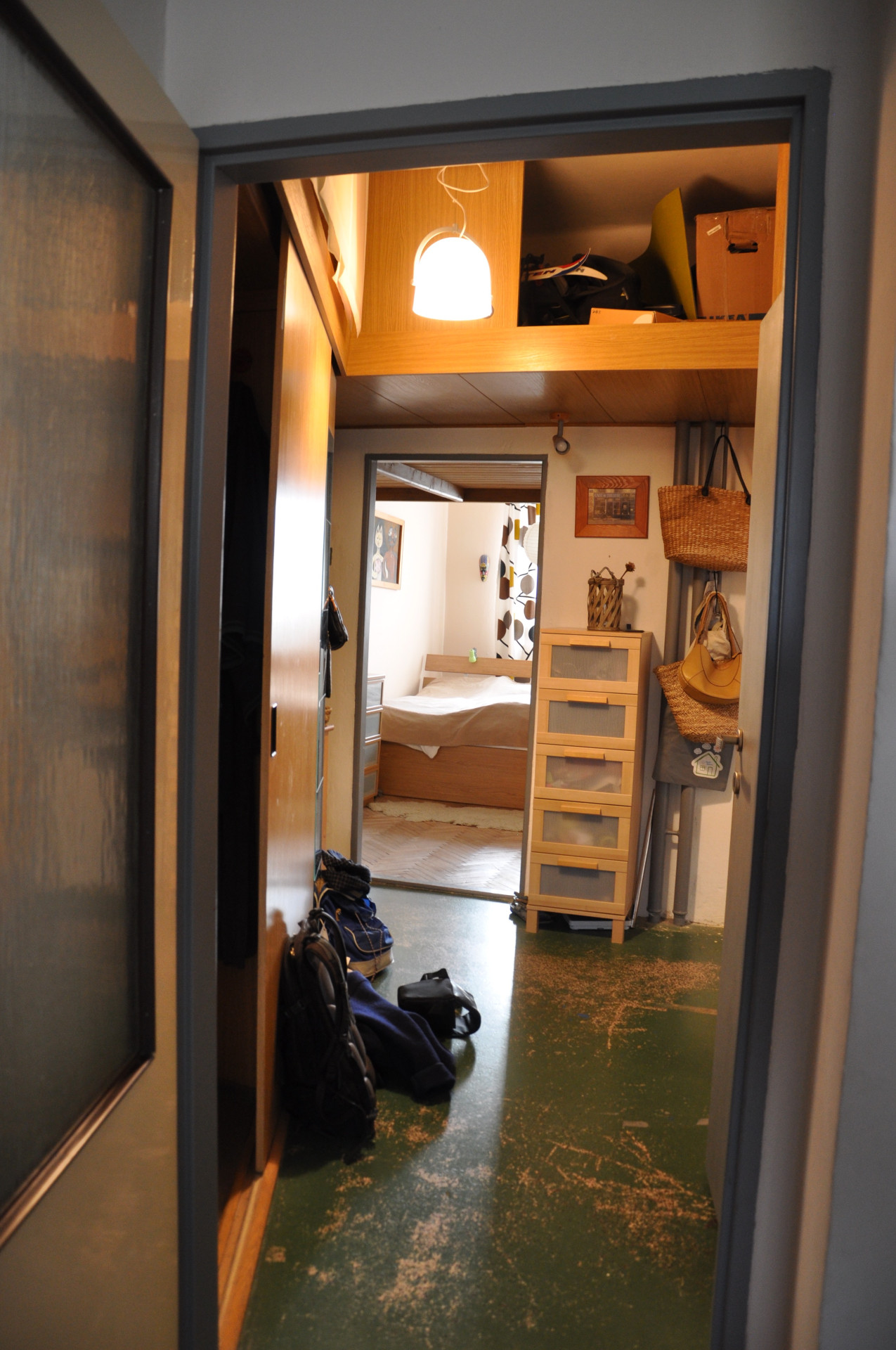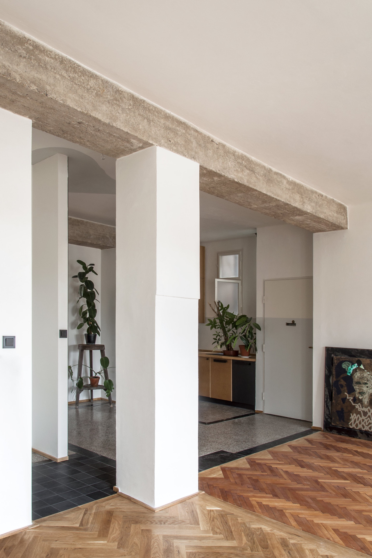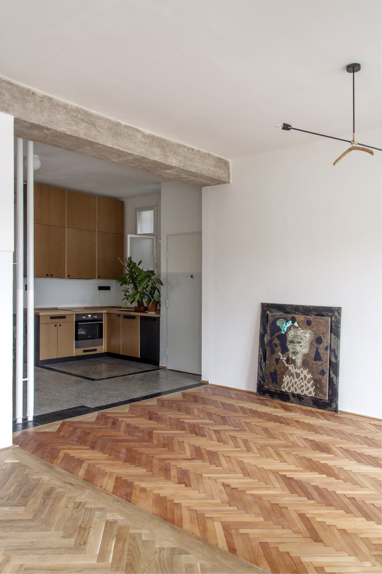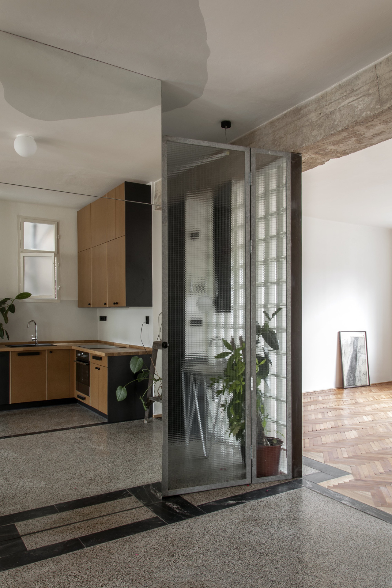 Architektka a architekt pracovali pro klienta, který měl v plánu byt pronajímat. Jednotku tvoří tři samostatné pokoje původně přístupné z chodby. Ta je dnes prostornější místností, která je příjemně prosvětlená, vedle kuchyňské linky se do ní vejde třeba jídelní stůl. Prostor je ve středu dispozice, původně byl tmavým středním traktem, dnes do něj proudí světlo ze dvou stran i ze světlíku. Příčky byly odstraněny a odhalily se tak stoupačky, které ale ničemu nepřekáží.
