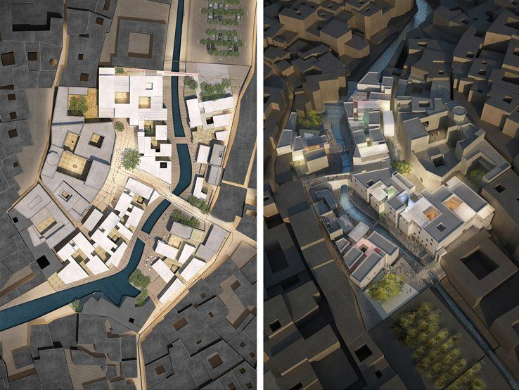 Nové budovy jsou do stávající hmoty integrovány pomocí navazujících a vhodně rozmístěných otevřených prostorů. Původní náměstí by přitom mělo přitahovat rozdílné věkové kategorie a sloužit soukromým i veřejným účelům. Inspirací zde byl klasický marocký riad – dvůr ve středu domu, kde se mísí veřejný a soukromý provoz. Autoři tak celé okolí náměstí vnímají jako jeden urbánní dům s centrem - atriem, kam vše vstupuje a zase se vrací.