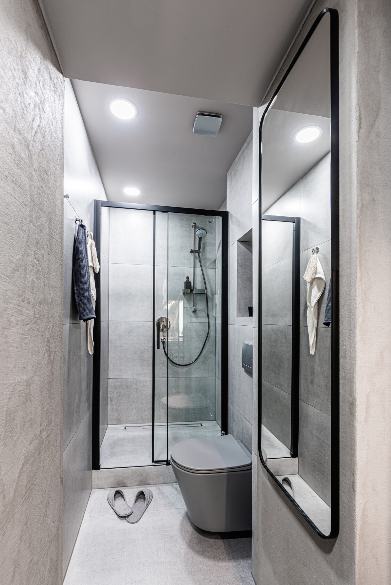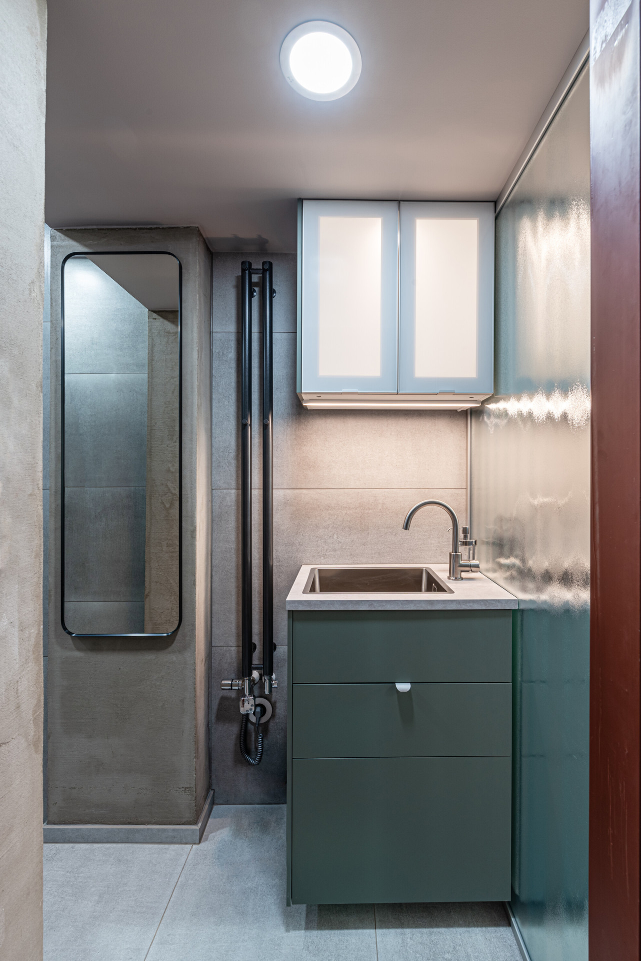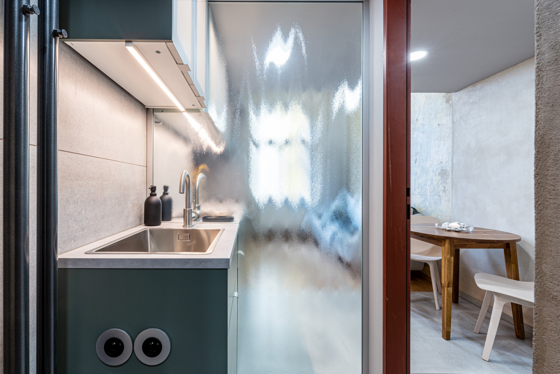 „Skleněné příčky mezi kuchyní a koupelnou v obou prostorech propouští světlo do útrob půdorysu. Koupelnový nábytek hmotově navazuje na kuchyňskou linku, vzniká zde optický klam zrcadlení dřezu, baterie a skříněk. Jedná se však o pomyslné rozdvojení odkazující se na rozdělení celku,“ upřesňují koncepci prostoru a jeho prvků autoři.
