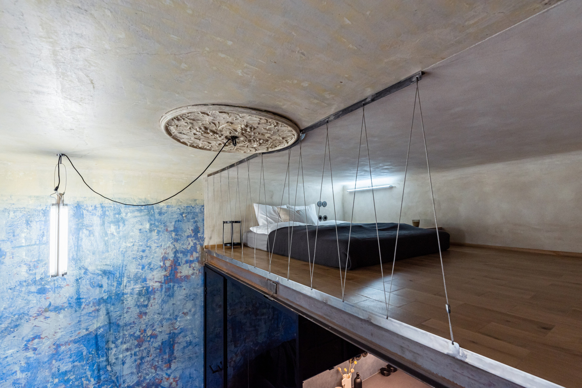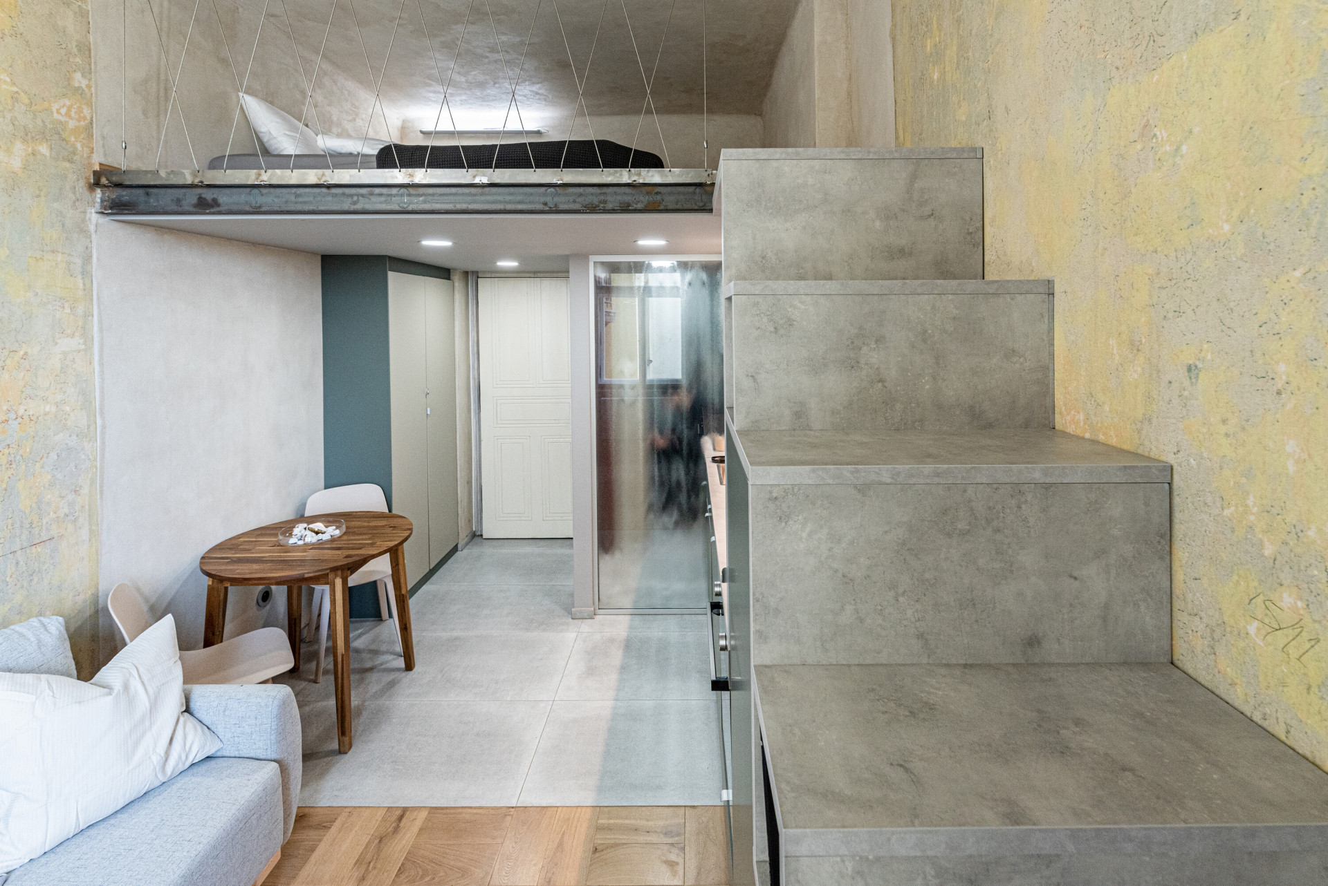 Aby bylo možné na tak malé ploše vytvořit spací prostor, který by zároveň nebyl obývákem, jak je u garsonek běžné, rozhodli se architekti vybudovat nad kuchyní a koupelnou vestavěné spací patro. Tvoří ho ocelová konstrukce doplněná o zábradlí vypletené nerezovými lanky, svým dekorem odkazuje na secesní zábradlí z exteriéru domu. Schodiště do spacího koutu vede po stěně a jeho spodní část vyplňují skříně a přihrádky, aby ani kousek prostoru nepřišel nazmar.