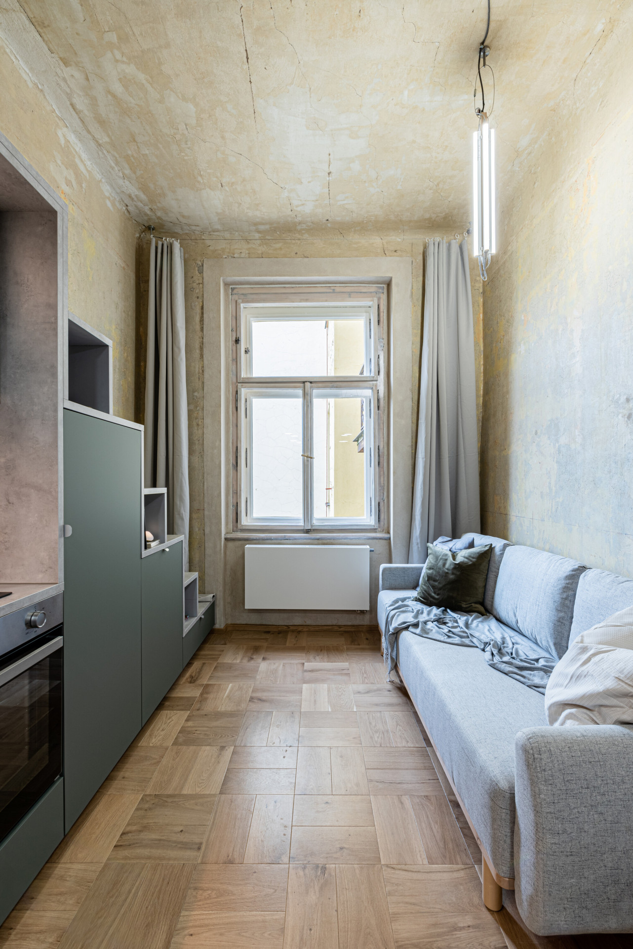 Razantní proměna bytu měla zůstat patrná. S novými prvky a materiály kontrastuje stará, nahrubo oškrábaná omítka, která se podobá abstraktní malbě. Tímto kontrastem celý interiér ožívá.