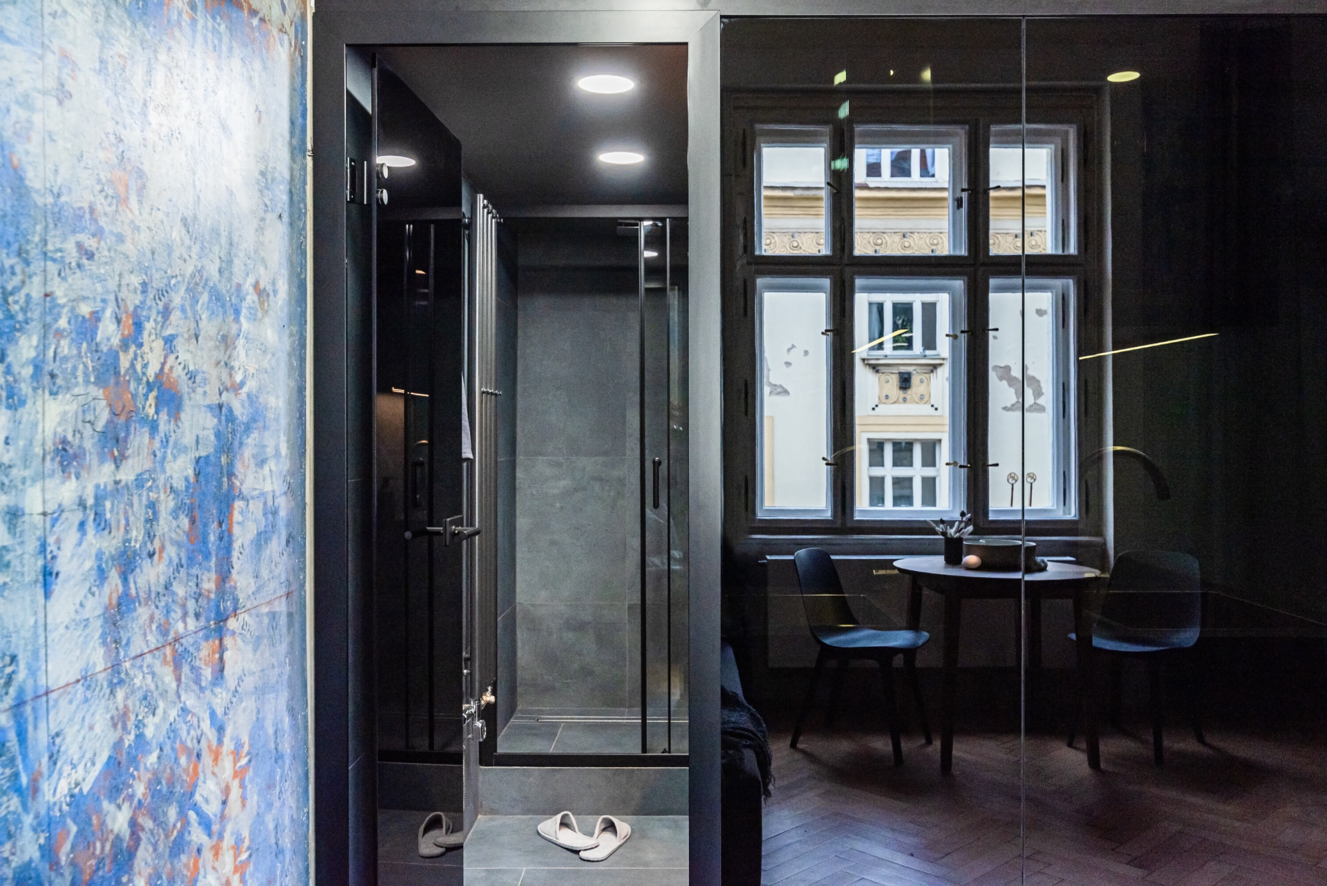 Namísto jednoho bytu dva. Jsou malé, ale ne stísněné, na dvaceti metrech čtverečních zůstal prostor i pro umění ze seškrábaných omítek