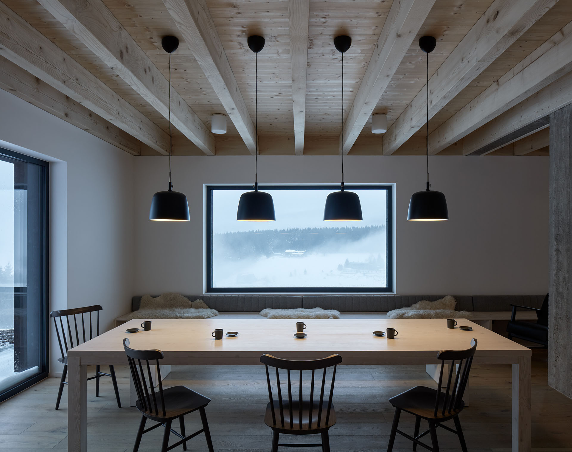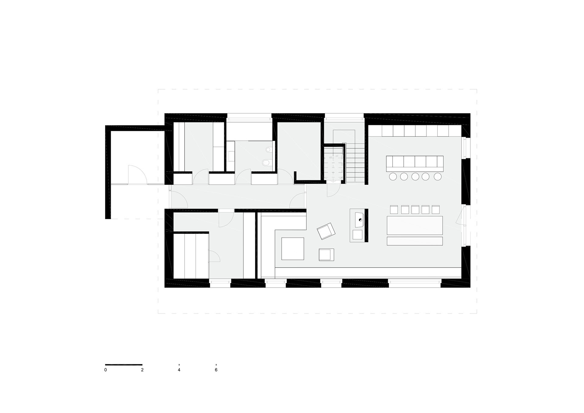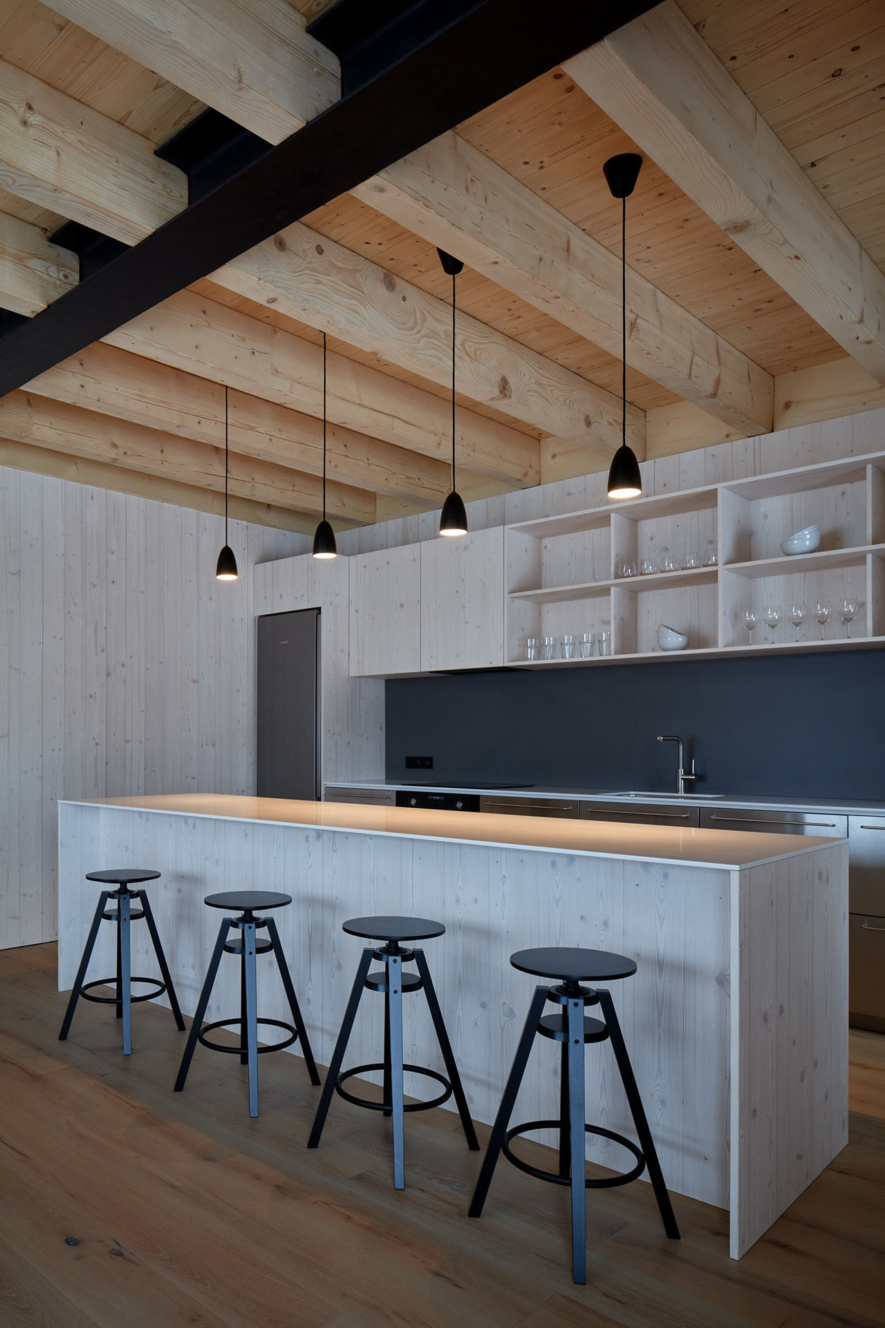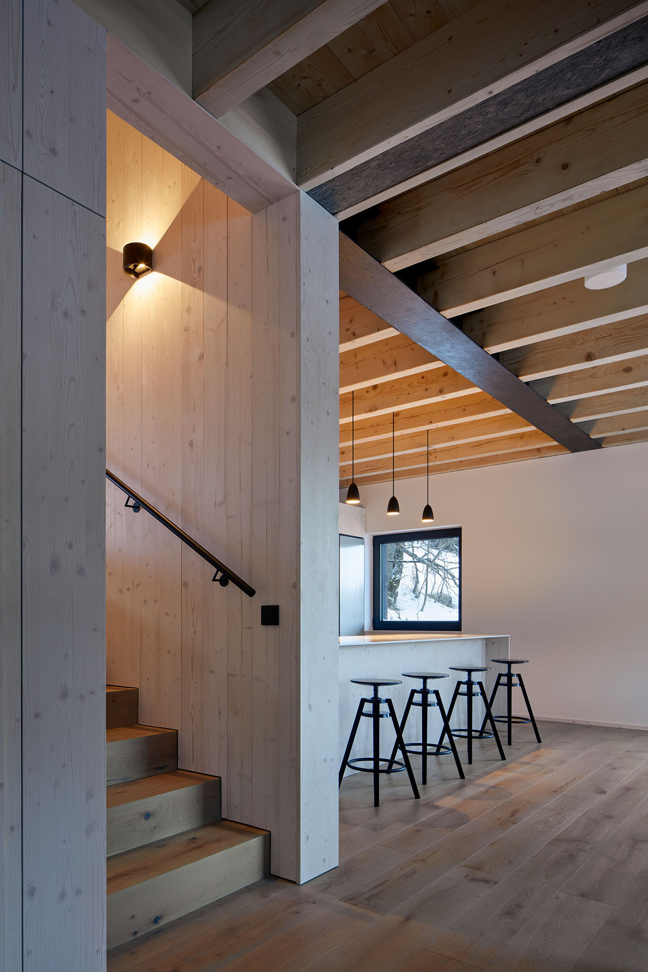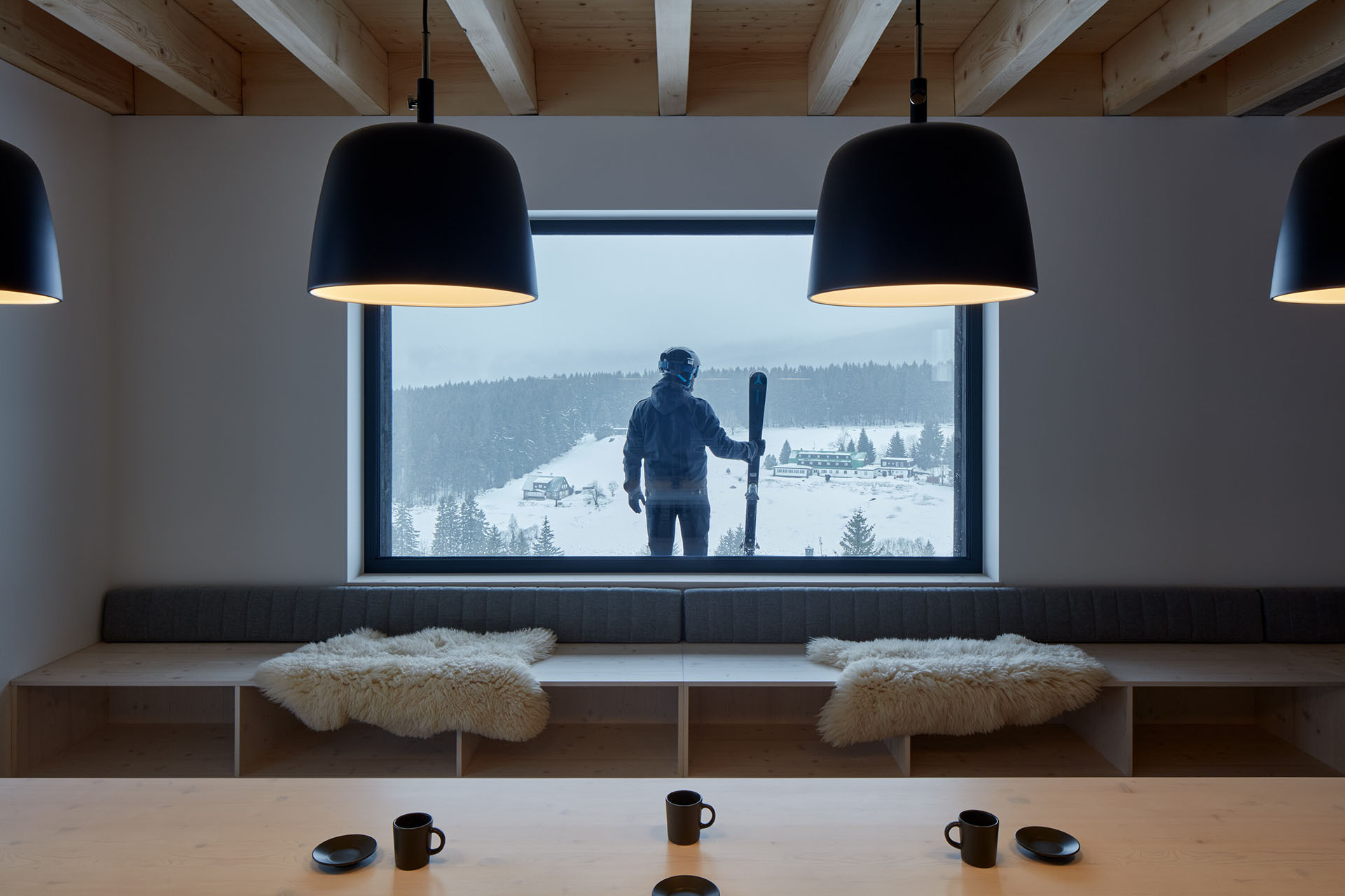 Chalupa dokáže pohostit až 16 hostů najednou. Architekti zde trochu „kouzlili“ s vnitřním uspořádáním. Do chalupy se vstupuje přímo ze sjezdovky, kdy se ocitnete v přízemí. Tady najdete hlavní společný prostor s kuchyní a jídelnou, dále technické zázemí a úložný prostor.