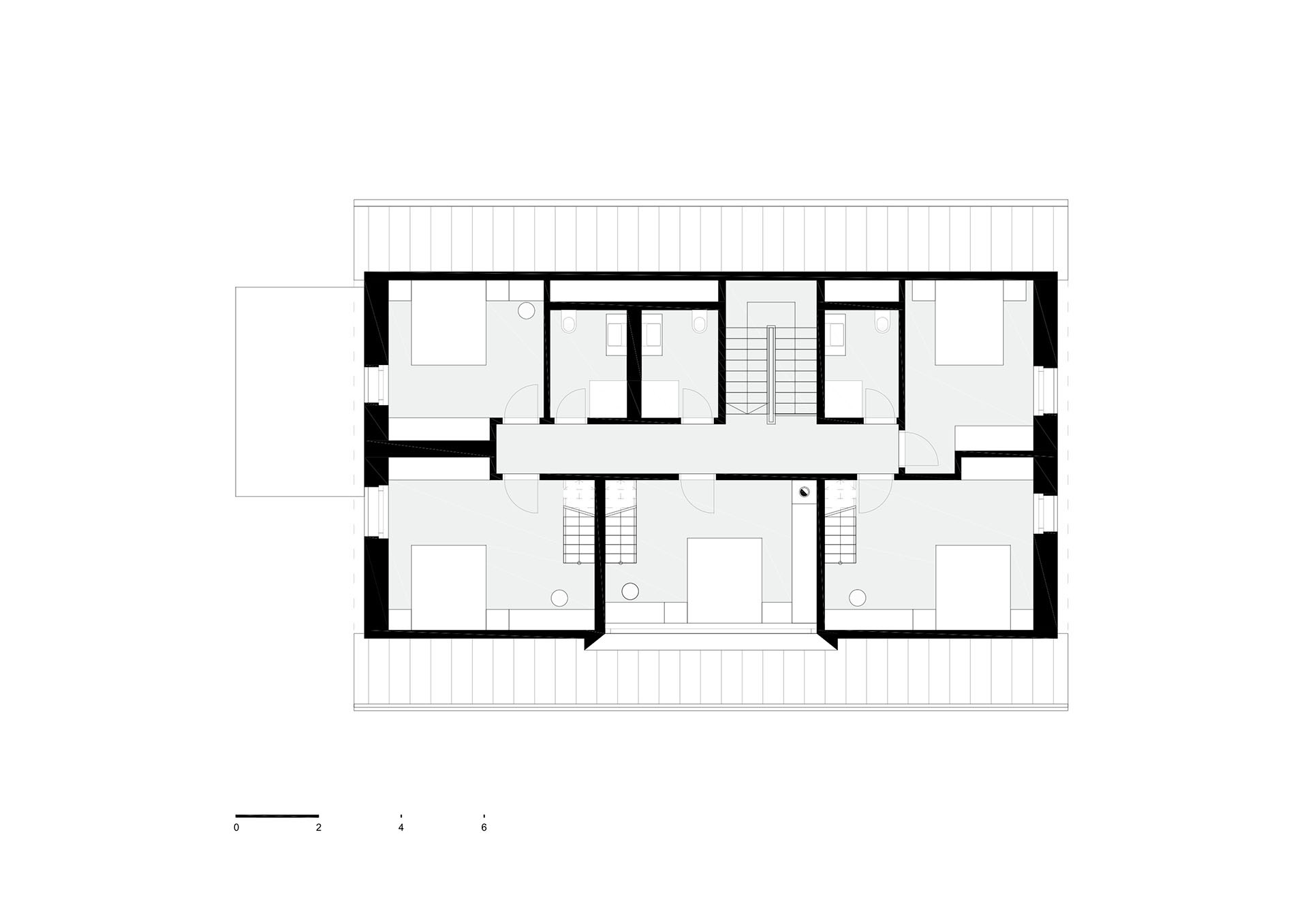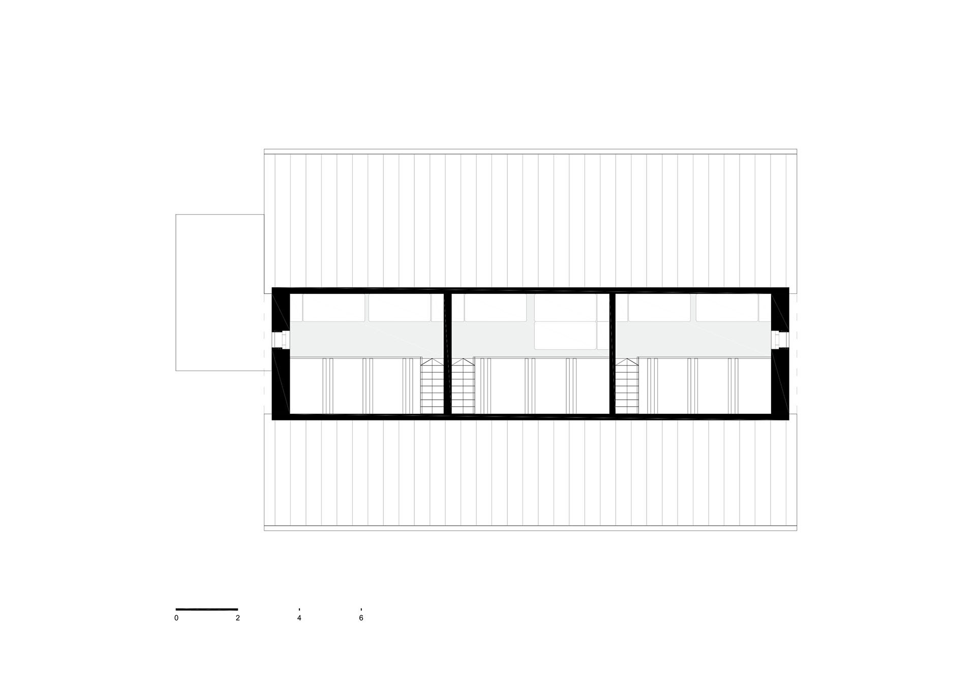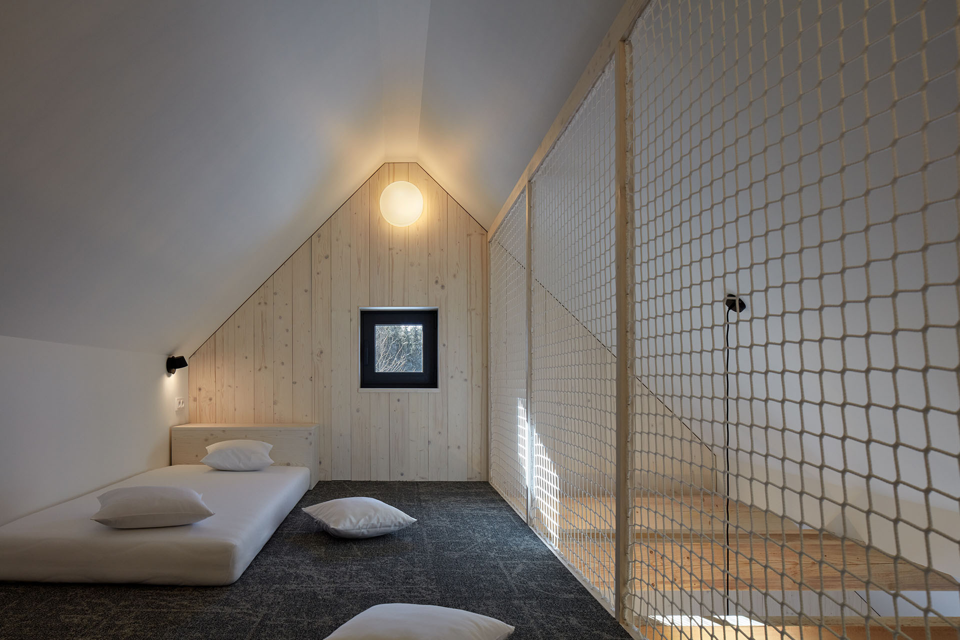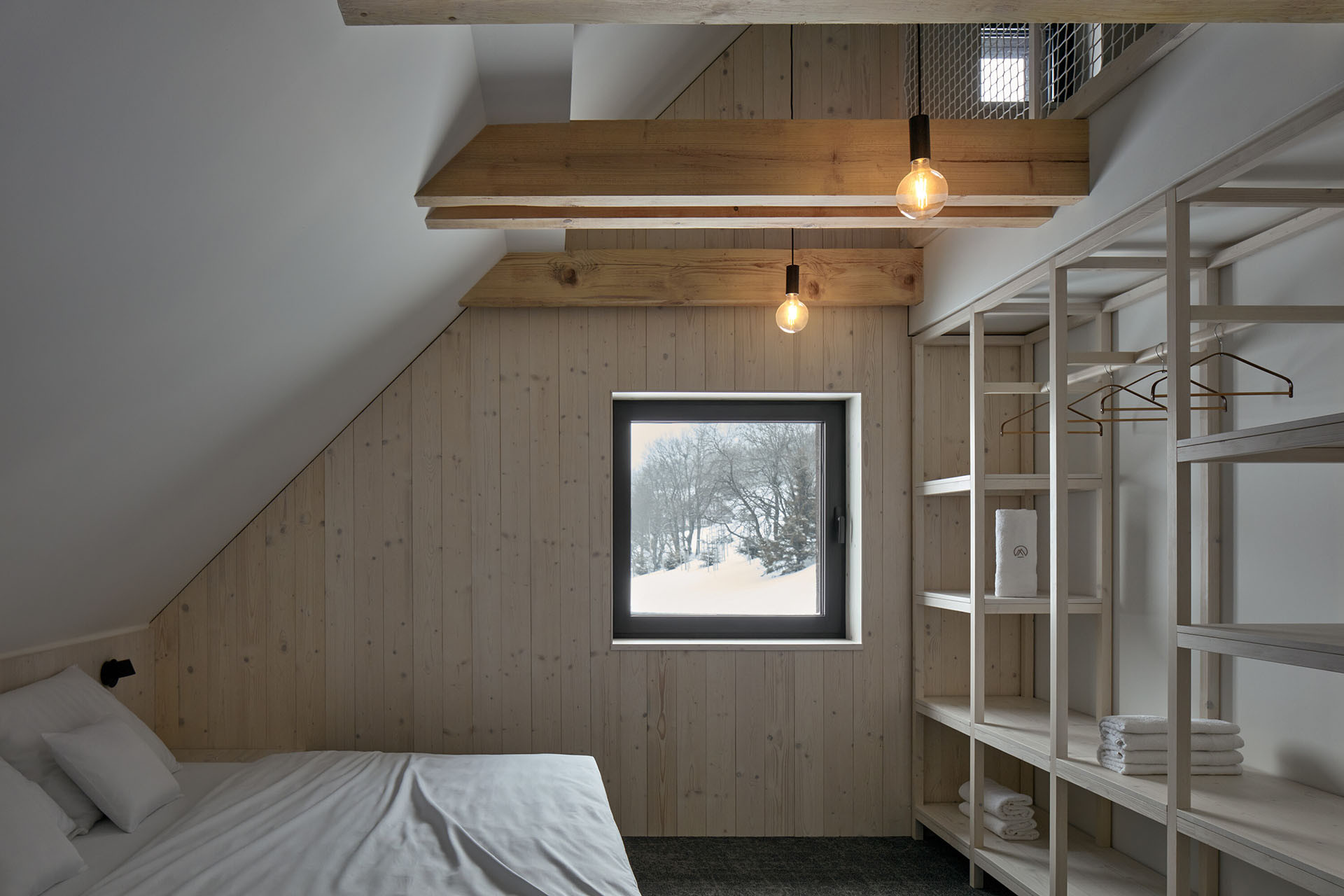 Do druhého patra se podařilo umístit pět ložnic. Jsou sice malé, ale mají vše, co potřebujete ke kvalitnímu odpočinku po dlouhé horské túře nebo celodenním lyžováním. V hlavních ložnicích, které jsou orientované na jih na vás čeká překvapení. Každá z nich má samostatné schodiště, které vede do dalšího spacího patra umístěného v krovu domu. Působí to útulně a například pro děti to může být zábavným místem, kde si hrát a spát.