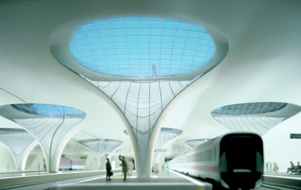 Stavba a takzvané „osvětlovací kužely“ propojují úroveň nástupišť s náměstím a parkem nahoře. Rozličné široké průhledy spolu s elegancí nosných konstrukcí propůjčují hlavnímu nádraží nezaměnitelnou identitu. Tvar podpor modulární skořápky je založen na systému inverzního zavěšení.