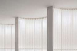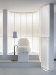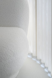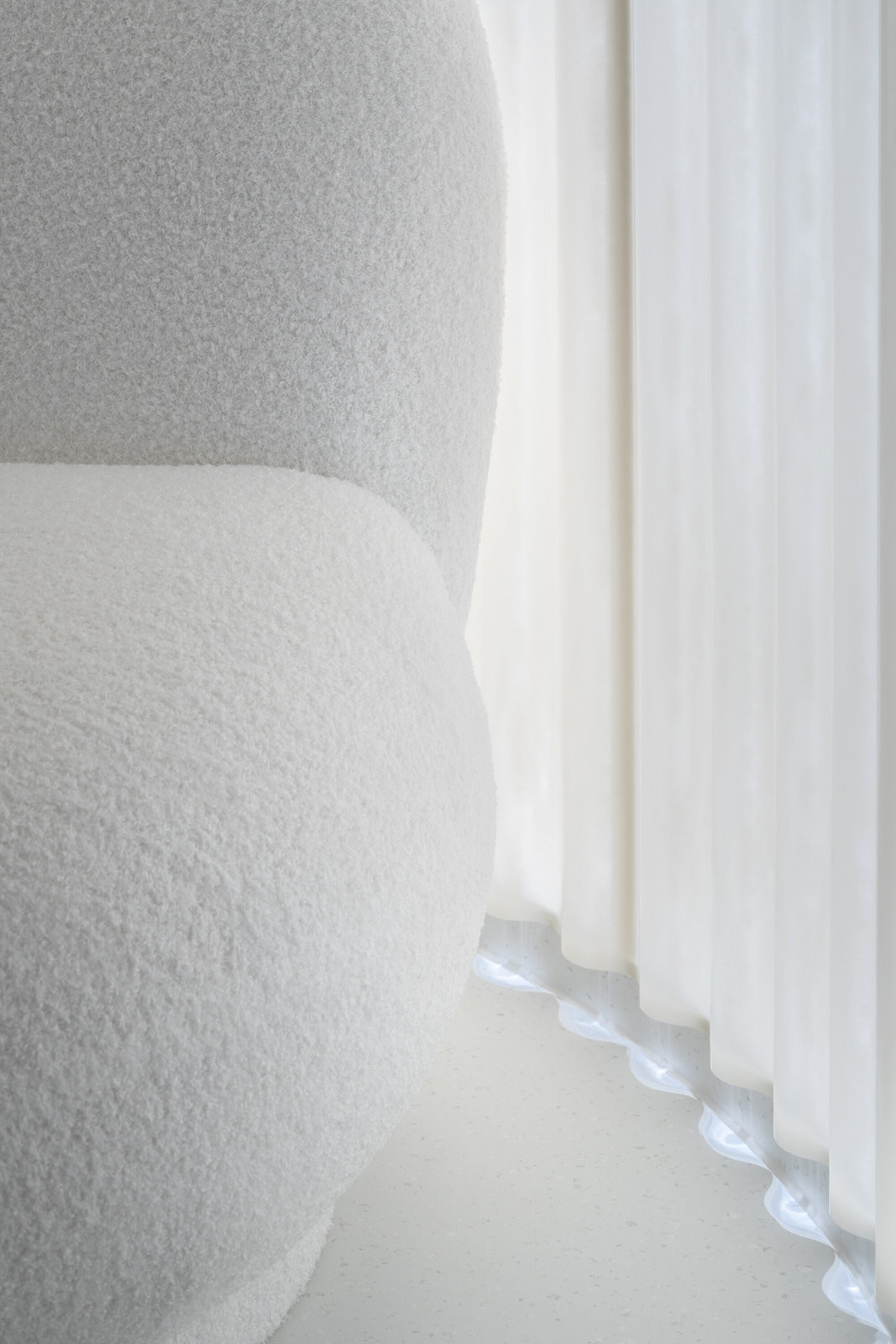 K dramatickému dojmu přispívají i použité materiály, zejména průsvitný sklolaminát, který prosvětlují reflektory a lze přes něj pozorovat stínohru pohybů. Ostatní materiály, tvary i vizuální prvky jsou klidné, světlé a nenápadné, takže jakkoliv je prostor speciální a dramatický, zákazník tu může také vypnout a relaxovat.