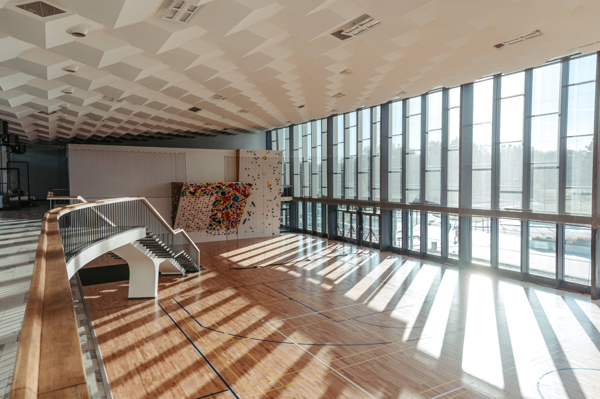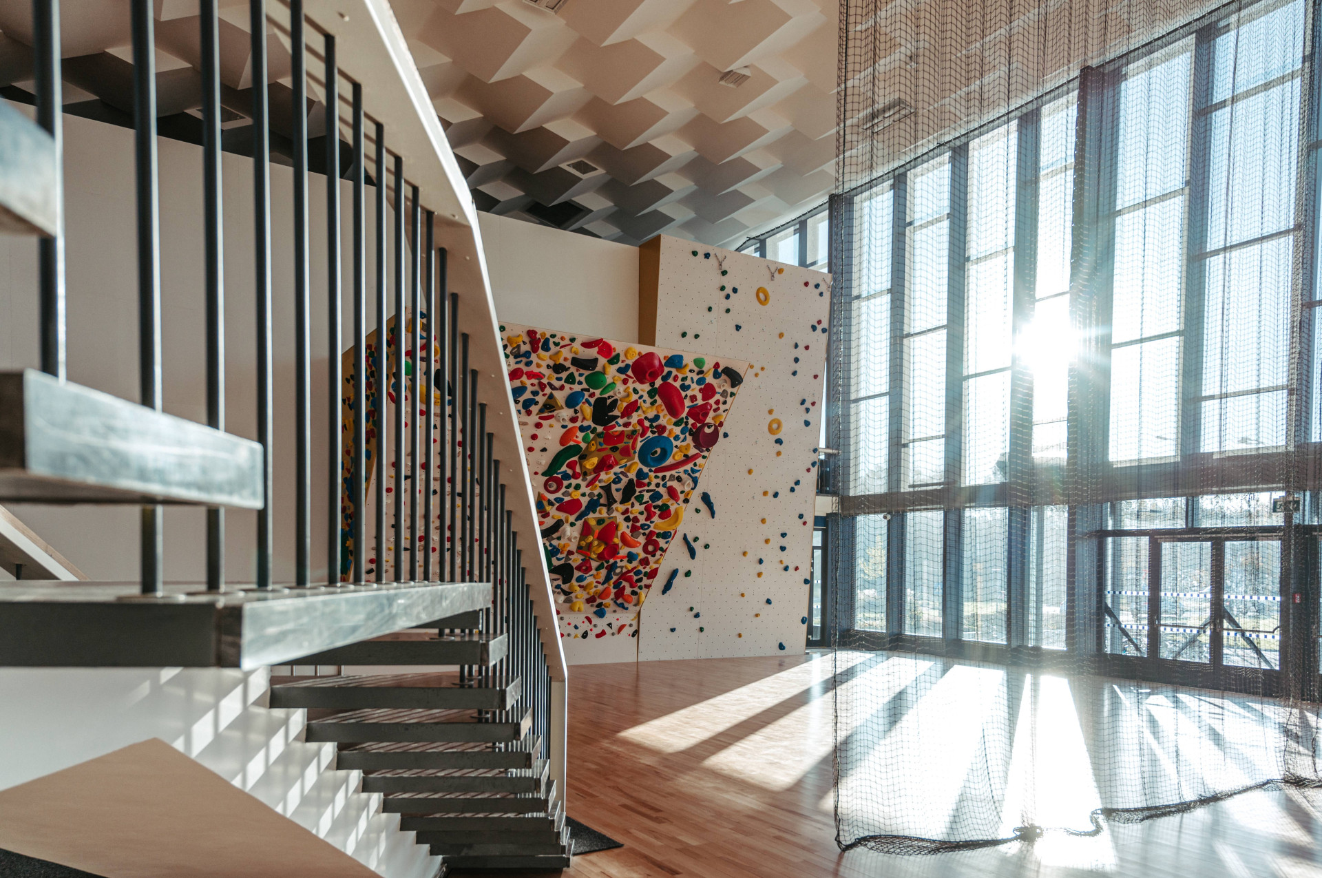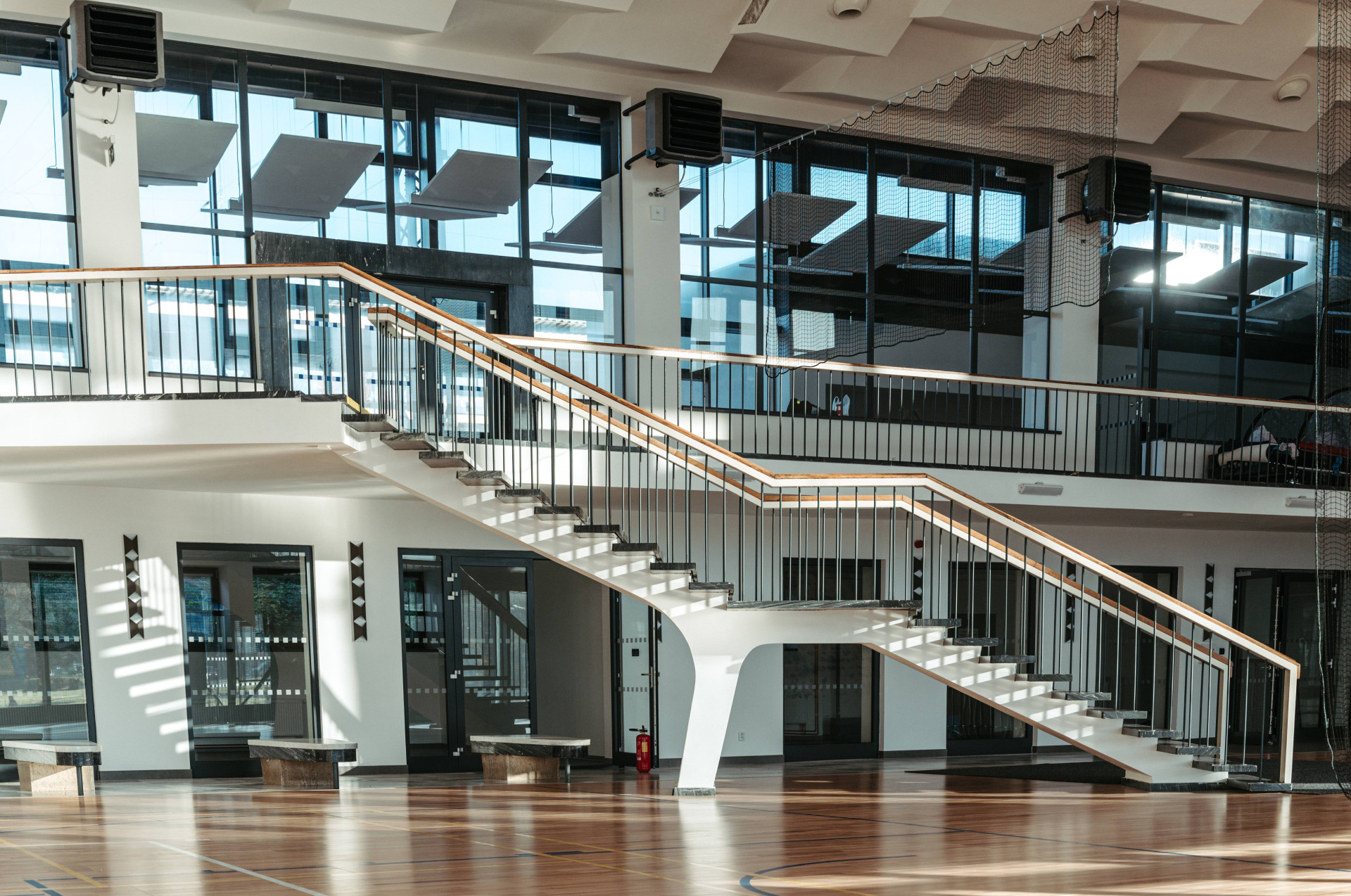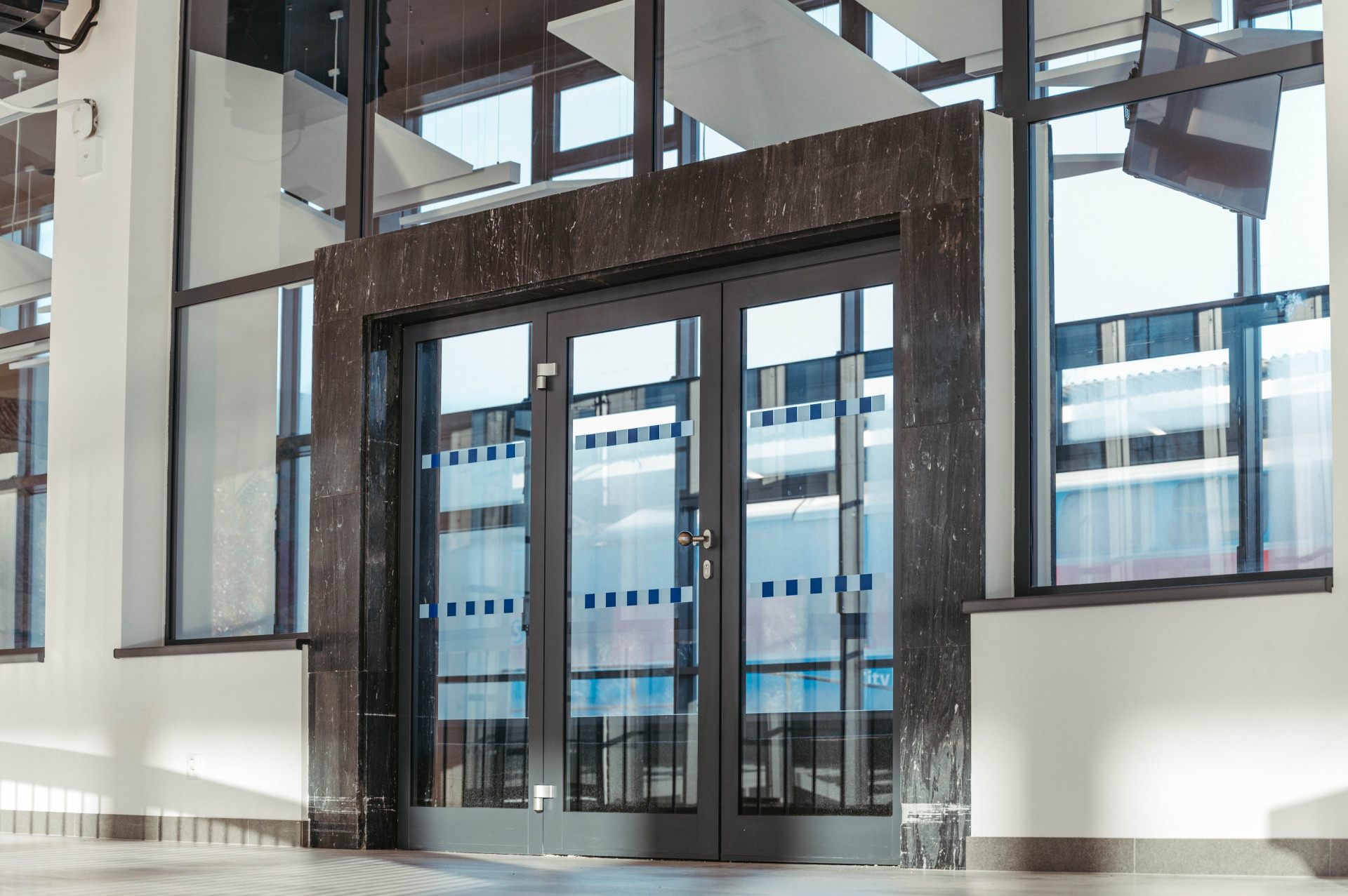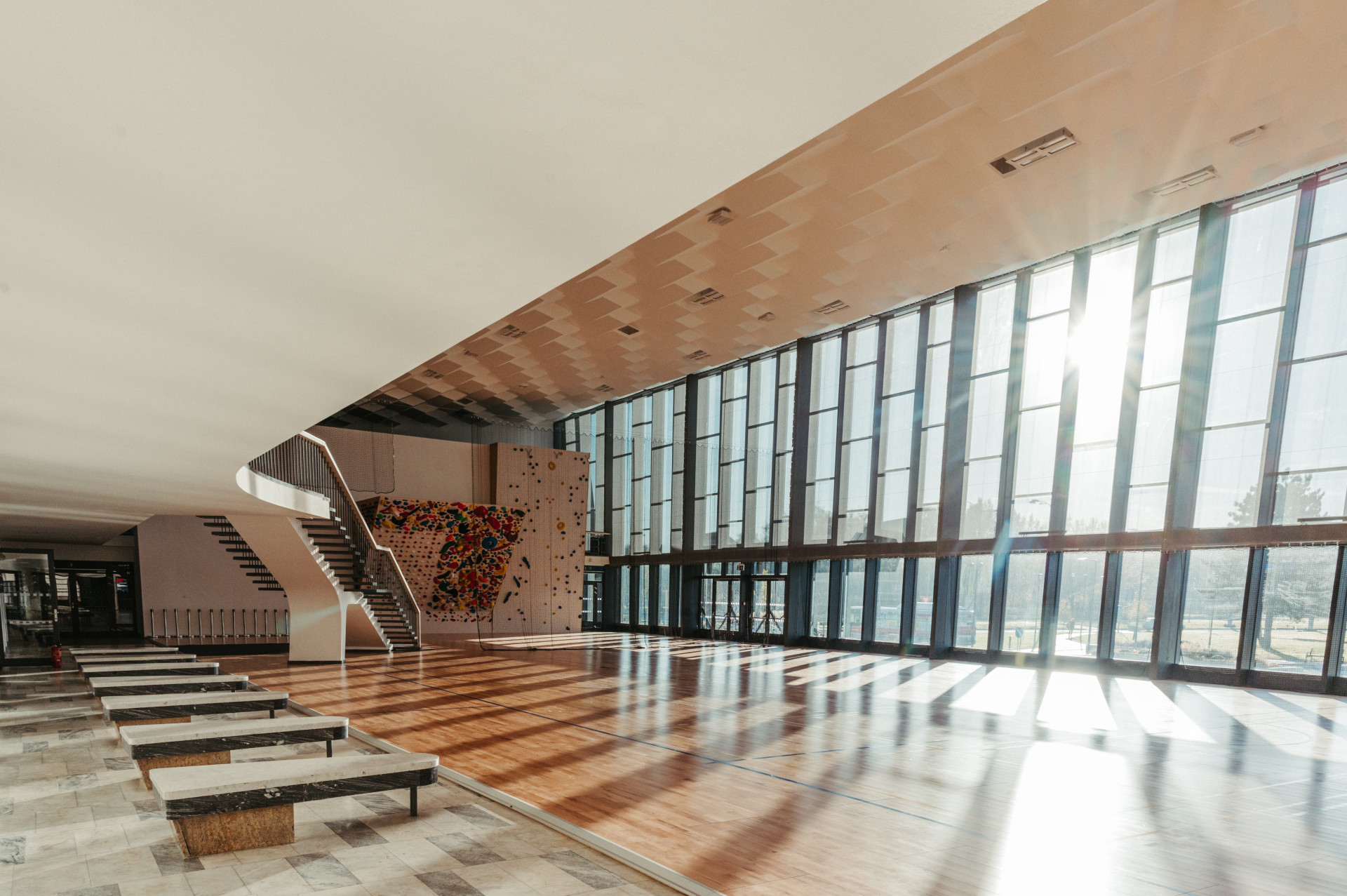 Všechny tyto prvky byly zachovány – repasovány nebo modernizovány. Aby budova mohla dobře sloužit svému novému účelu sportovně-kulturního centra, bylo zapotřebí primárně vyměnit zmiňovanou prosklenou fasádu a střechu. To se podařilo díky moderním okenním a fasádním hliníkovým systémům firmy Aluprof, které zachovaly příznačnou subtilní profilaci rámů. „Kromě prosklených fasád, které plně respektují původní členění, se v celém objektu měnila i okna. Specifické ale je to, že všechny zmíněné konstrukce zároveň splňují přísný požadavek bezpečnostní třídy RC3 – jak okna, dveře, tak i právě prosklené fasády. Všude jsou nově osazena tepelně izolační trojskla, takže díky novým konstrukcím se zásadním způsobem zlepšila i úspora tepla v celém objektu,“ vysvětluje Tomáš Buček, Project Manager Aluprof.