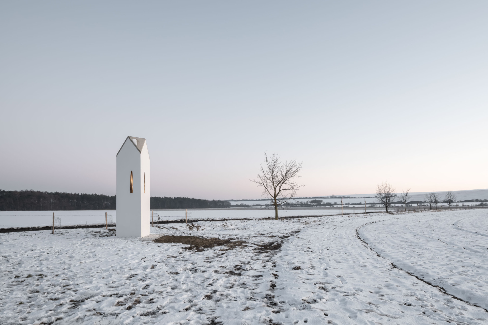Kaple u Čečelic vznikla na místě původní kaple, která byla v 60. letech zbořená. Nyní nová, jasně bílá kaplička, září do dálky. S trojúhelníkovým půdorysem, podle návrhu ateliéra Chrama, uvnitř ukrývá sochu Panny Marie - zhotovenou 3D tiskem podle ustáleného vzoru. Lze ji vidět pouze drobnou dutinkou – z každé strany, vždy trošku jinak. Dostatečně skrytá tak nabízí i moment překvapení.