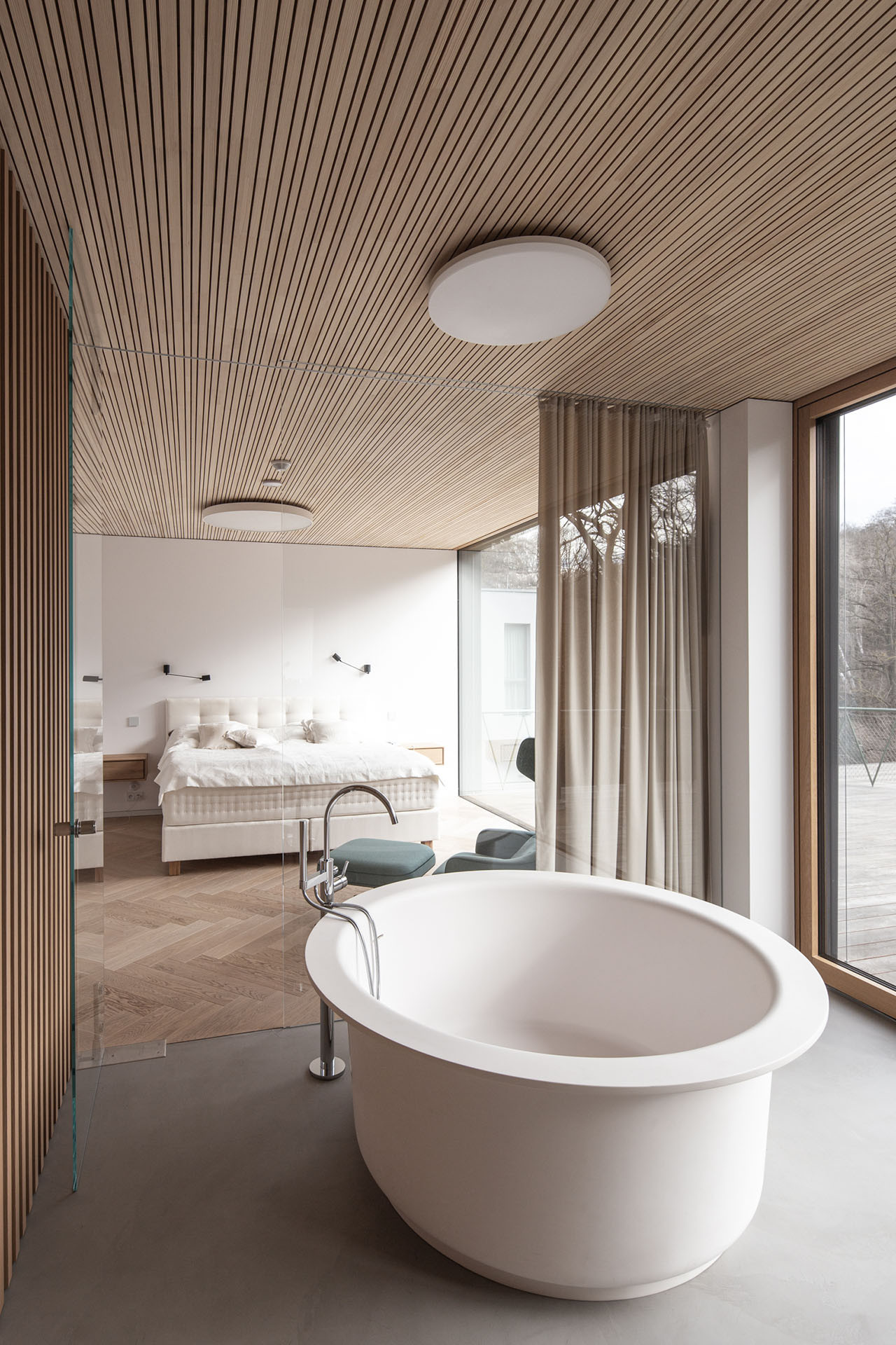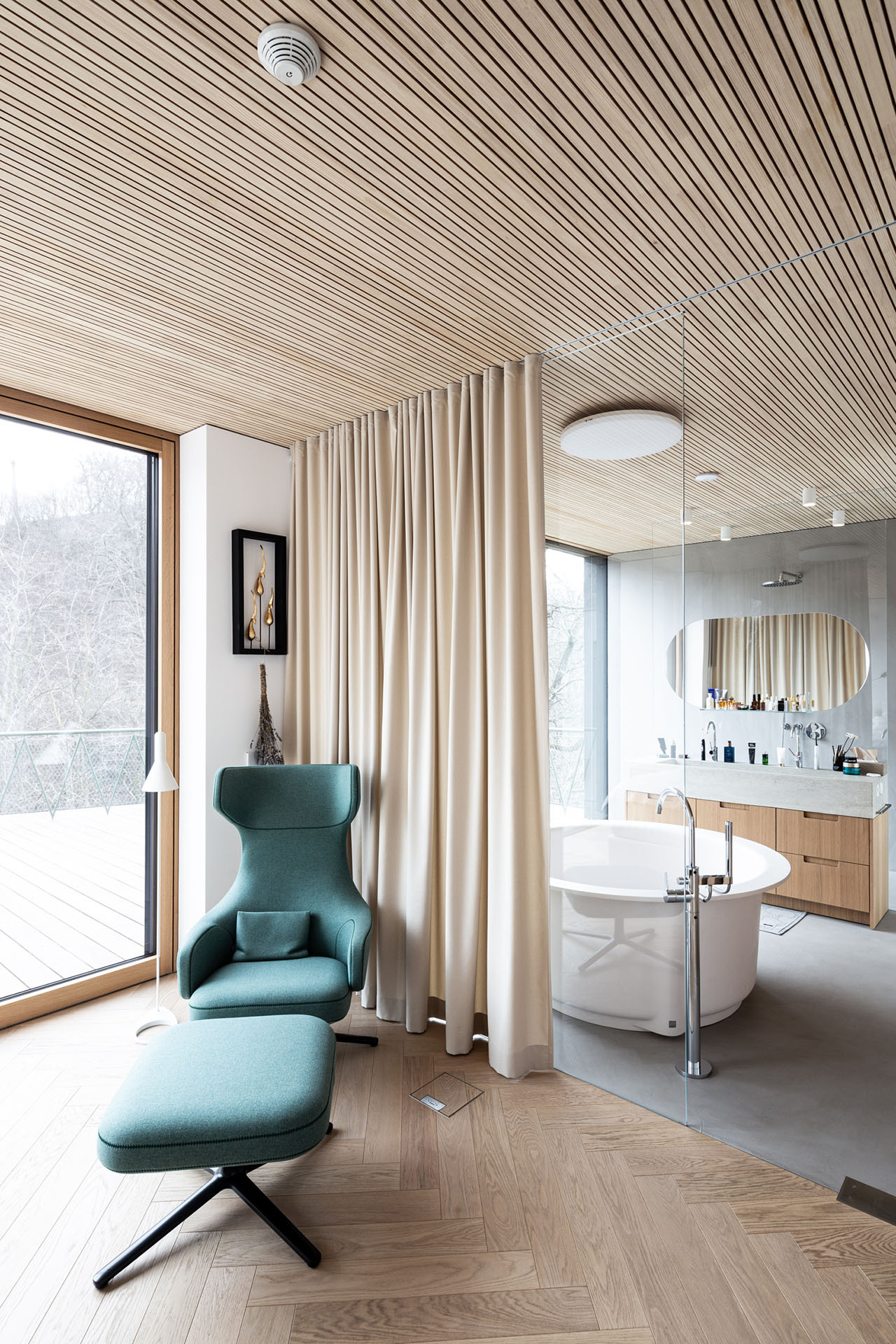 Obývací pokoj dále navazuje na dřevěnou terasu, která je vykonzolovaná nad strmý svah. Dům má ale teras hned několik. Třeba na té jihozápadní je umístěn malý bazén a také sauna, kde rodina relaxuje.