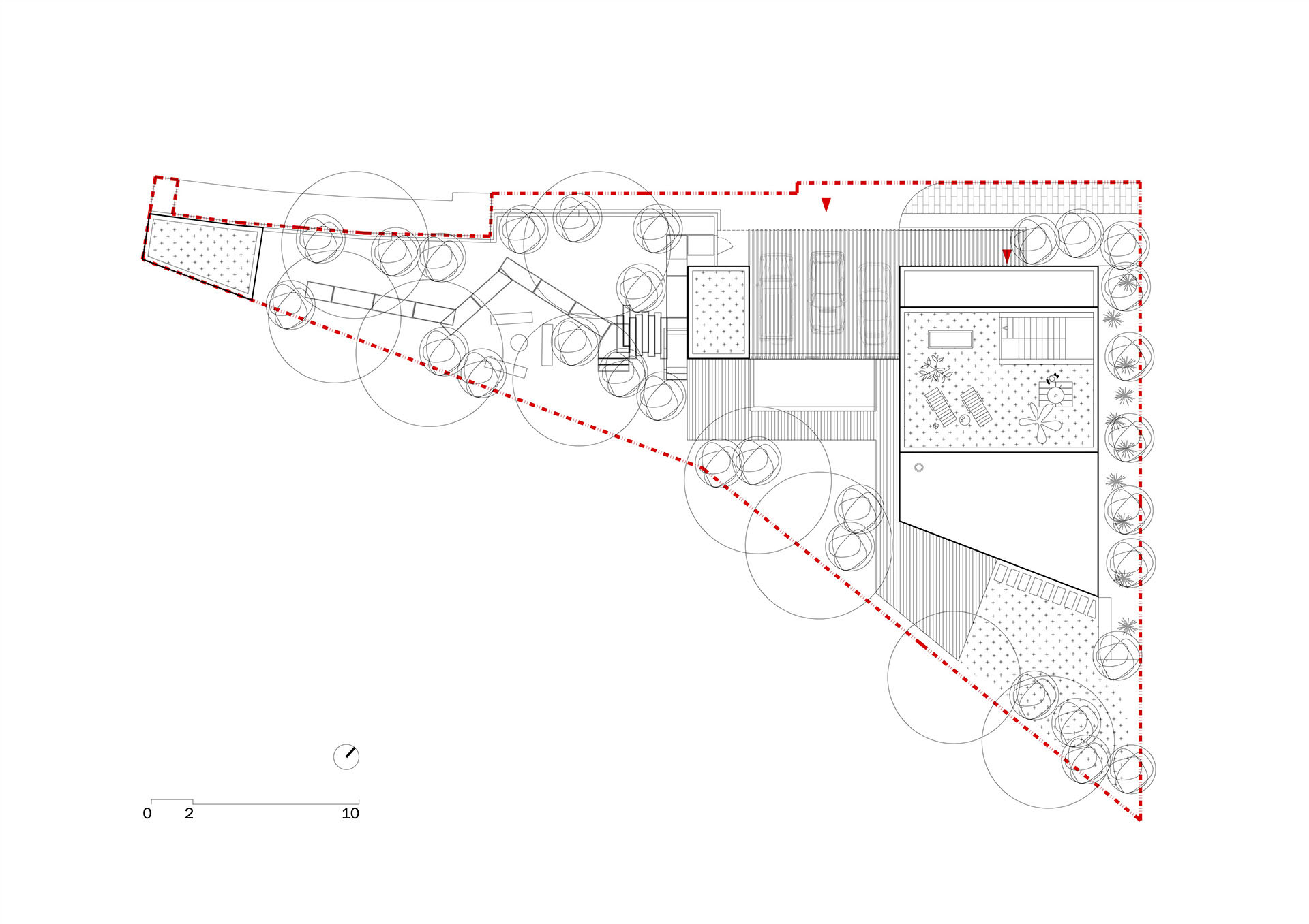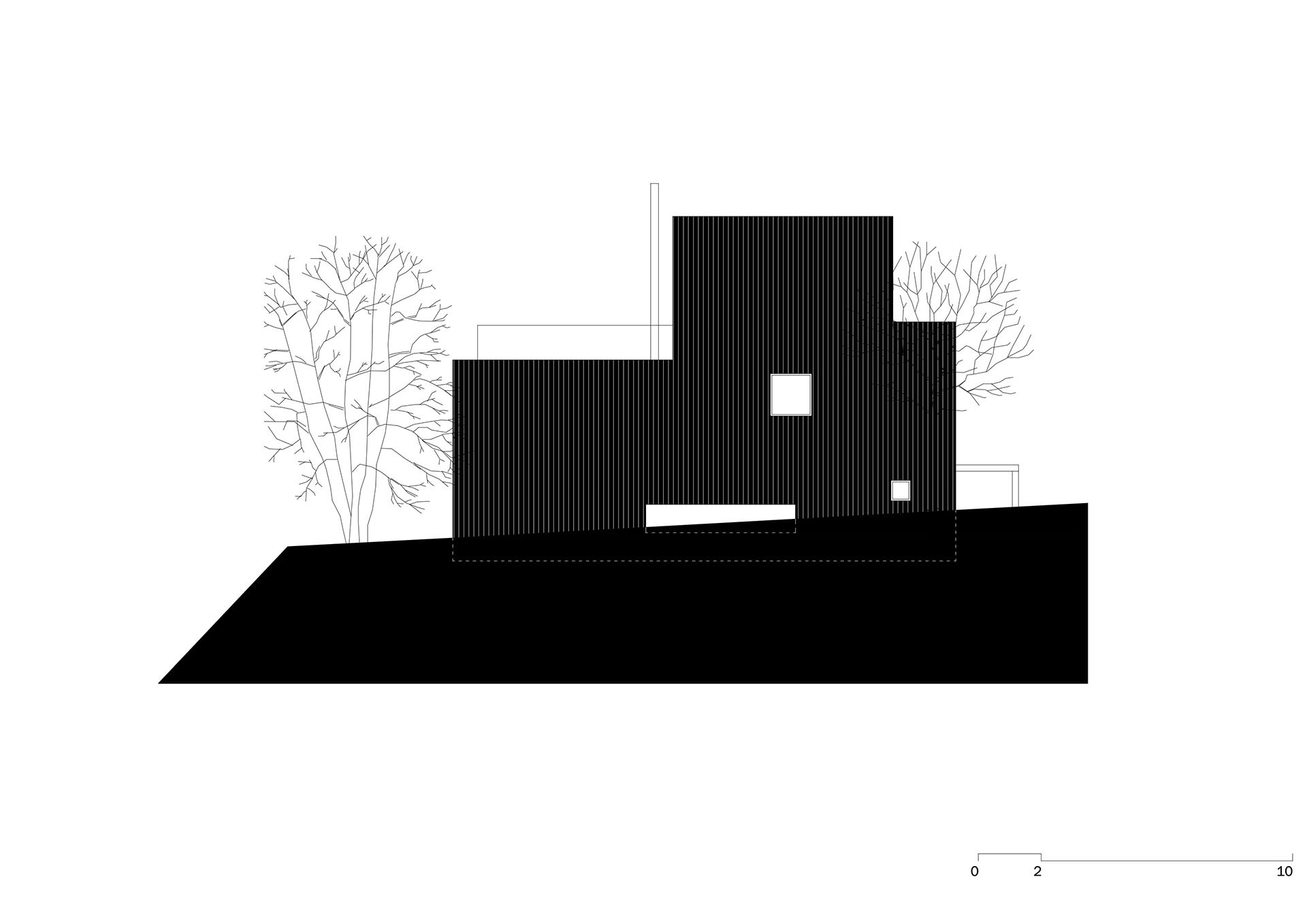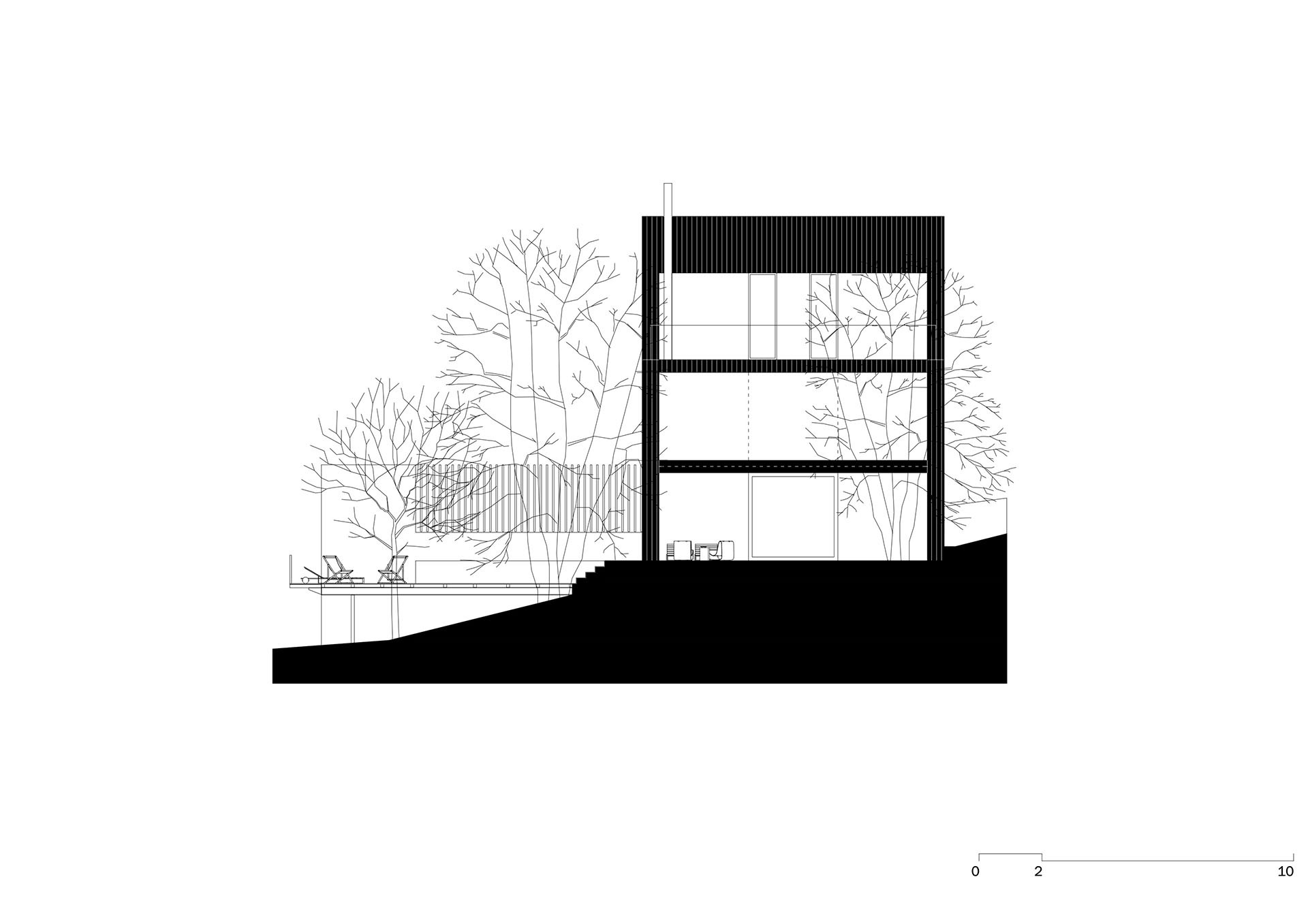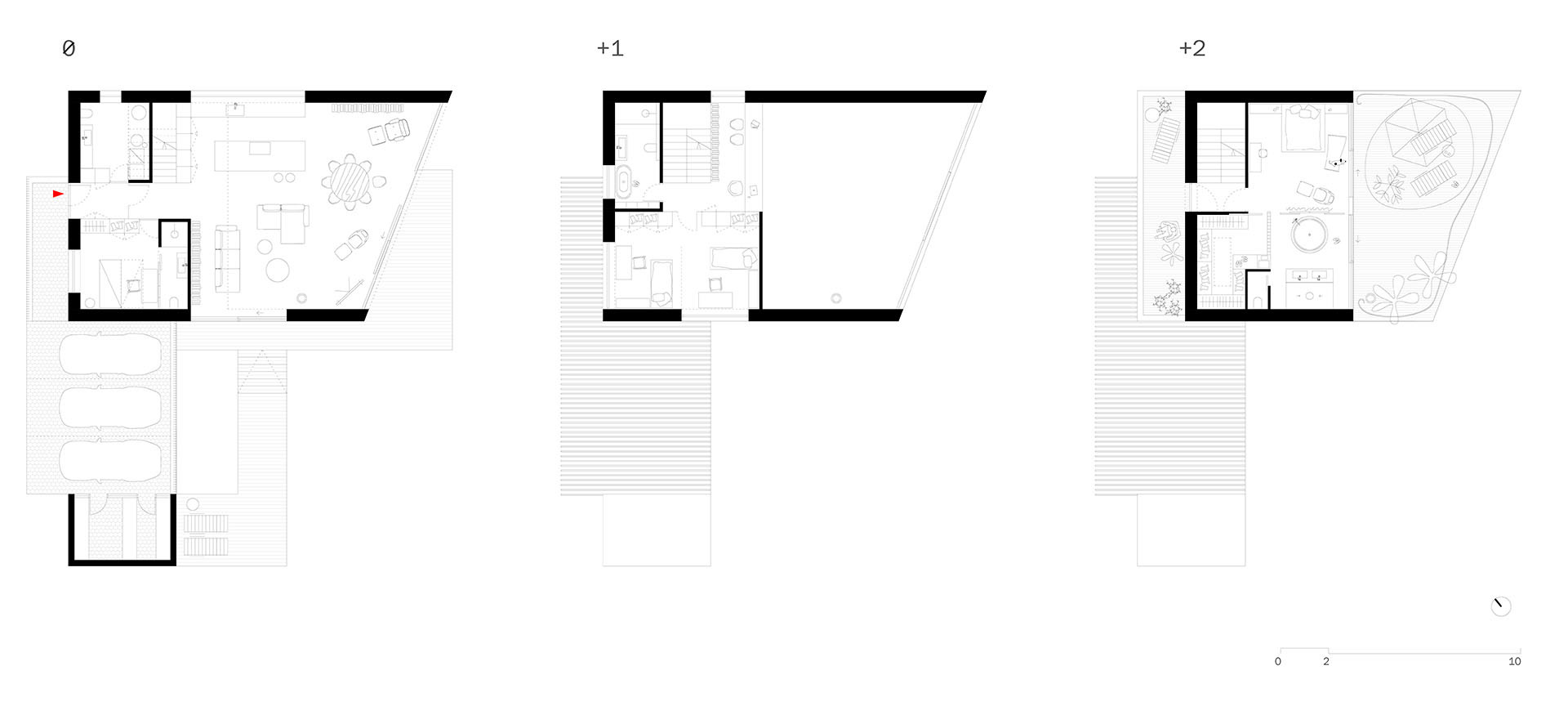 To, jak vypadá finální podoba rodinného domu, určily dva faktory. Tím prvním je svah, ve kterém se dům nachází. Je poměrně prudký, podélný sklon pozemku je 8,5 m a příčný 4,2 m. Druhým faktorem, a taky požadavkem majitelů, byl výhled na hrad Devín. Architekti navrhli členitý dům, který reaguje na terén a přirozeně si na něj „sedá“. „Rodinný dům je primárně orientován do zeleně na jižní a západní straně. Uspořádání okenních otvorů na severní fasádě umožňuje výhledy na hrad Devín,“ říkají autoři ze studia plusminusarchitects.
