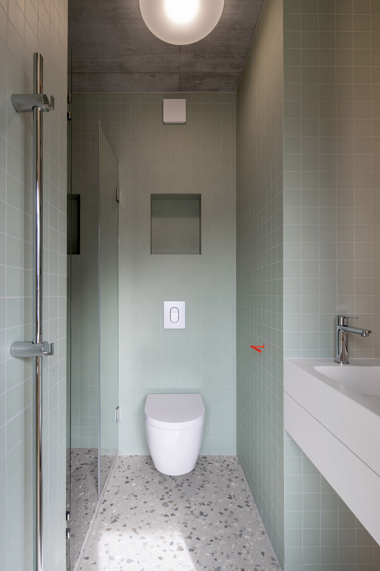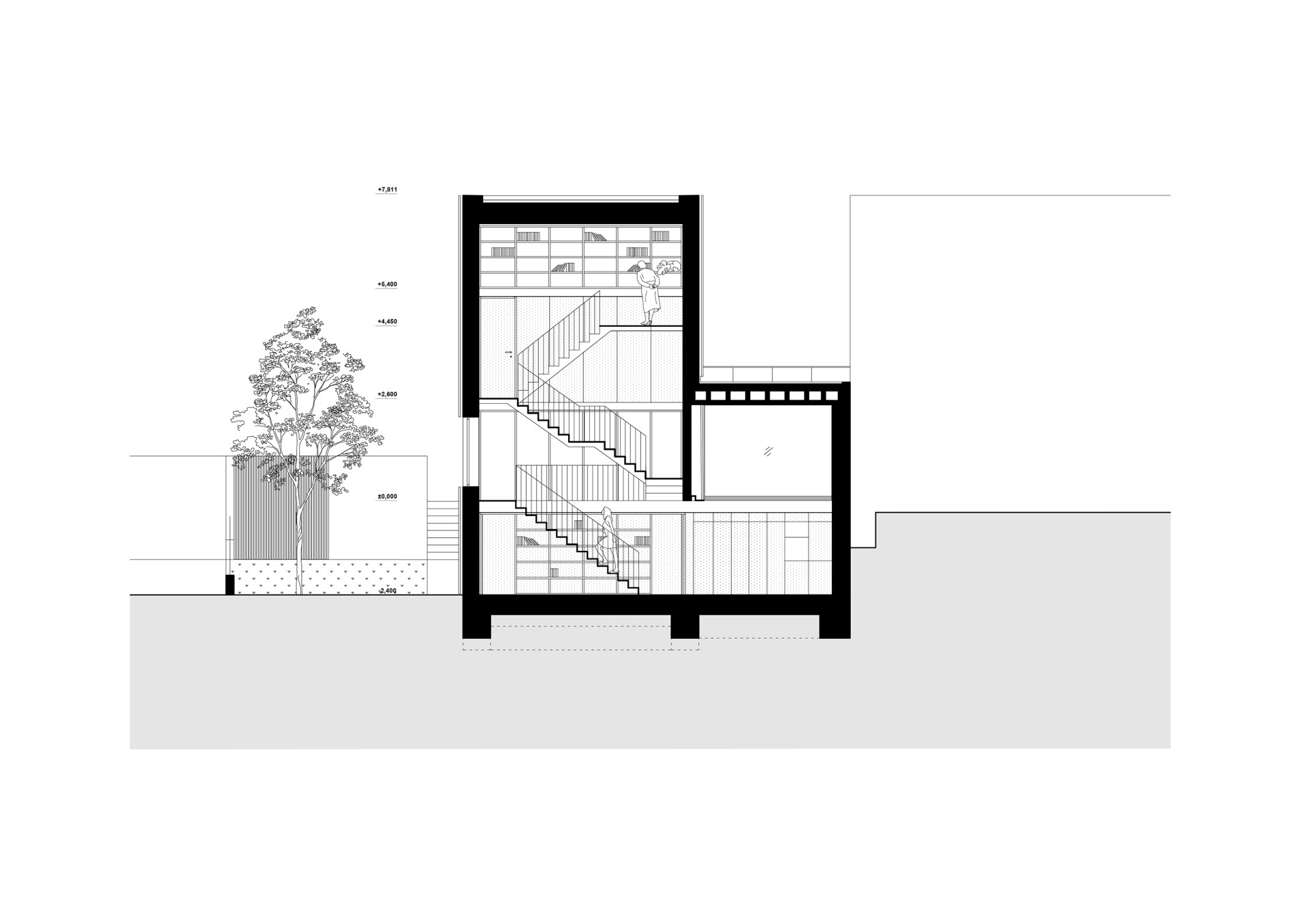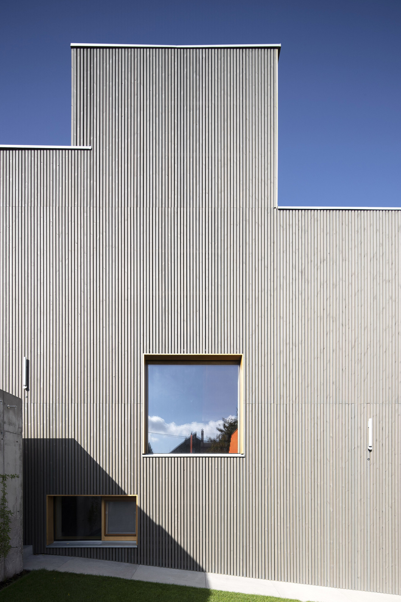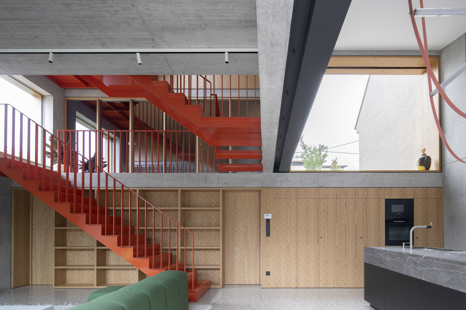 Výsledný dům je tedy skládačkou z několika objemů v několika výškových úrovních. Ve výšce ulice je vchod a technická místnost, po schodech se sejde do obývacího pokoje. Ten se otvírá přes prosklení do zahrady a lze odsud jít také do ložnice na místě bývalého zahradního domku. Nahoru se pokračuje do dětských pokojů a na terasu. Sytě oranžové schodiště je hlavní komunikací domu a zároveň tak trochu sochou, která se tu vznáší v prostoru.