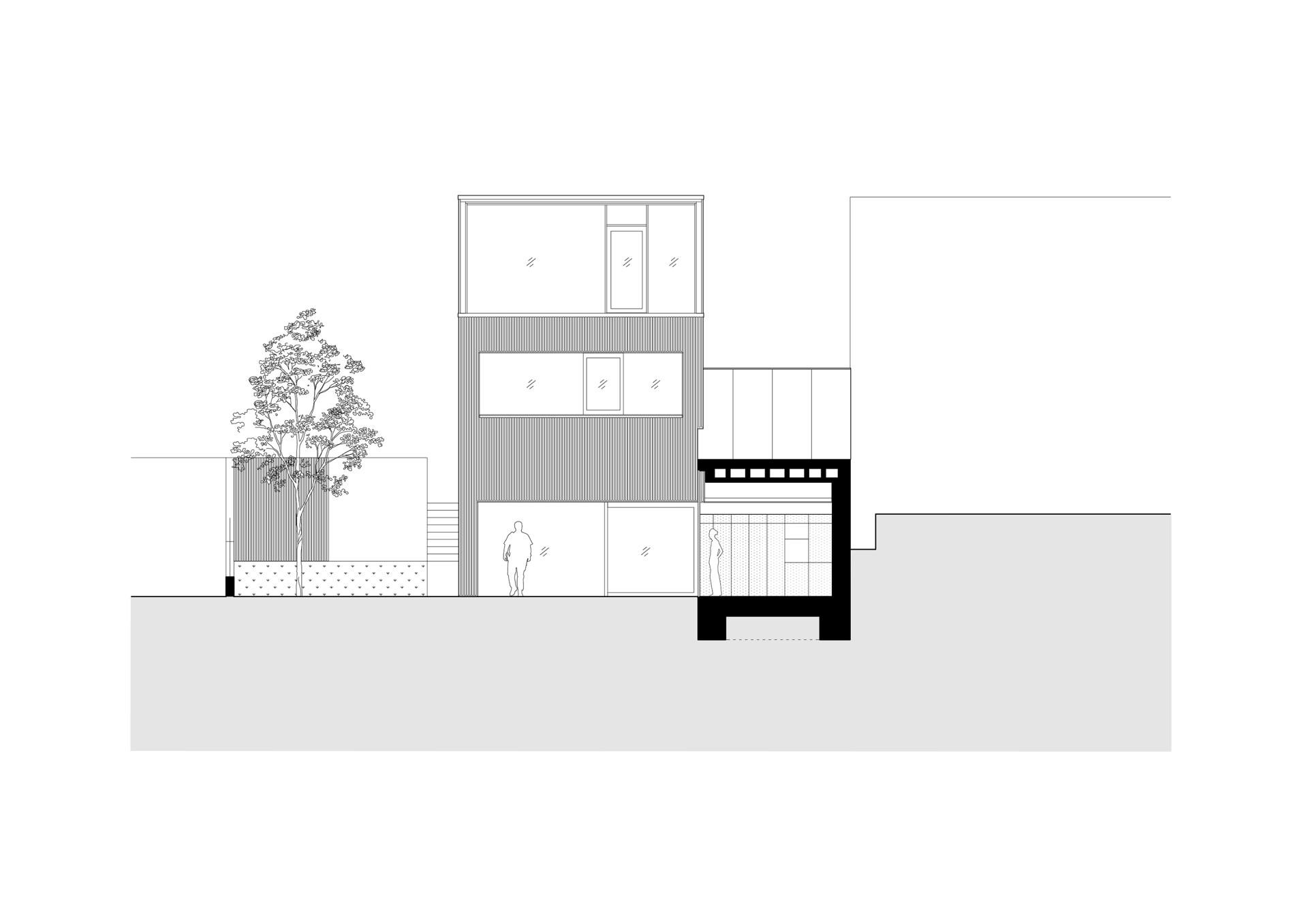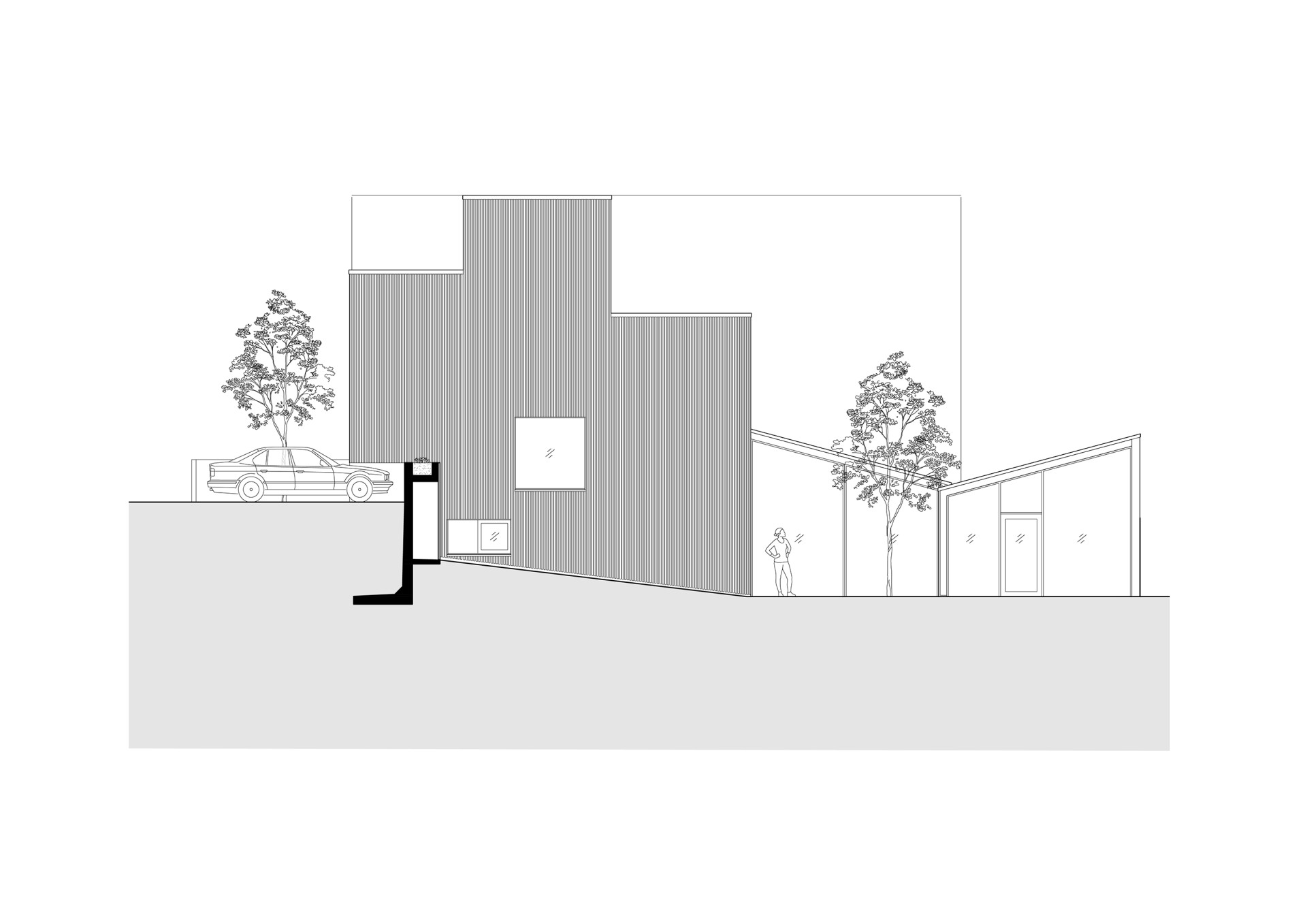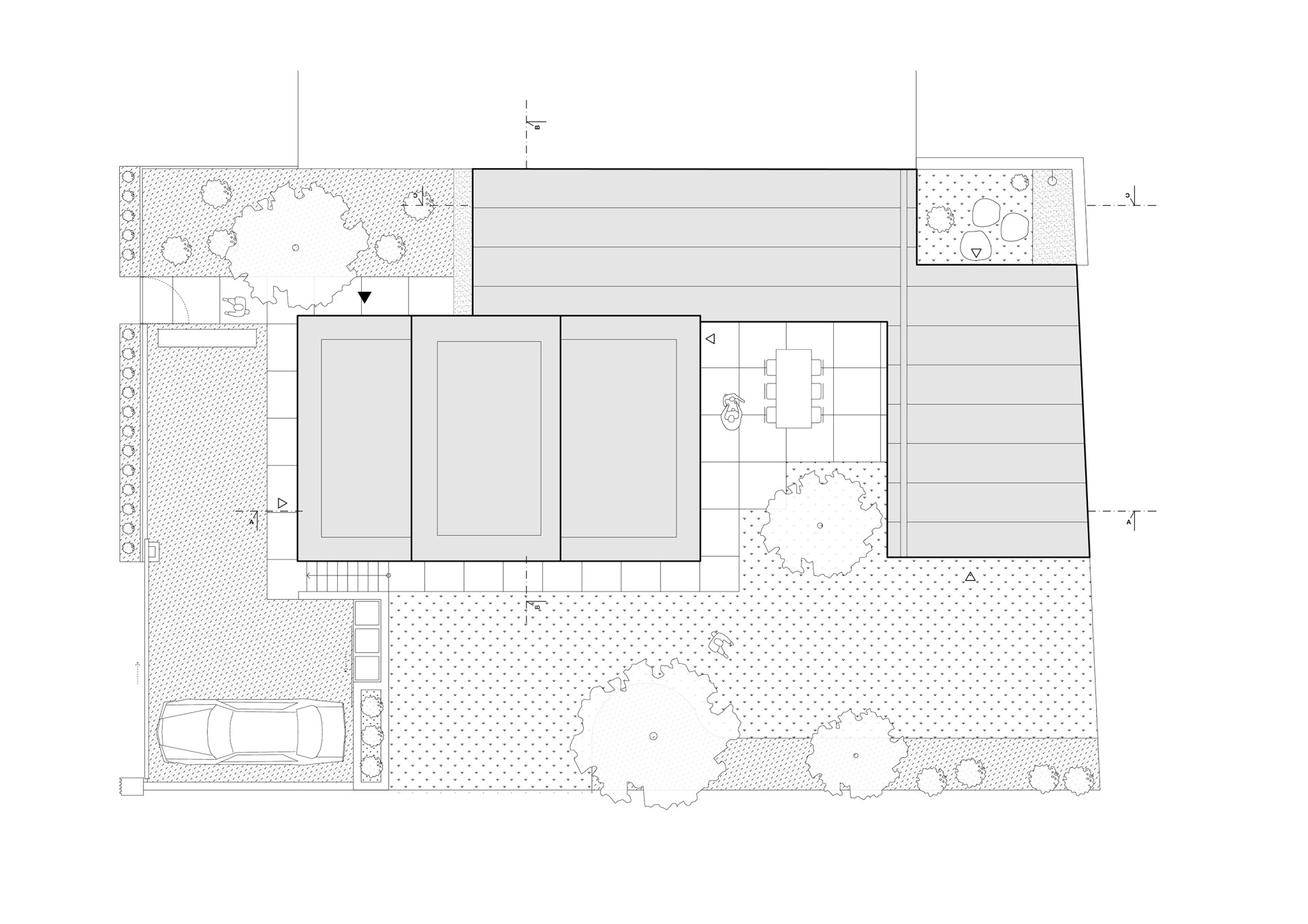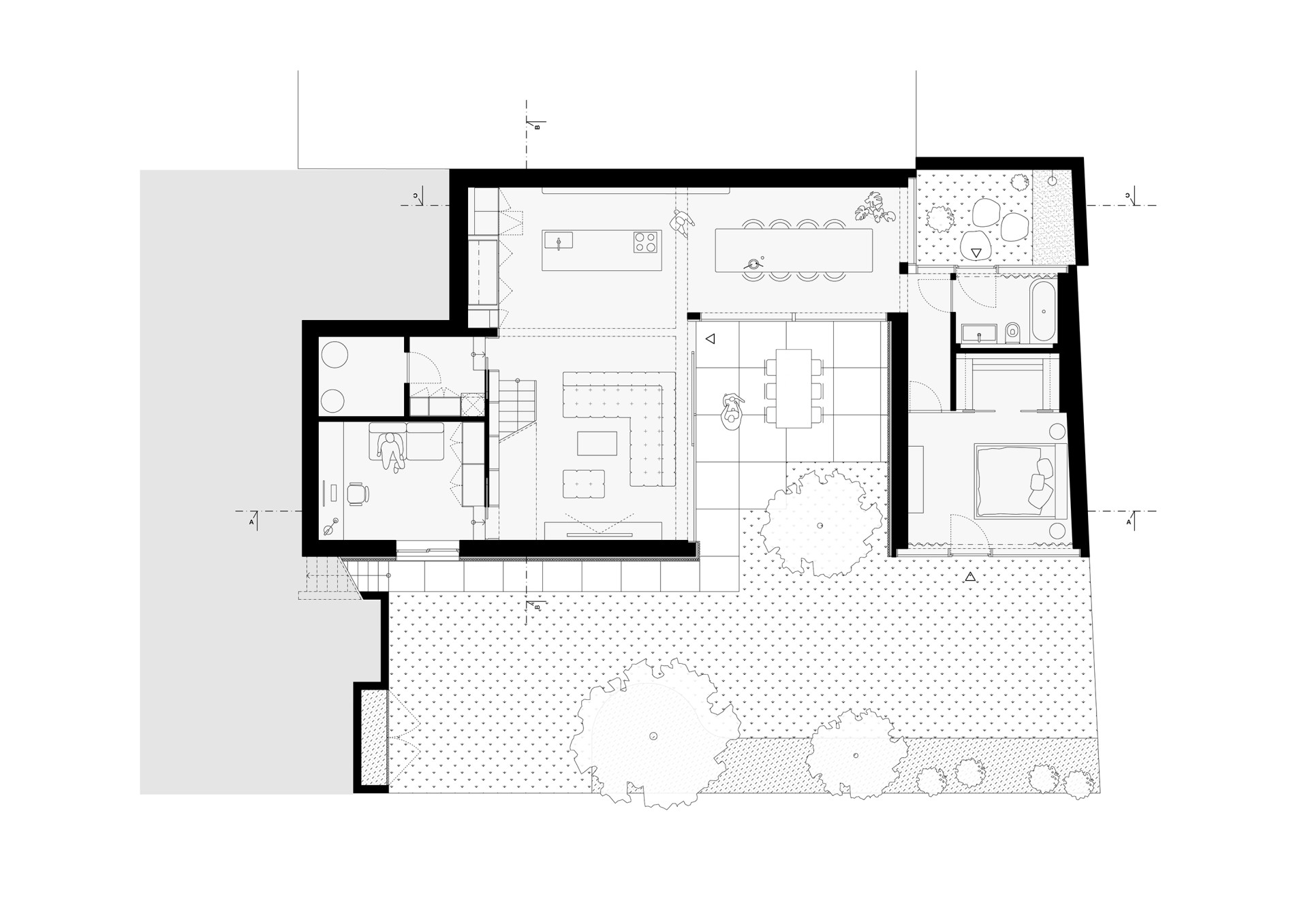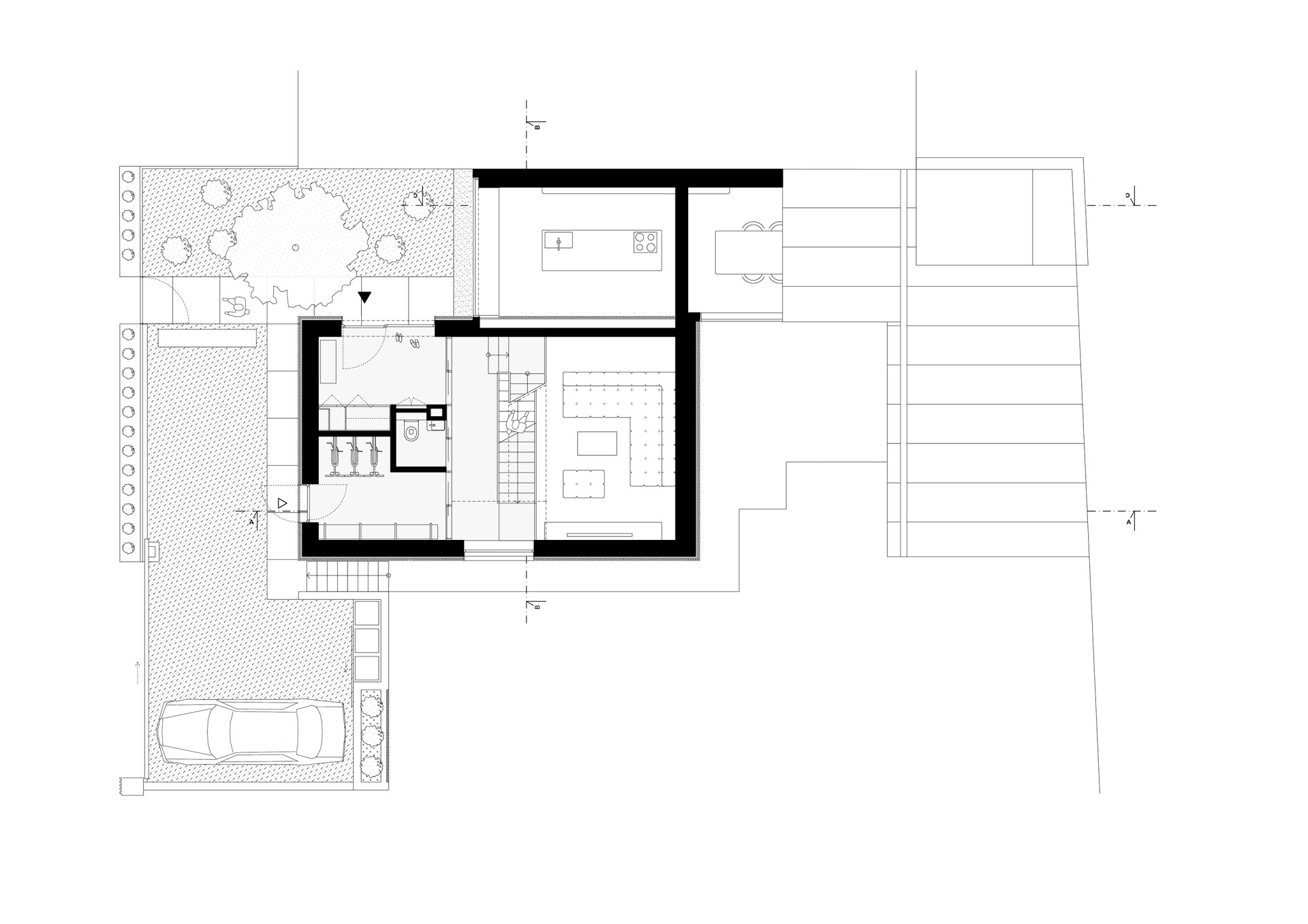 Architekti zároveň chtěli a museli navázat na stávající řešení – dle regulativů nebylo možné přesáhnout již zastavěné půdorysy. Bylo přitom potřeba získat co nejvíc podlahové plochy a propojit různé výškové úrovně terénu. A tomu všemu dát formálně ucelený, funkční tvar jednoho rodinného domu.