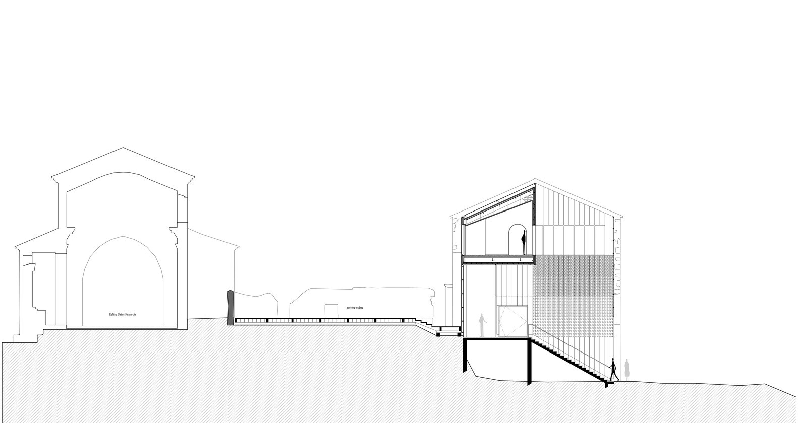 Klášter Saint-François byl v 15. století postaven ze žuly, měď se k němu teď přidala proto, že se architektce líbí, jak ji koroze v čase proměňuje. Může se kvůli ní dokonce úplně rozpadnout. „Líbila se mi myšlenka možného návratu ke zřícenině,“ dodává k tomu s nadsázkou.