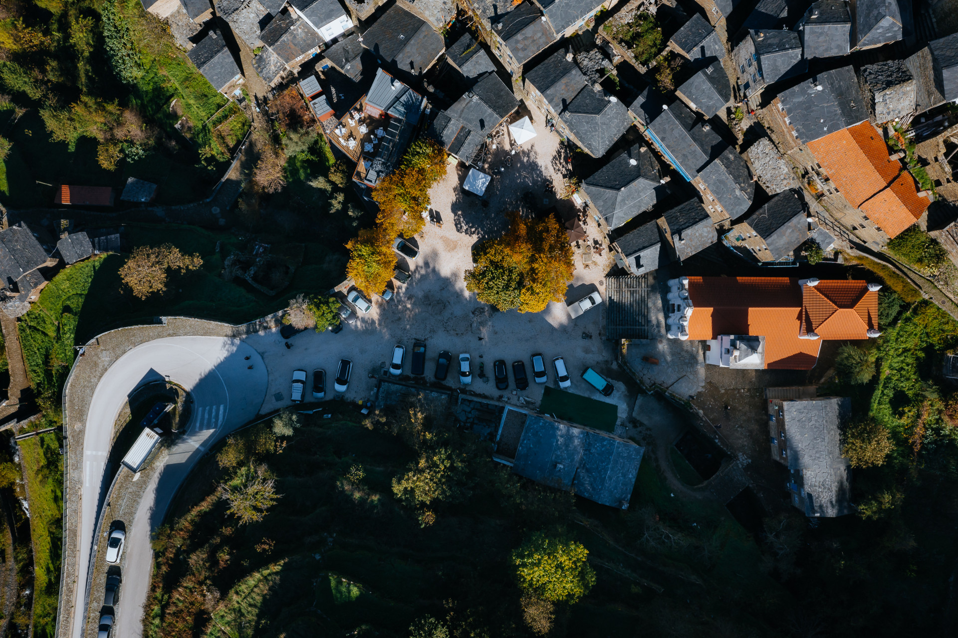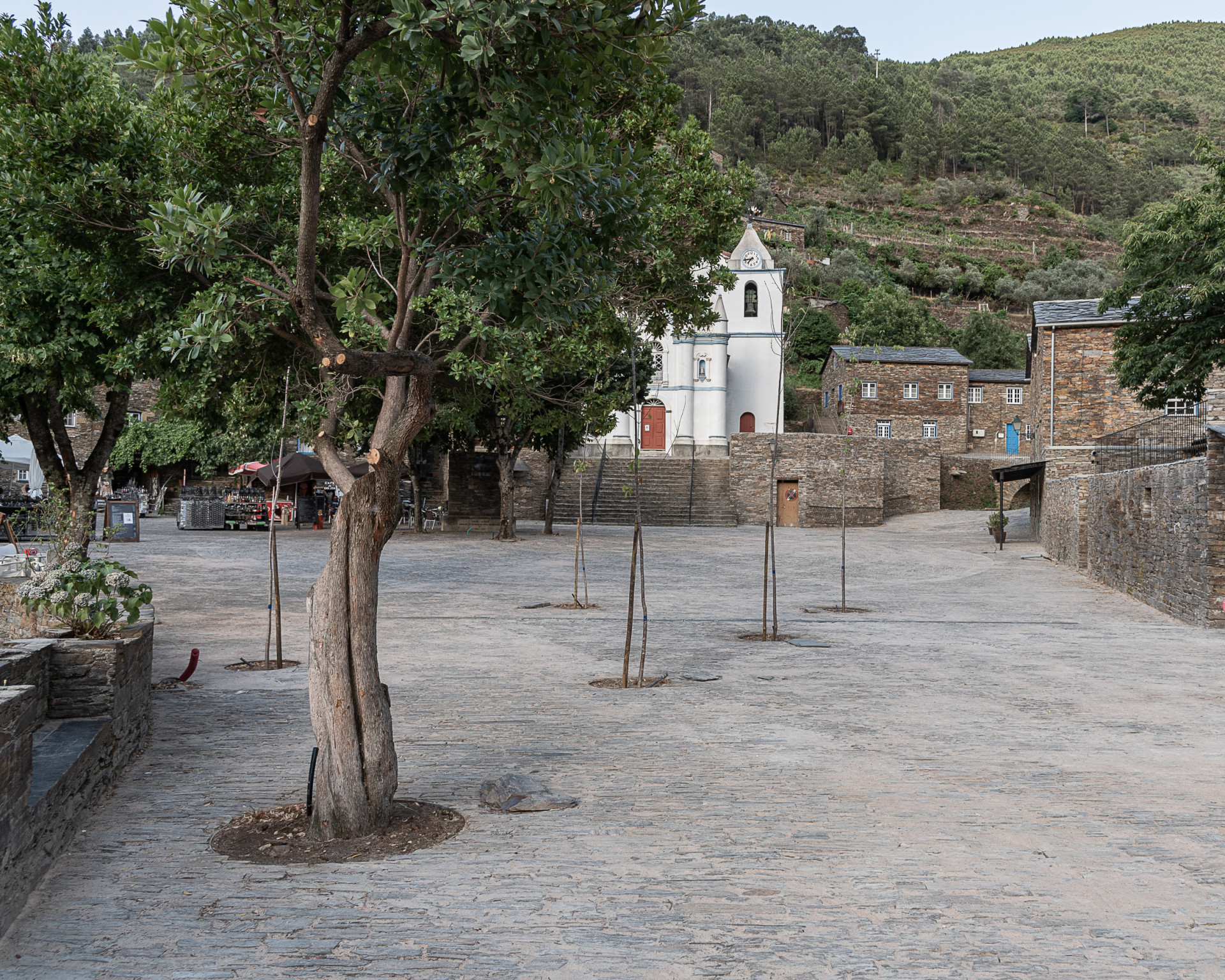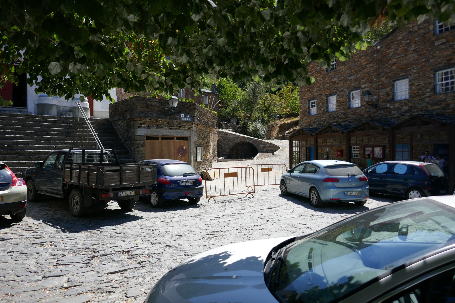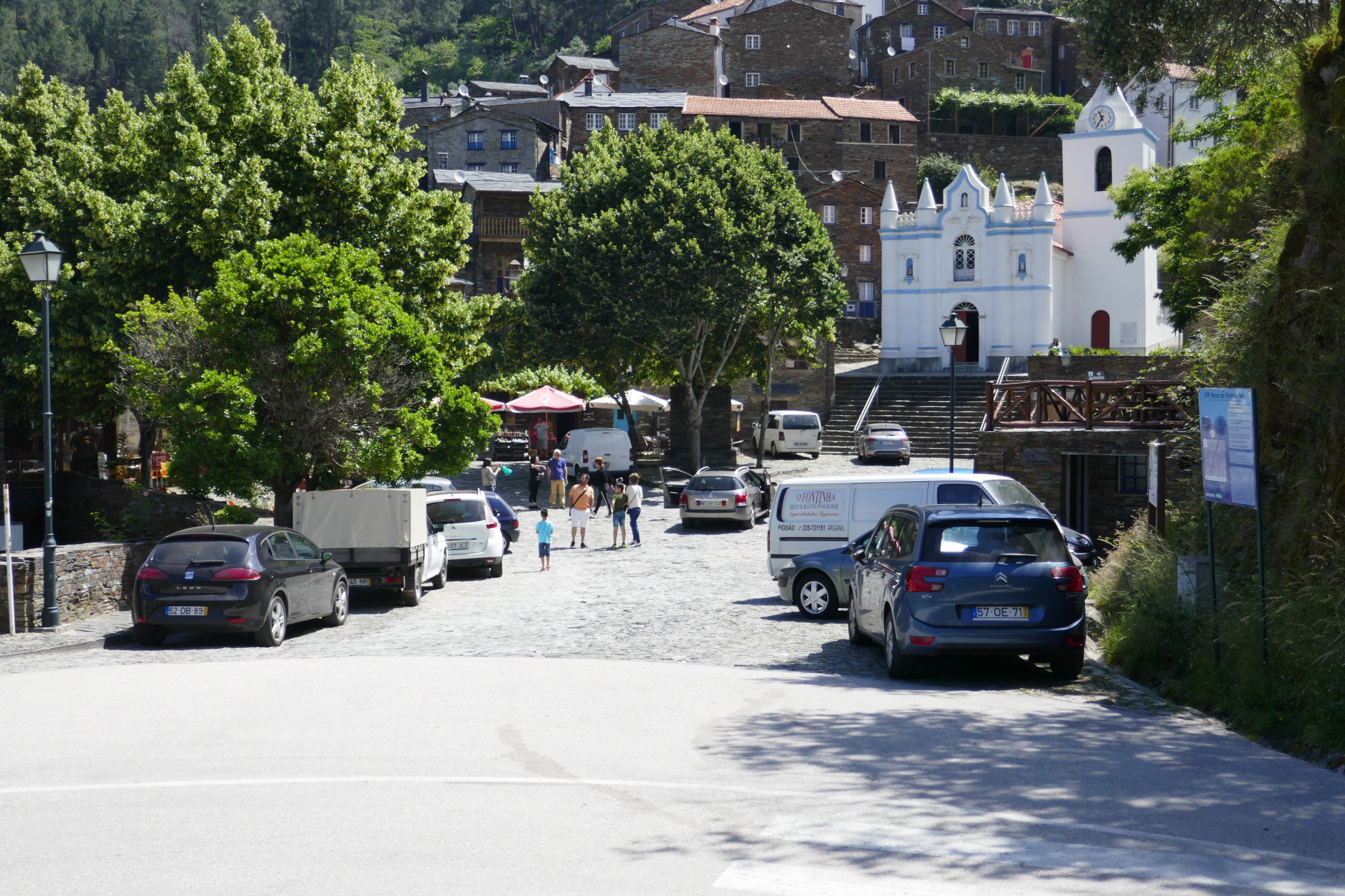 Než v roce 2020 odstartovala revitalizace návsi, byla parkovištěm. Ta blokovala dokonce schody ke kostelu – hlavní dominantě vesnice, ve které žije jen 120 obyvatel. Od pohledu je romantická, pohyb v ní je ale náročnější. Piódão totiž leží v horách, v prudkém svahu. Domy jsou tady na sebe nahuštěné, stojí na zpevněných terasách, vedle návsi tady už není žádná další rovina. O to důležitější bylo ji smysluplně využít. Vytvořit prostor, který bude funkčním centrem a káva se na něm bude dát vypít bez zápachu spalin z výfuků. Všechna auta dnes musejí zůstat před návsí, kde je pro ně vyhrazená parkovací plocha.