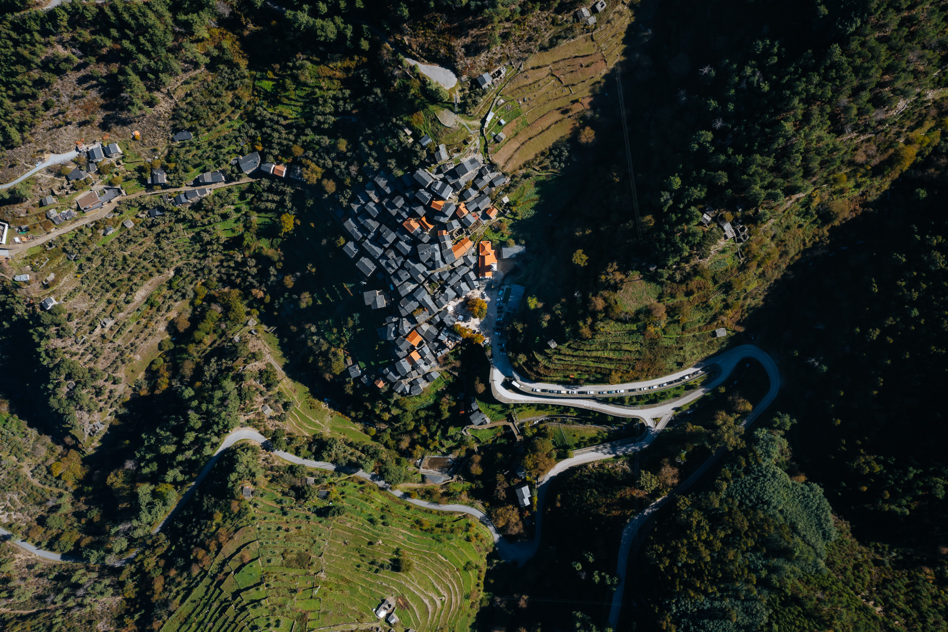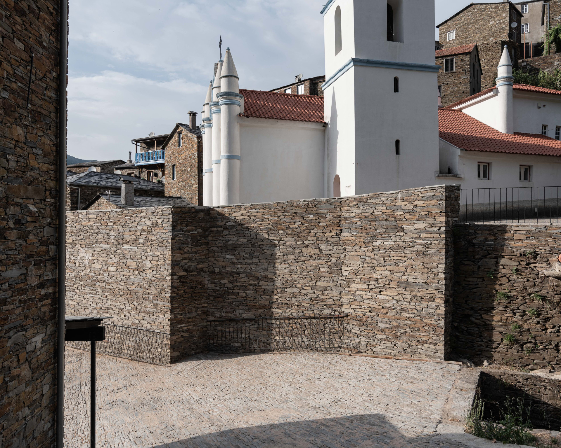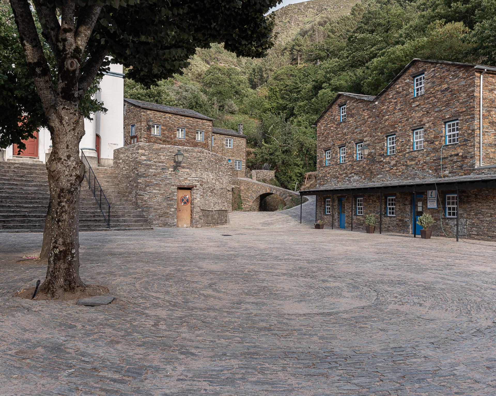 „Prostor byl vrácen jeho obyvatelům v návaznosti na jejich materiální a stavební kulturu,“ říkají architekti. V Piódão se staví hlavně z břidlice – domy z ní mají své obvodové zdivo, střechy, jsou ní vydlážděné chodníky. A z břidlice je teď i nová náves. Její nepravidelný tvar usměrňuje svou strukturou, stáčí se do kruhu, v jehož středu dál rostou původní stromy a stojí pomník s bustou místního faráře z 19. století.