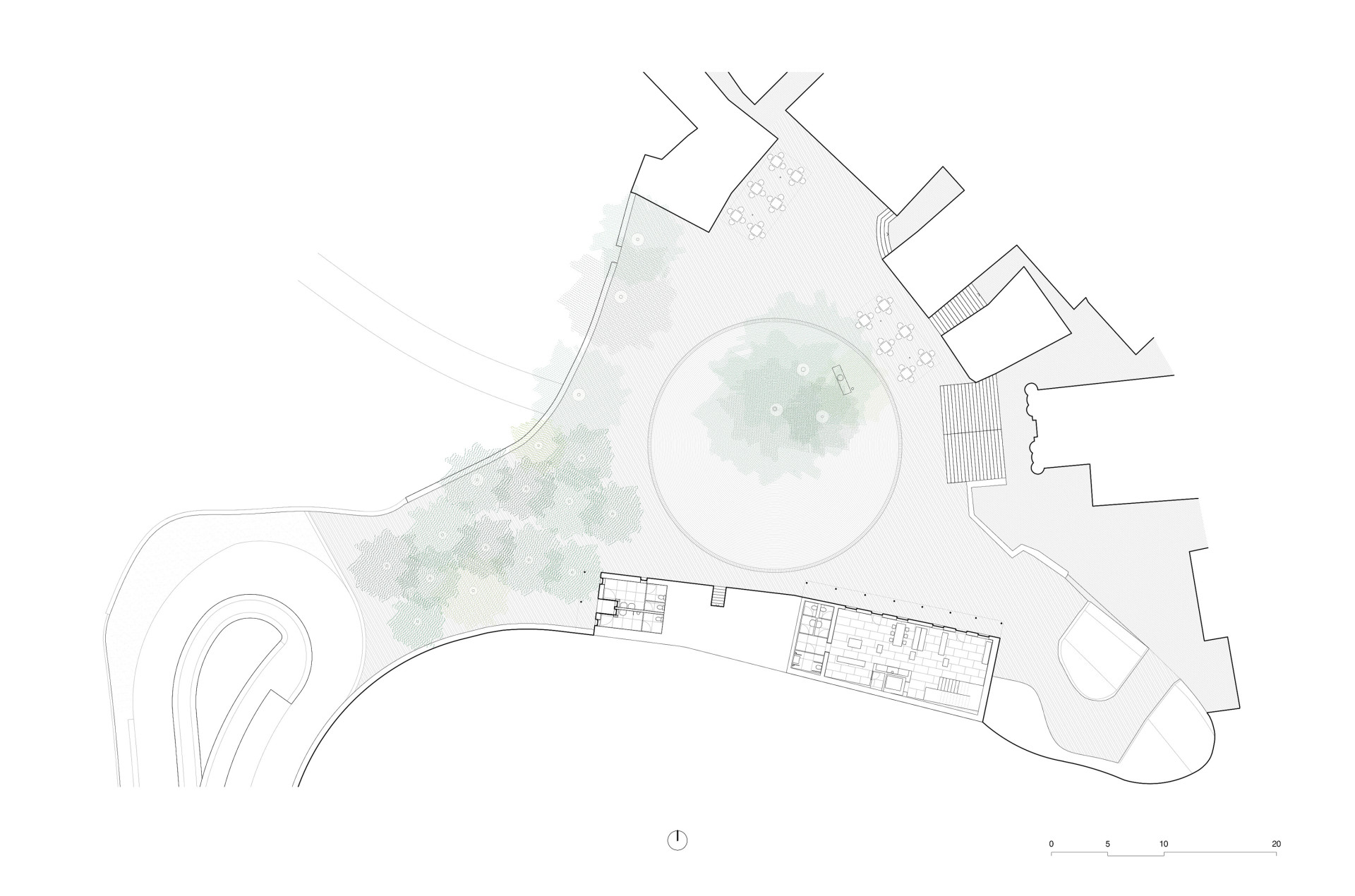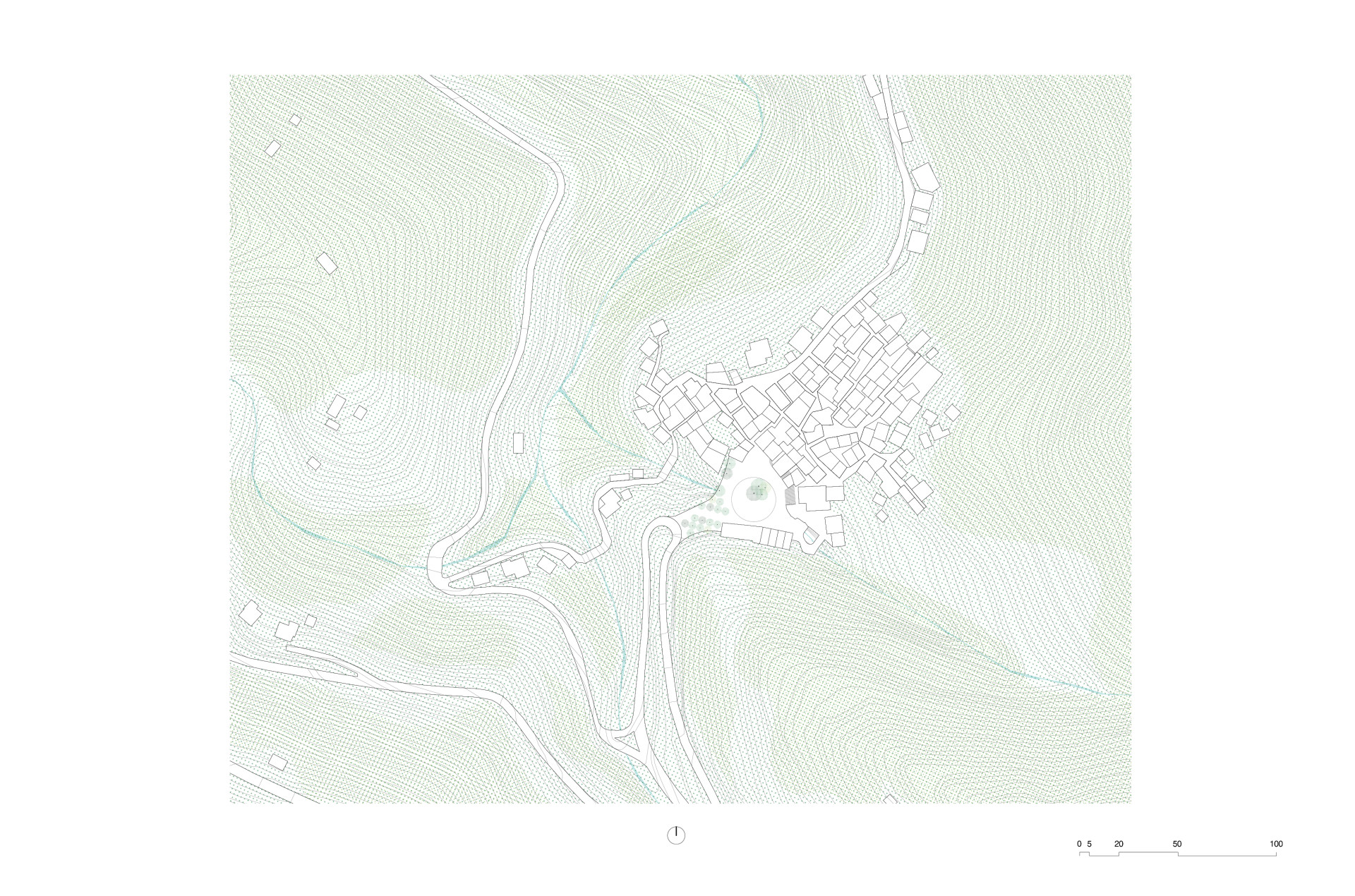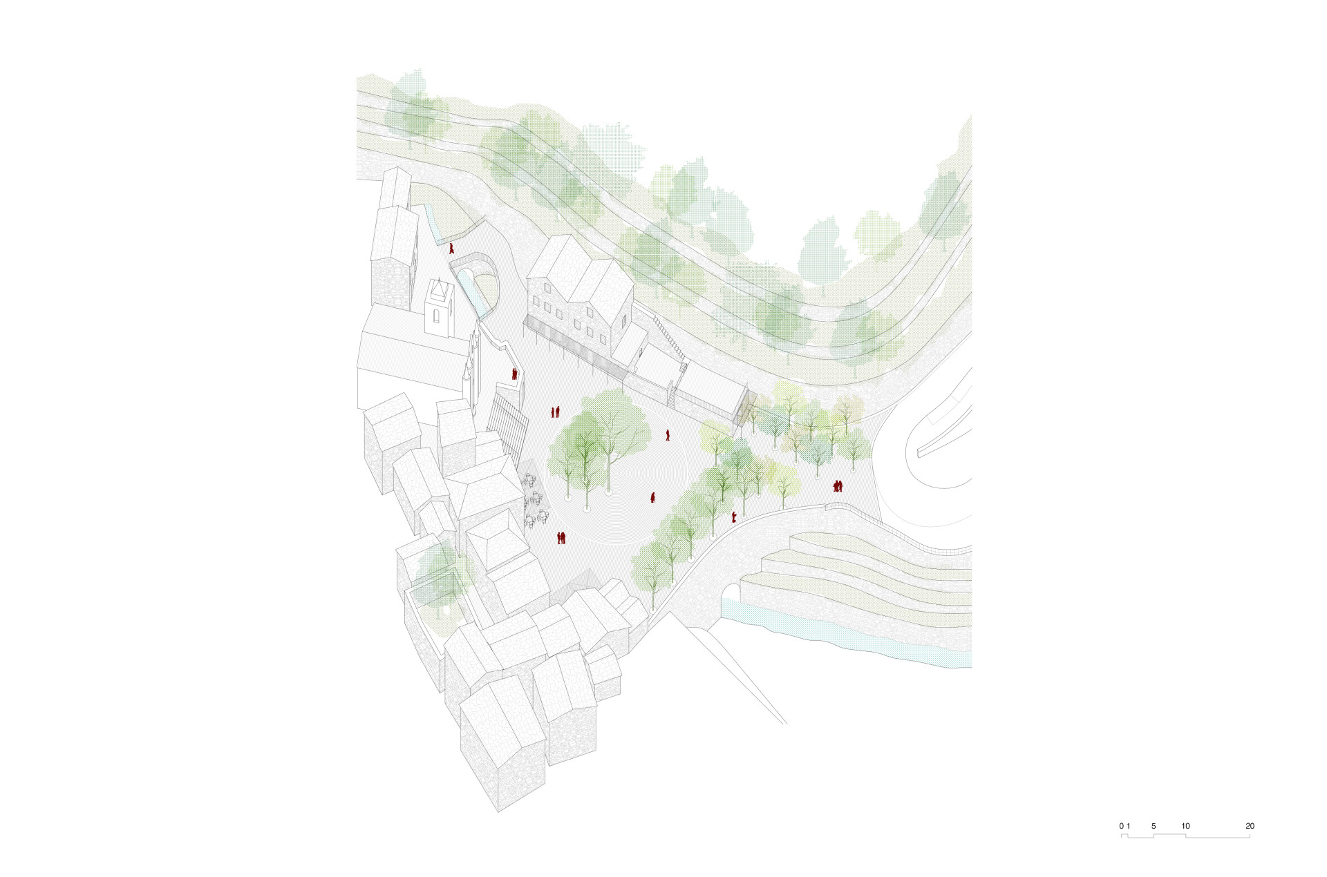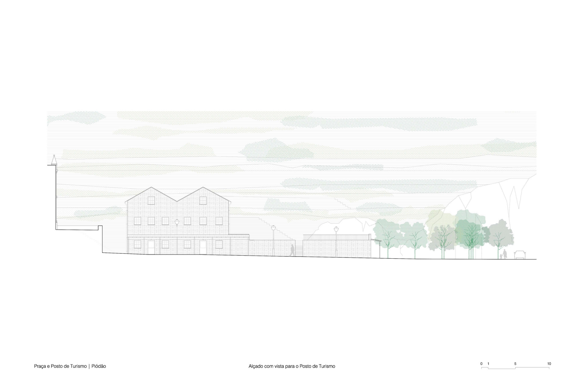 „Prostor byl vrácen jeho obyvatelům v návaznosti na jejich materiální a stavební kulturu,“ říkají architekti. V Piódão se staví hlavně z břidlice – domy z ní mají své obvodové zdivo, střechy, jsou ní vydlážděné chodníky. A z břidlice je teď i nová náves. Její nepravidelný tvar usměrňuje svou strukturou, stáčí se do kruhu, v jehož středu dál rostou původní stromy a stojí pomník s bustou místního faráře z 19. století.
