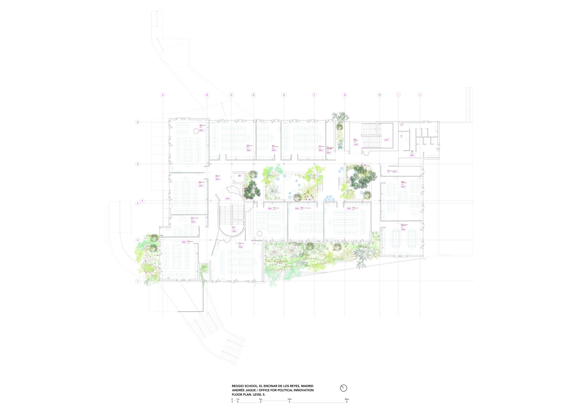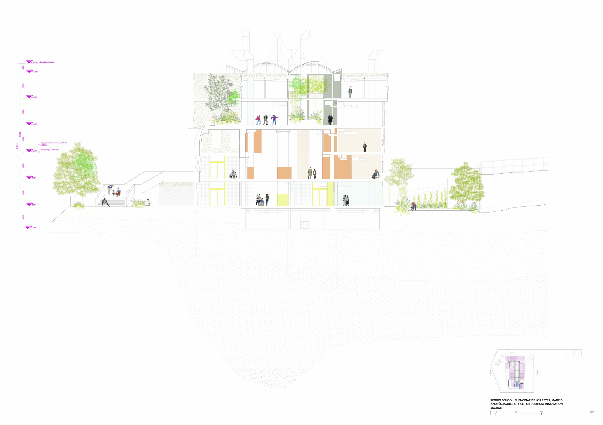 Nyní je „reggio“ vzdělávání opět v kurzu a v Madridu stojí nová reggio škola. A také ta vznikla pospojováním všech možných starých i nových elementů. Odhaluje kabely a potrubí, takže působí jako nahá. Namísto školního pozemku má několik menších zahrádek uvnitř. Je propojena s veřejným parkem Valdebebas a počítá se s tím, že část vyučování se bude odehrávat také tam. Tahle budova je prostě zvláštní, fascinující, budí otázky a má to být „další učitel dětí“. Tak si to přáli zadavatelé a tak to pojali architekti ze studia Office for Political Innovation.