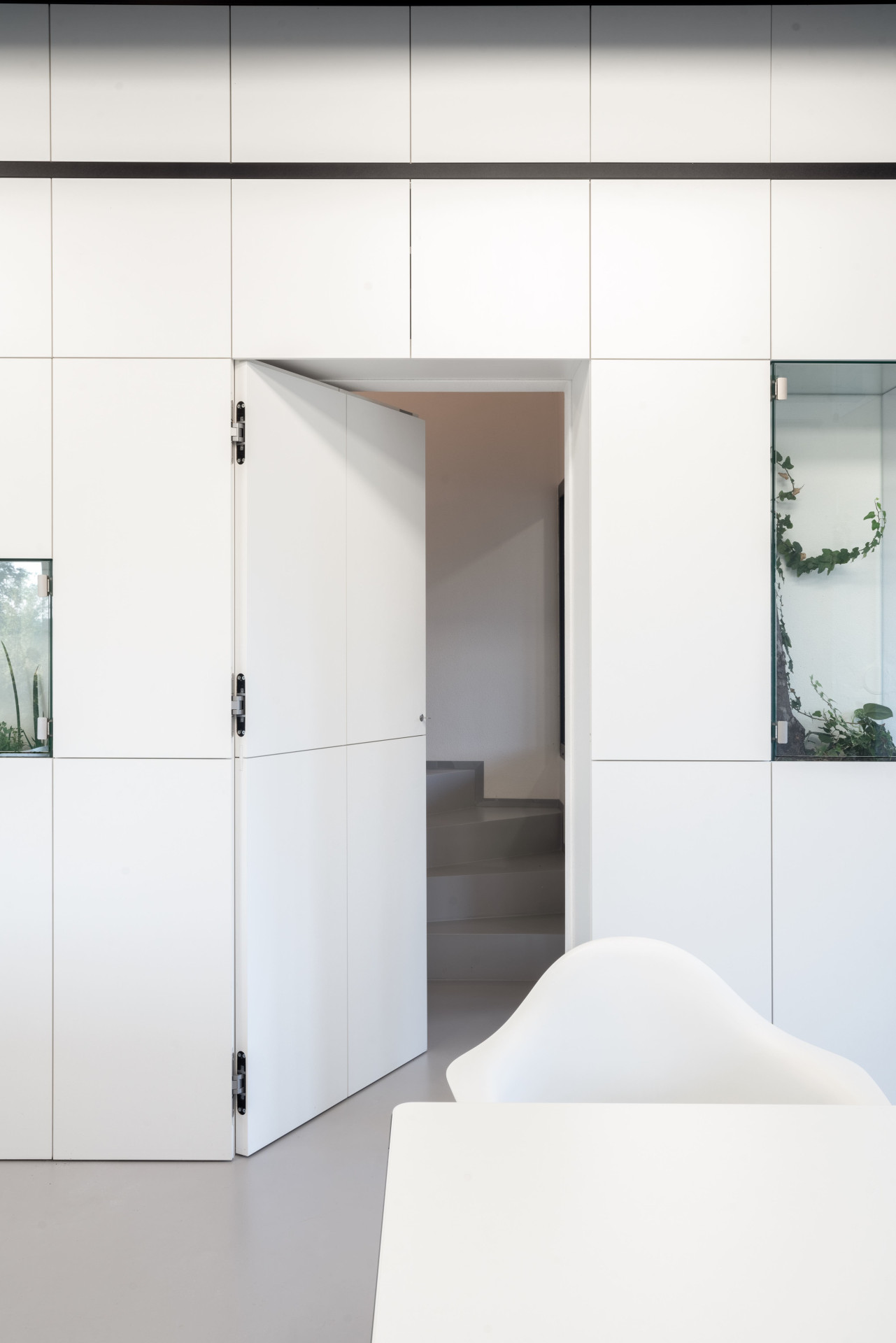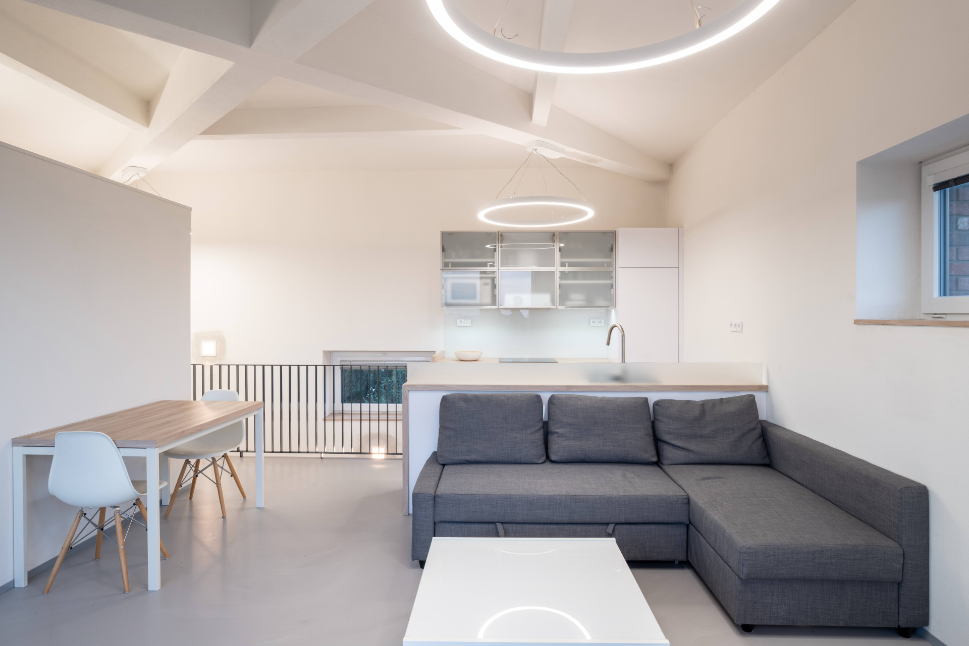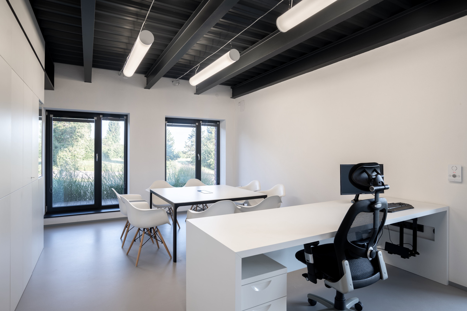 Pokud jde o interiéry, kanceláře vynikají minimalistickým řešením s čistými bílými plochami, které kontrastují s přiznanými ocelovými stropními nosníky a tmavým vlnitým plechem – tedy prvky, které zpřítomňují technický charakter objektu. Interiér bytu pak doplňuje dřevo pro zútulnění prostoru.