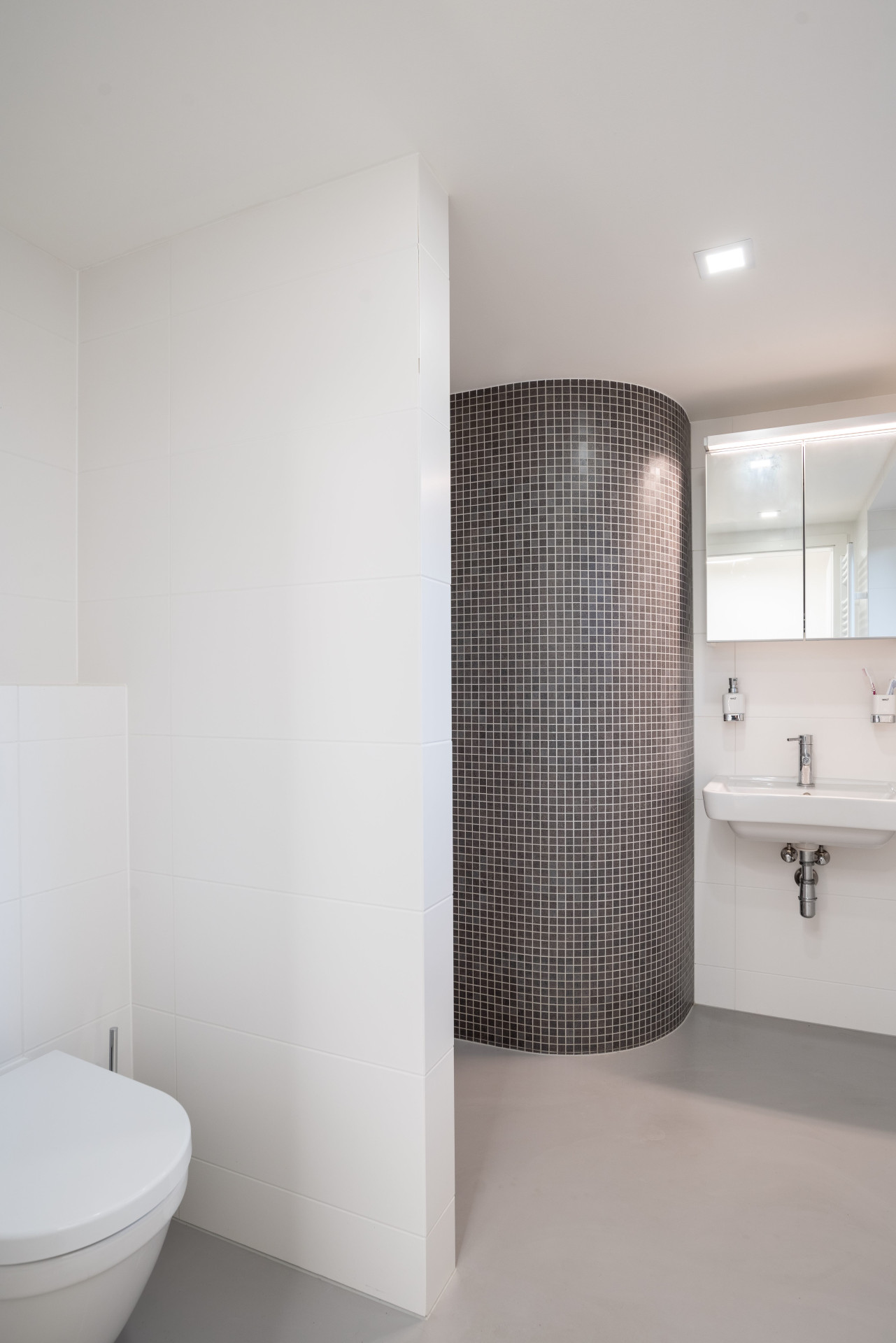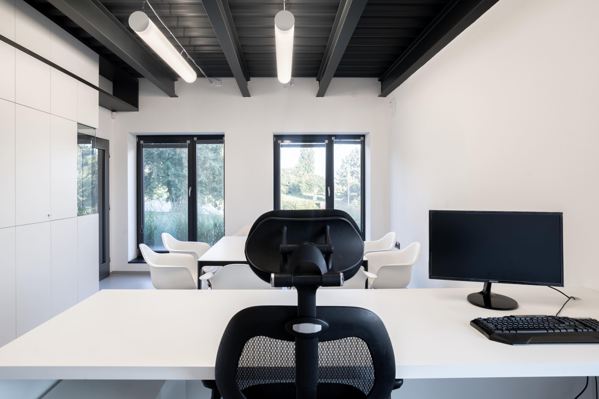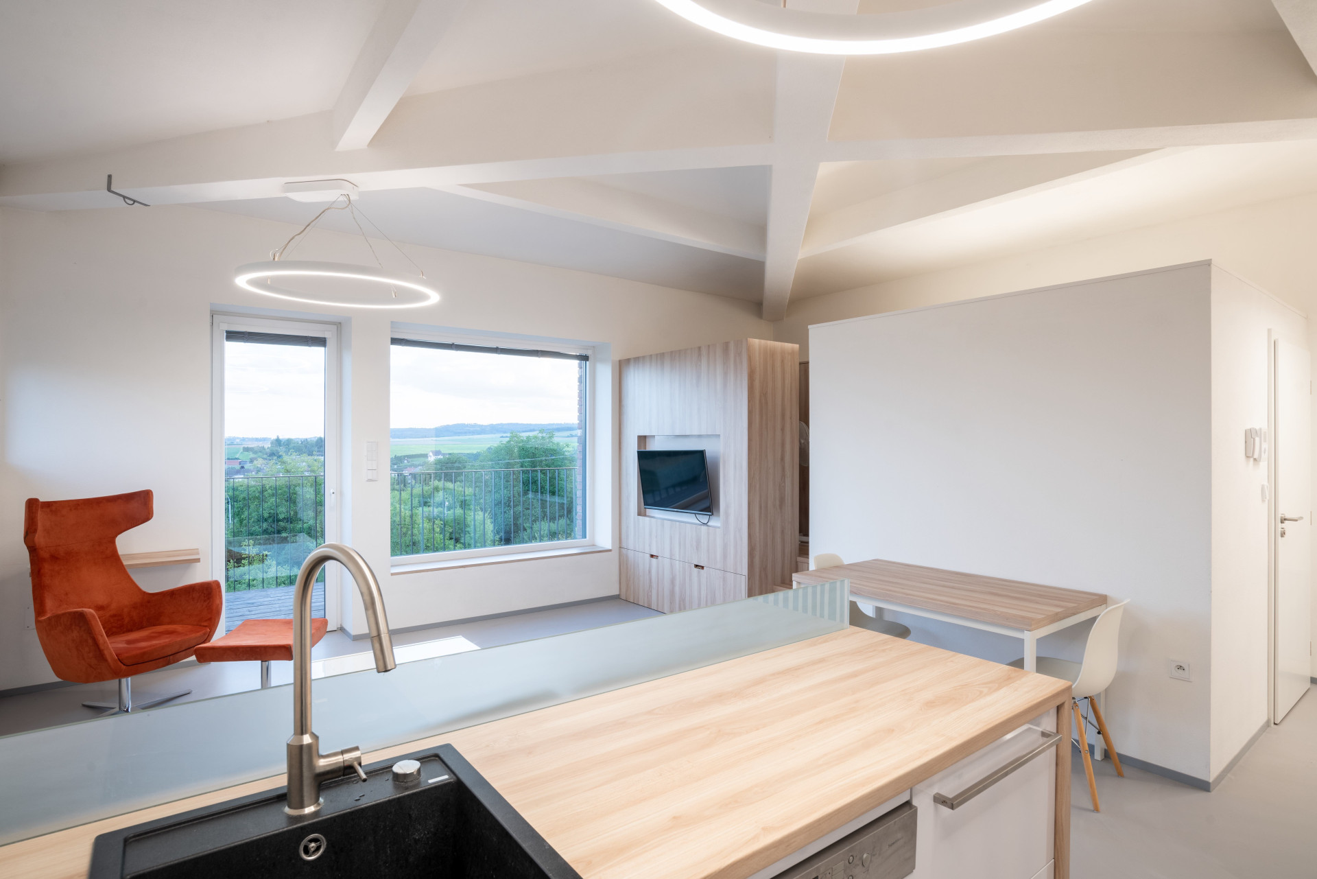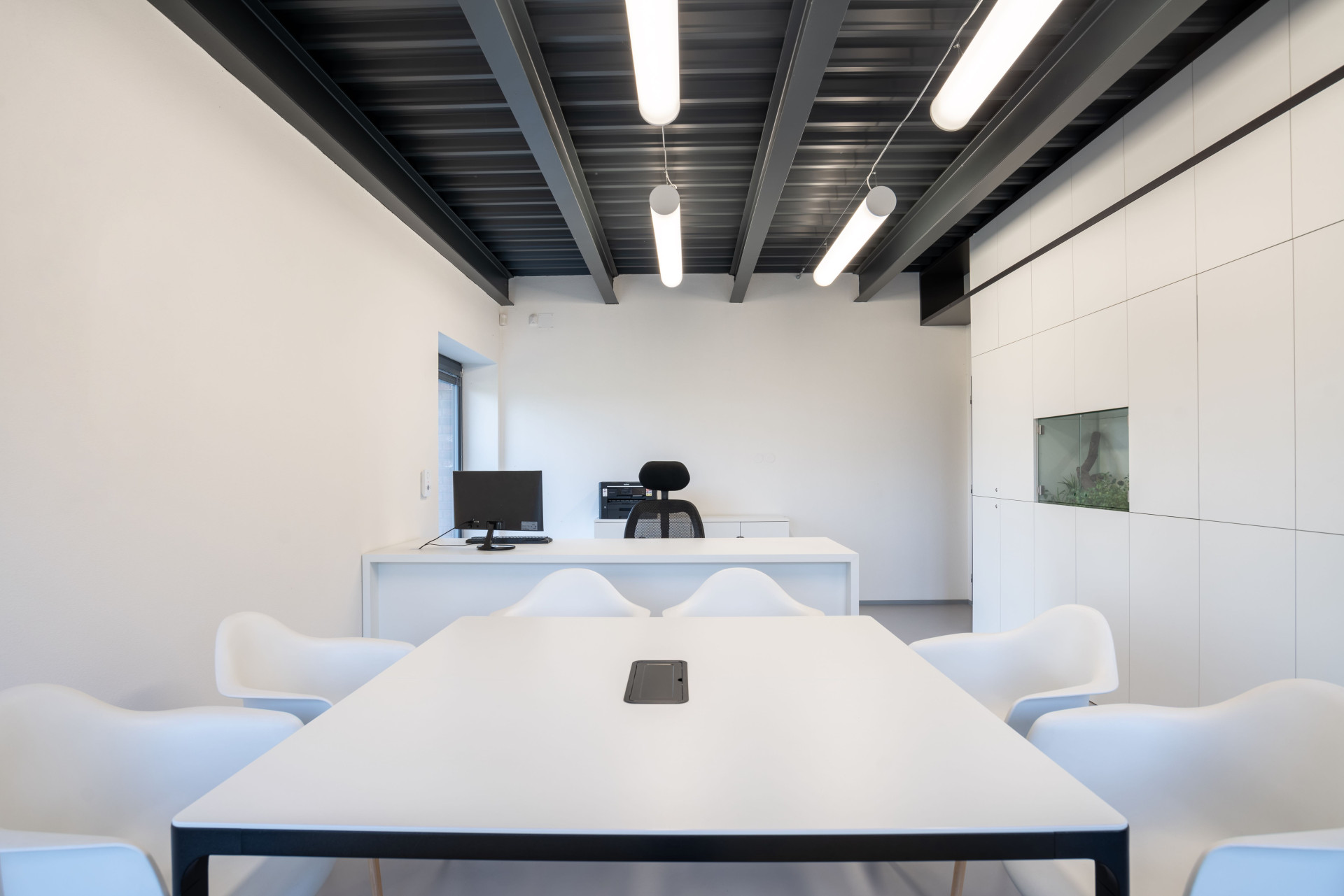 Pokud jde o interiéry, kanceláře vynikají minimalistickým řešením s čistými bílými plochami, které kontrastují s přiznanými ocelovými stropními nosníky a tmavým vlnitým plechem – tedy prvky, které zpřítomňují technický charakter objektu. Interiér bytu pak doplňuje dřevo pro zútulnění prostoru.
